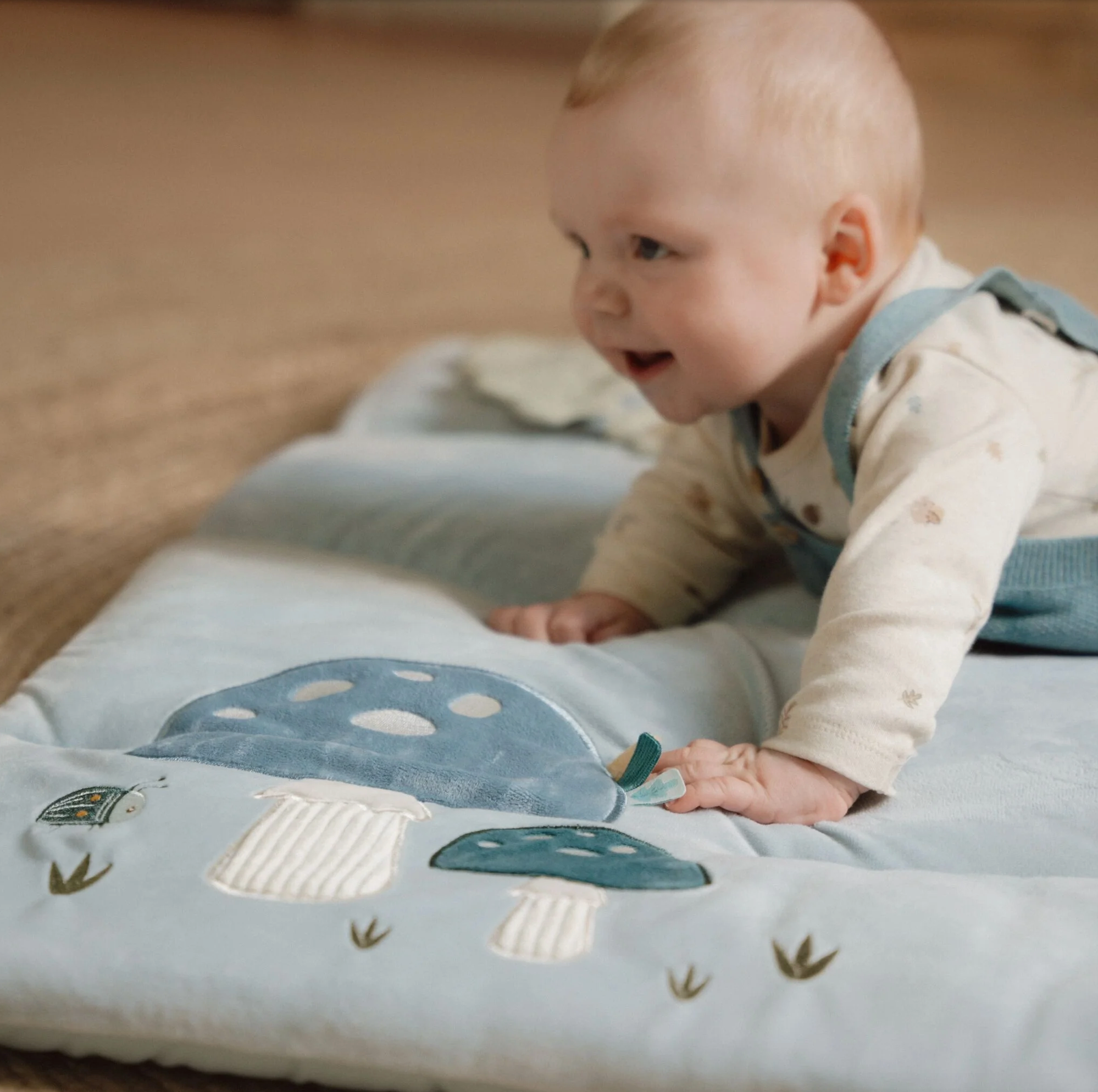 À 3 mois, bébé découvre les sons et les couleurs. Il développe ses muscles et apprend à les maîtriser. Bébé est de plus en plus dynamique, il réussit à se soulever et peut-être même se tourner pour se mettre sur le dos ou sur le ventre. Le tapis d'éveil est idéal à cet âge. Il tient de mieux en mieux sa tête, commence à appréhender le monde, commence à babiller... Il commence aussi à vouloir attraper les objets et adore les porter à sa bouche. Il se familiarise avec des sensations tactiles et permet de parfaire sa motricité en touchant. Il examine ses orteils, ses pieds, ses doigts, sa bouche, les objets... Bébé tente de deviner ce qu'il peut faire avec.