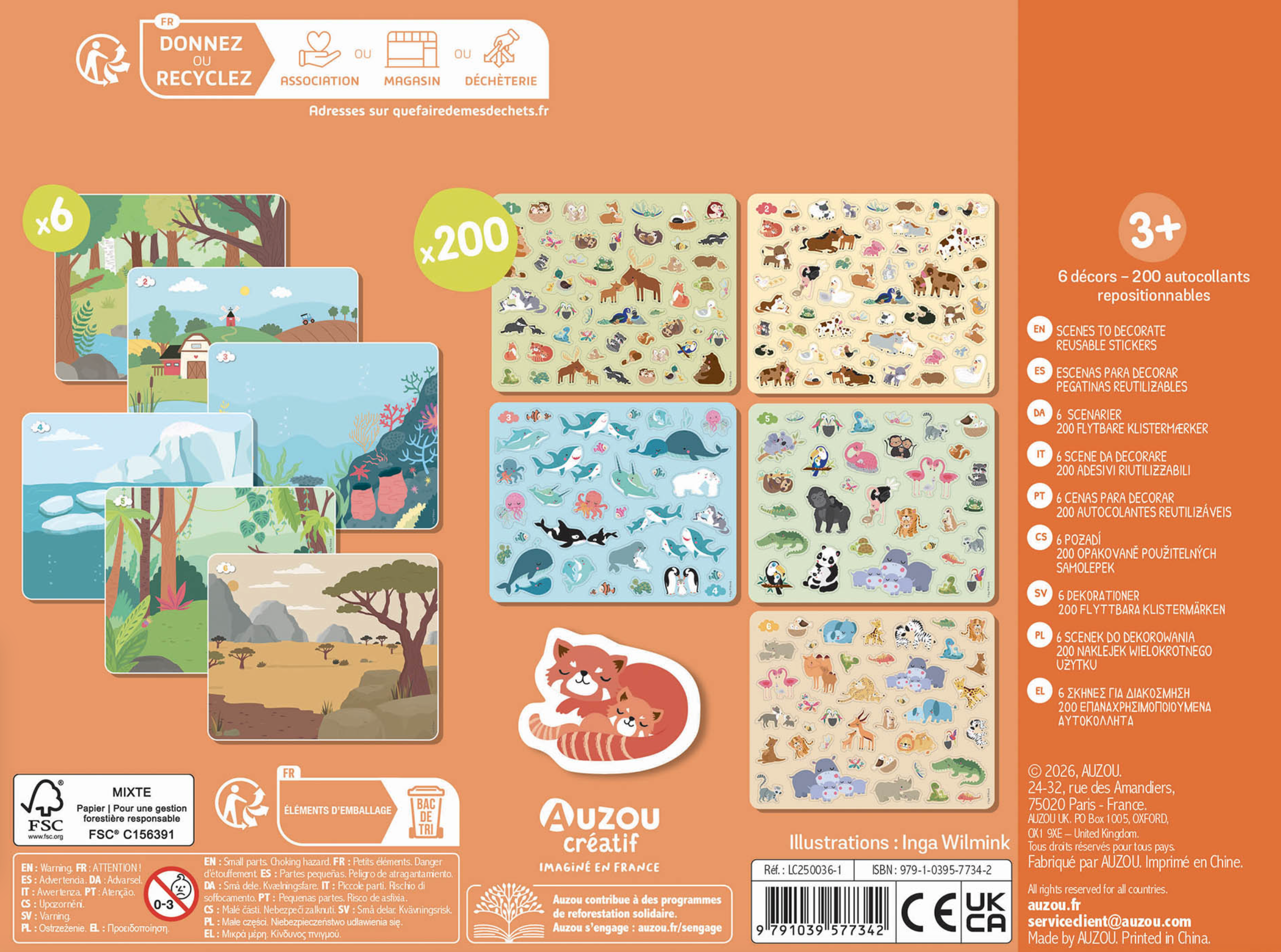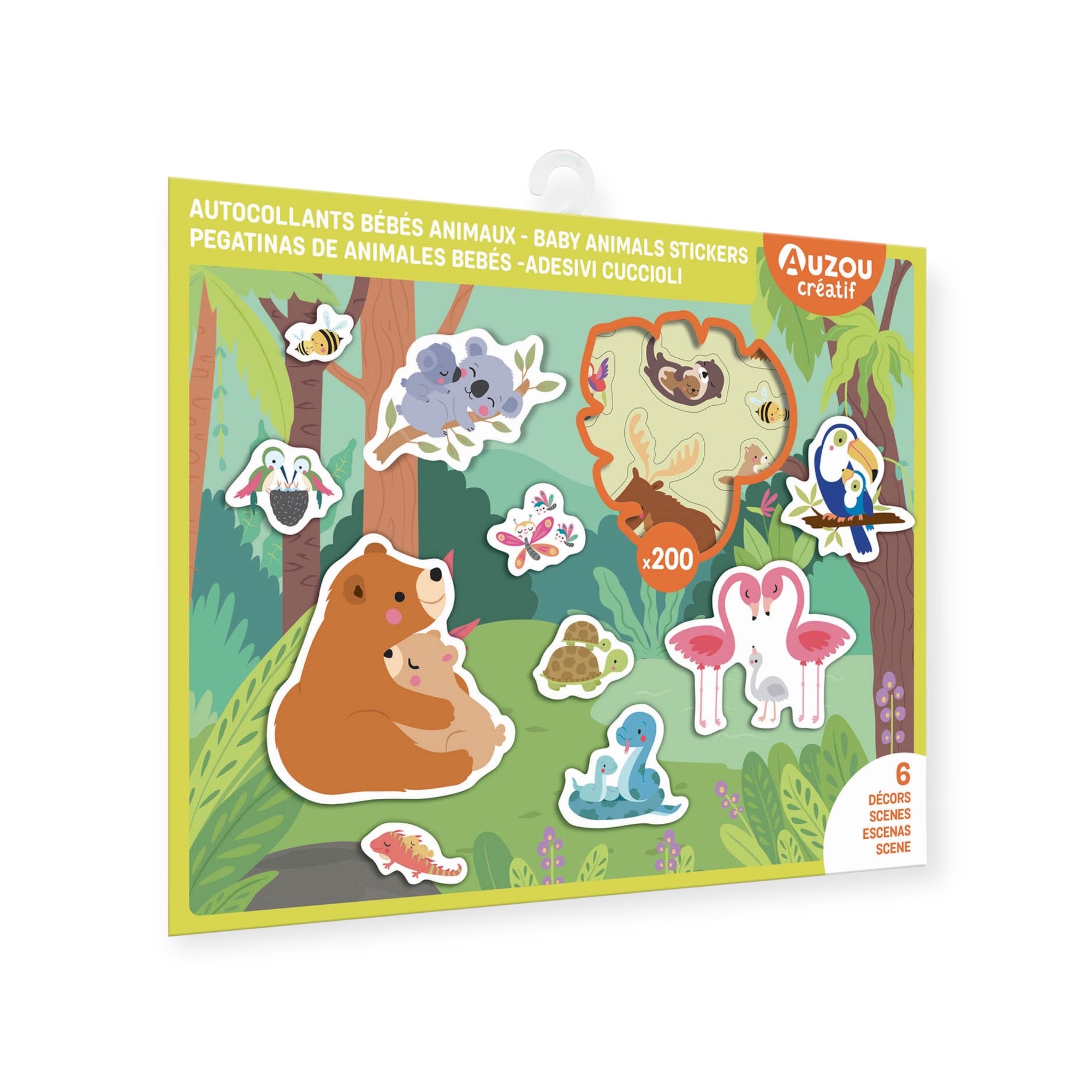 5 planches d'autocollants et 6 décors pour développer l'imagination, la créativité et la motricité fine de votre mini grâce à 200 gommettes de bébés animaux.