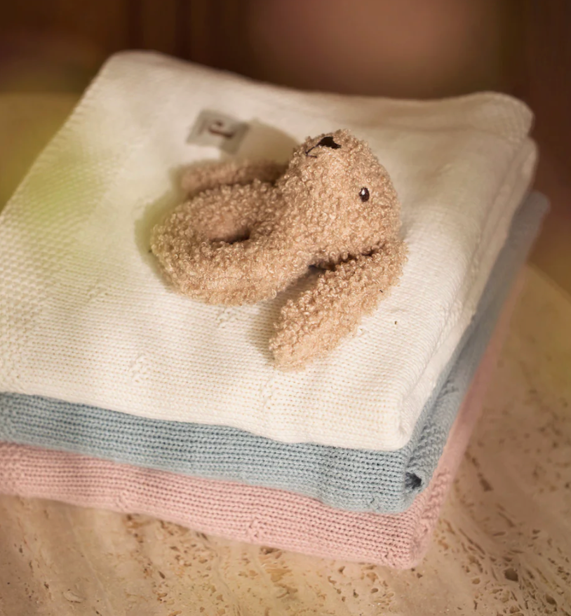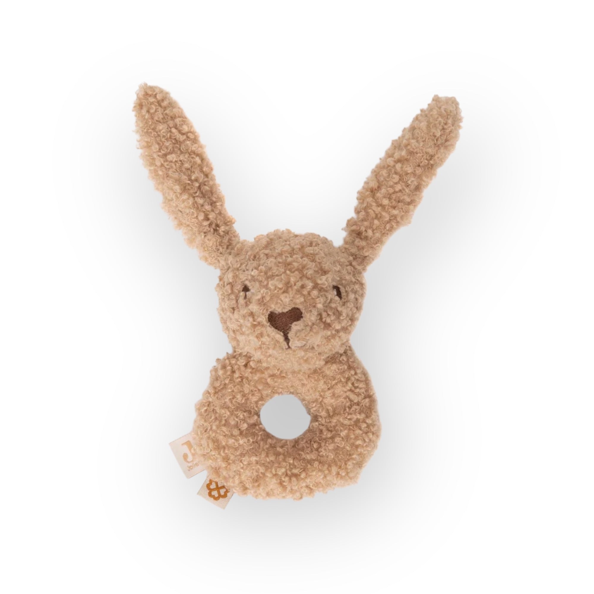 Un adorable anneau de dentitionlapin en tissu bouclé qui contient un petit grelot pour amuser bébé quand il bouge le hochet.