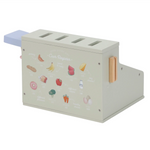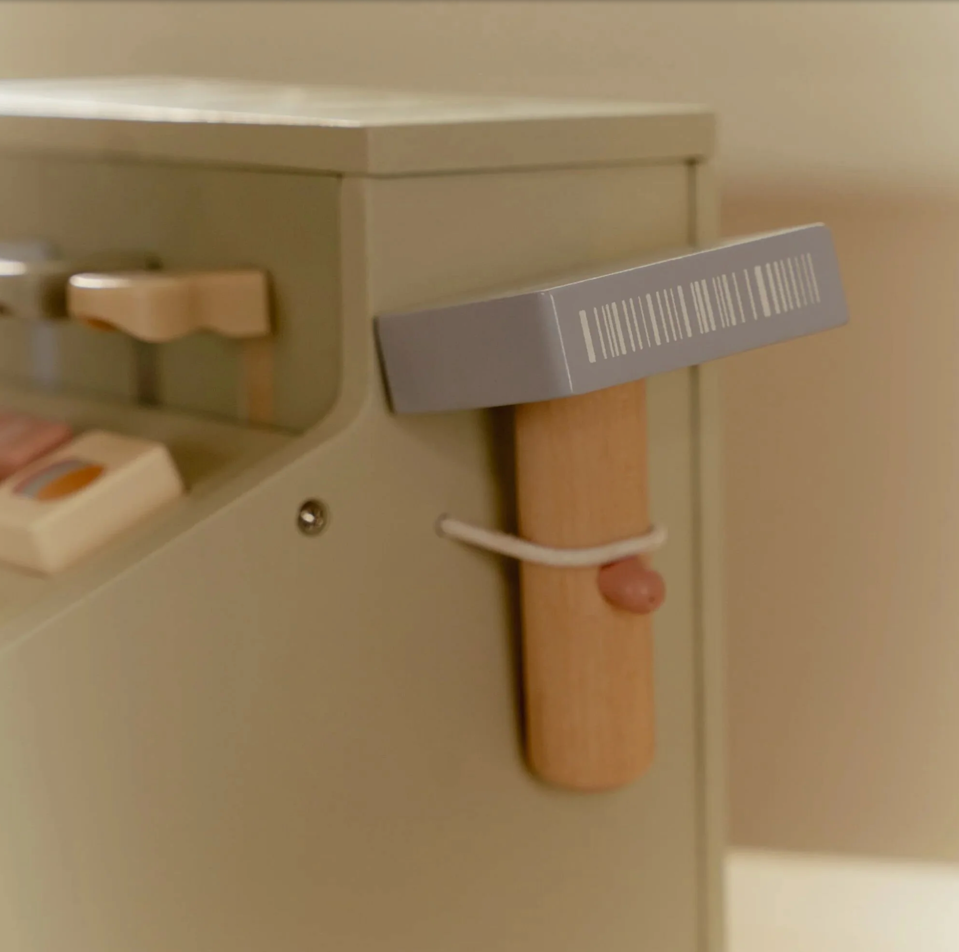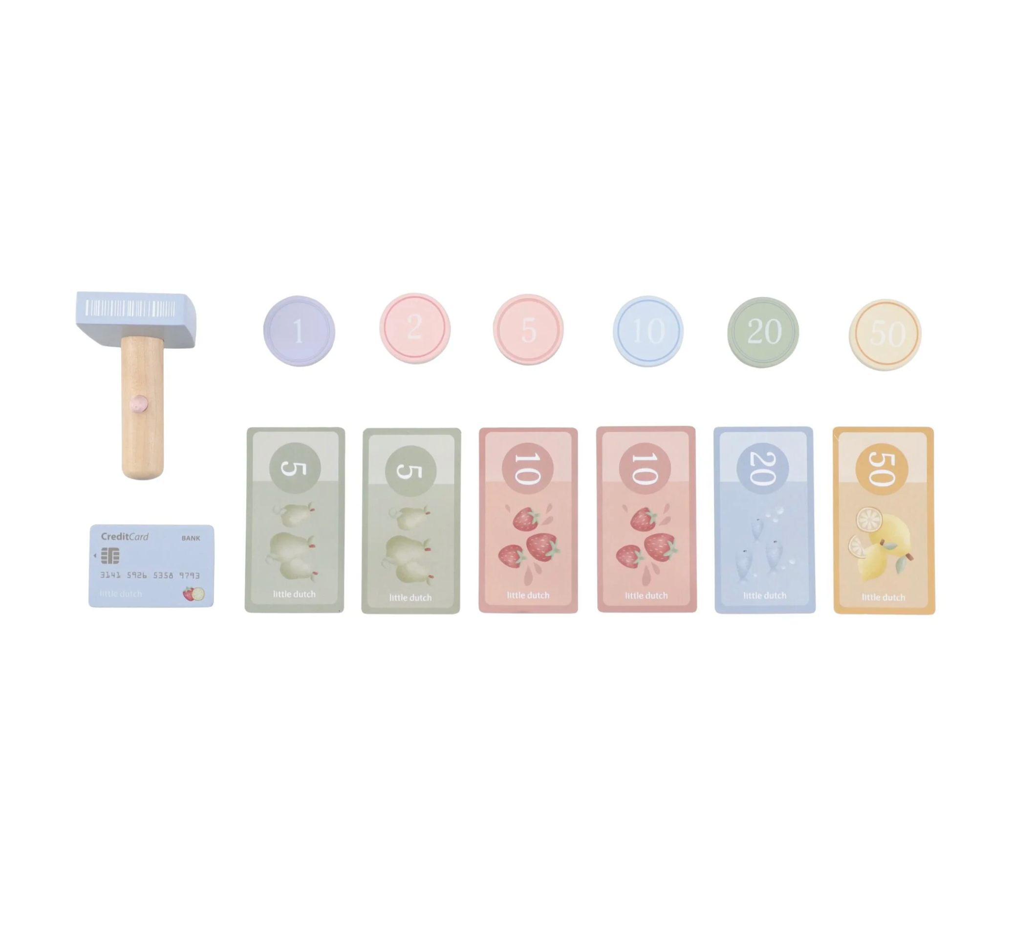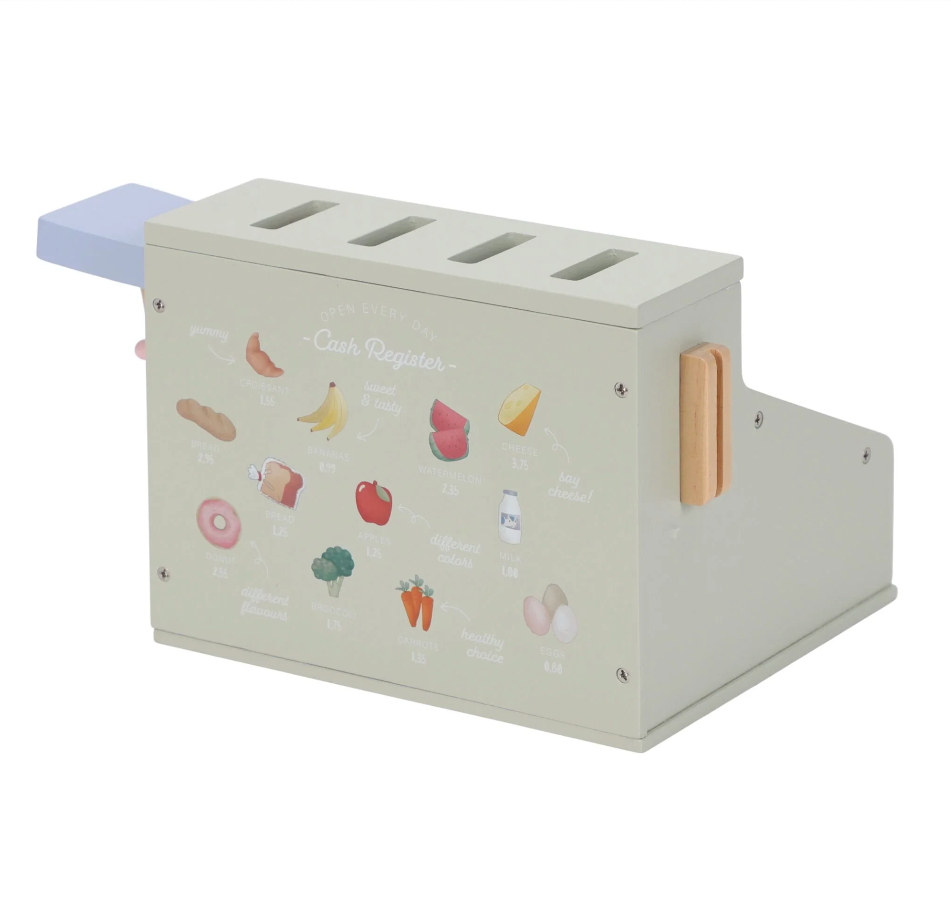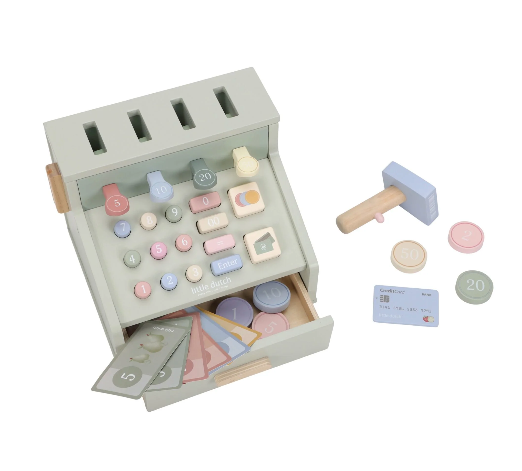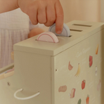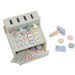 Calculez, scannez et payez ! Avec cette caisse enregistreuse en bois, jouer au magasin semble encore plus réel. La caisse enregistreuse est équipée d'un scanner, d'un lecteur de carte de débit, de boutons et d'un tiroir-caisse pour les pièces et les billets. Une carte de débit est également incluse, afin que les clients puissent payer en espèces et par carte. Une façon fantastique de jouer avec de l'argent et des chiffres. Qu'est-ce que ça peut être aujourd'hui ?