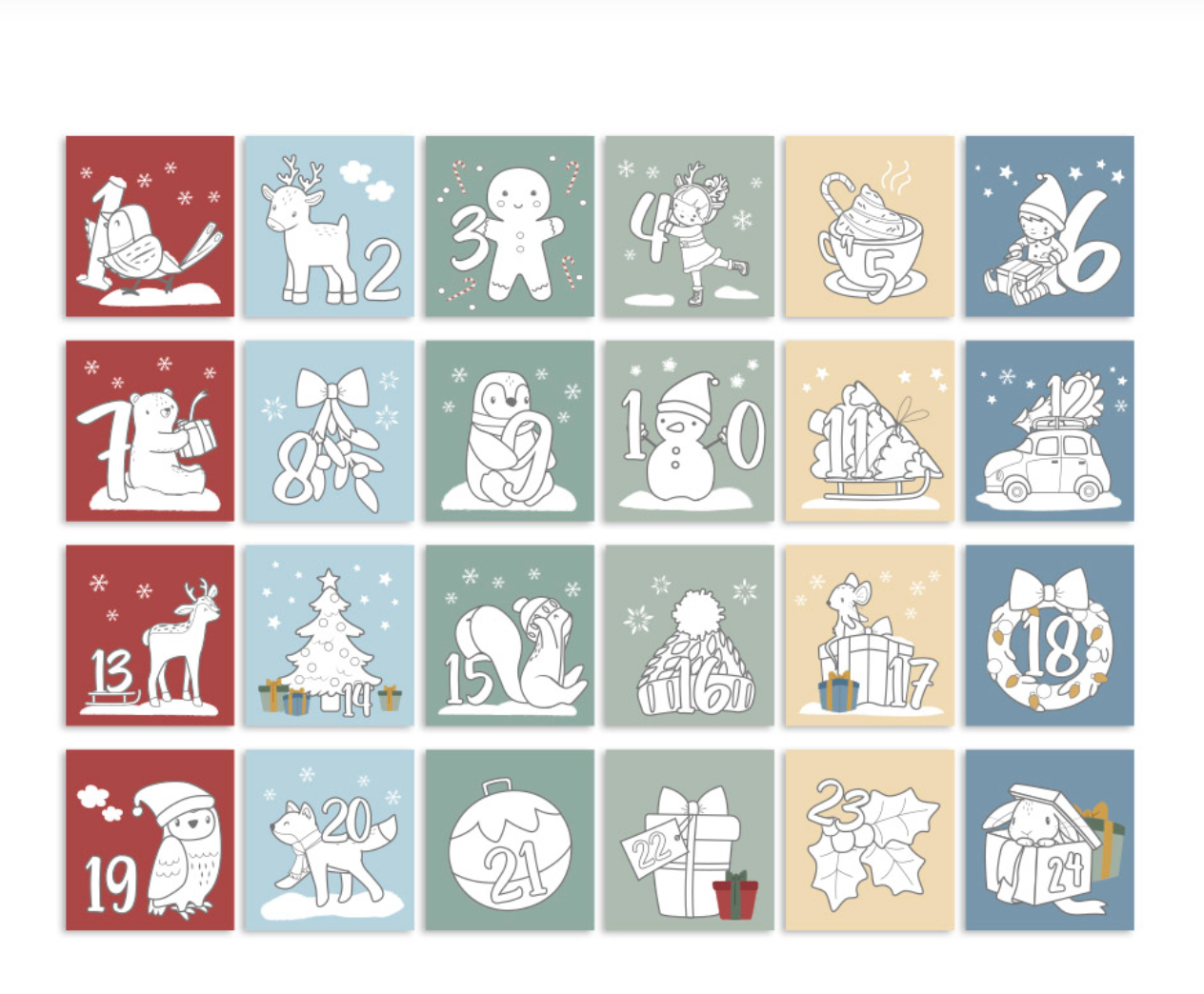 Rendez le compte à rebours jusqu'à Noël encore plus amusant avec ce calendrier de l'Avent de Noël ! Ce calendrier joyeux contient 24 coloriages uniques. Que ce soit un Père Noël mignon, un sapin de Noël scintillant ou un bonhomme de neige convivial, chaque coloriage apporte du plaisir et contribue à l'ambiance festive. Placez-le dans un endroit spécial et profitez avec votre mini de ses magnifiques créations en cette période magique de l'année.