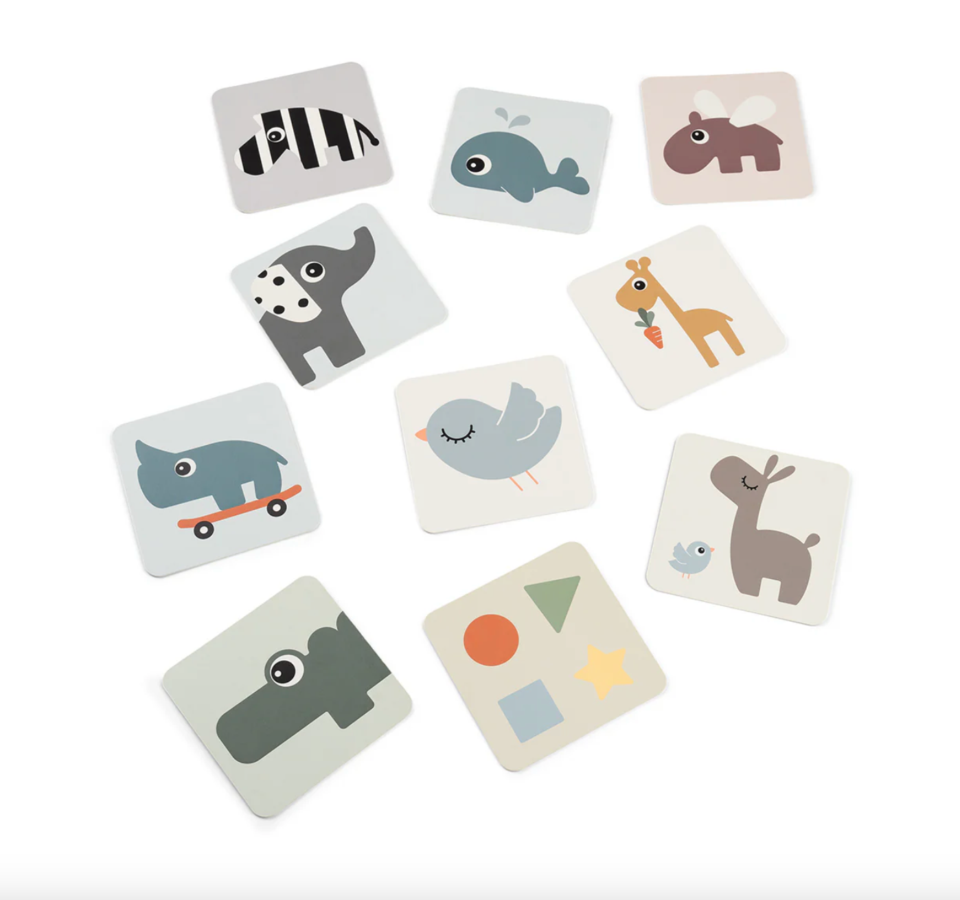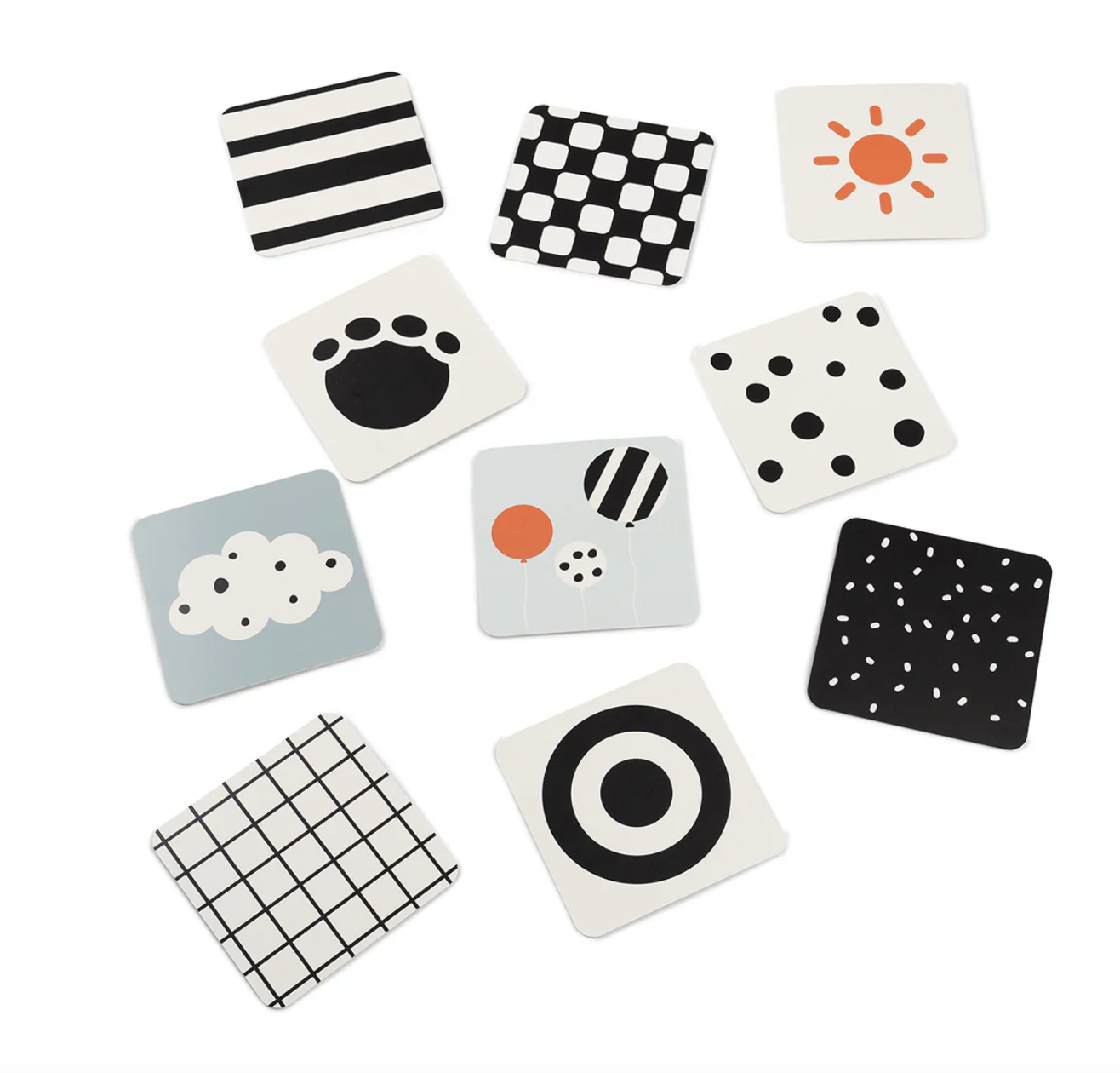 Un lot de 10 cartes pour stimuler le développement visuel de bébé. Recommandées dès la naissance, ces cartes présentent des couleurs douces et des contrastes clairs en noir et blanc pour la stimulation visuelle.