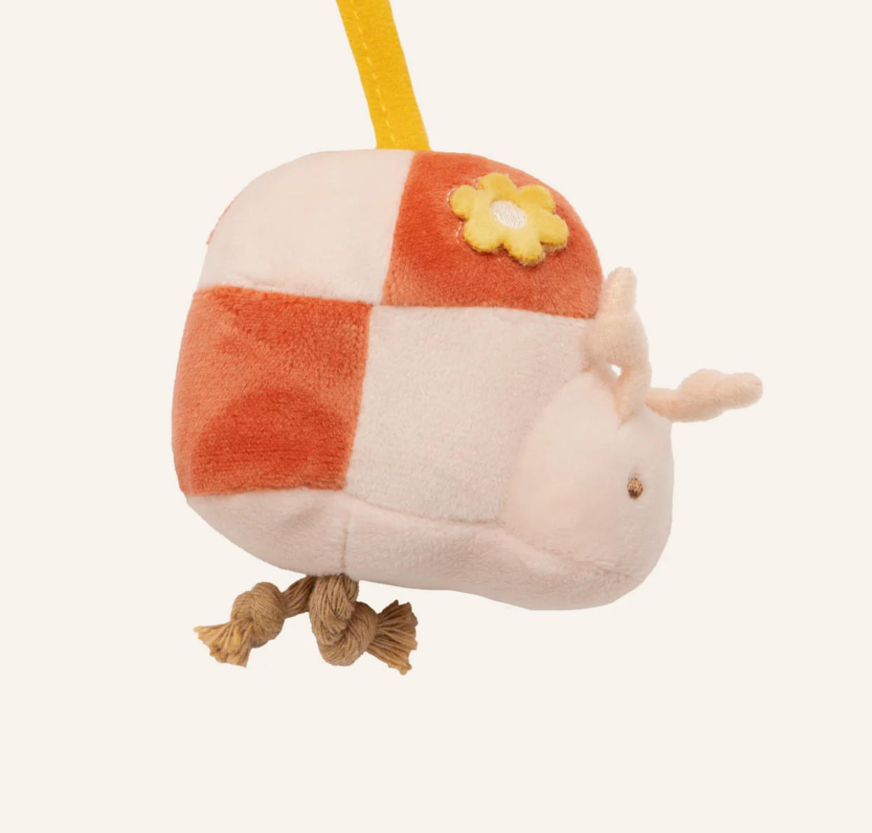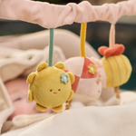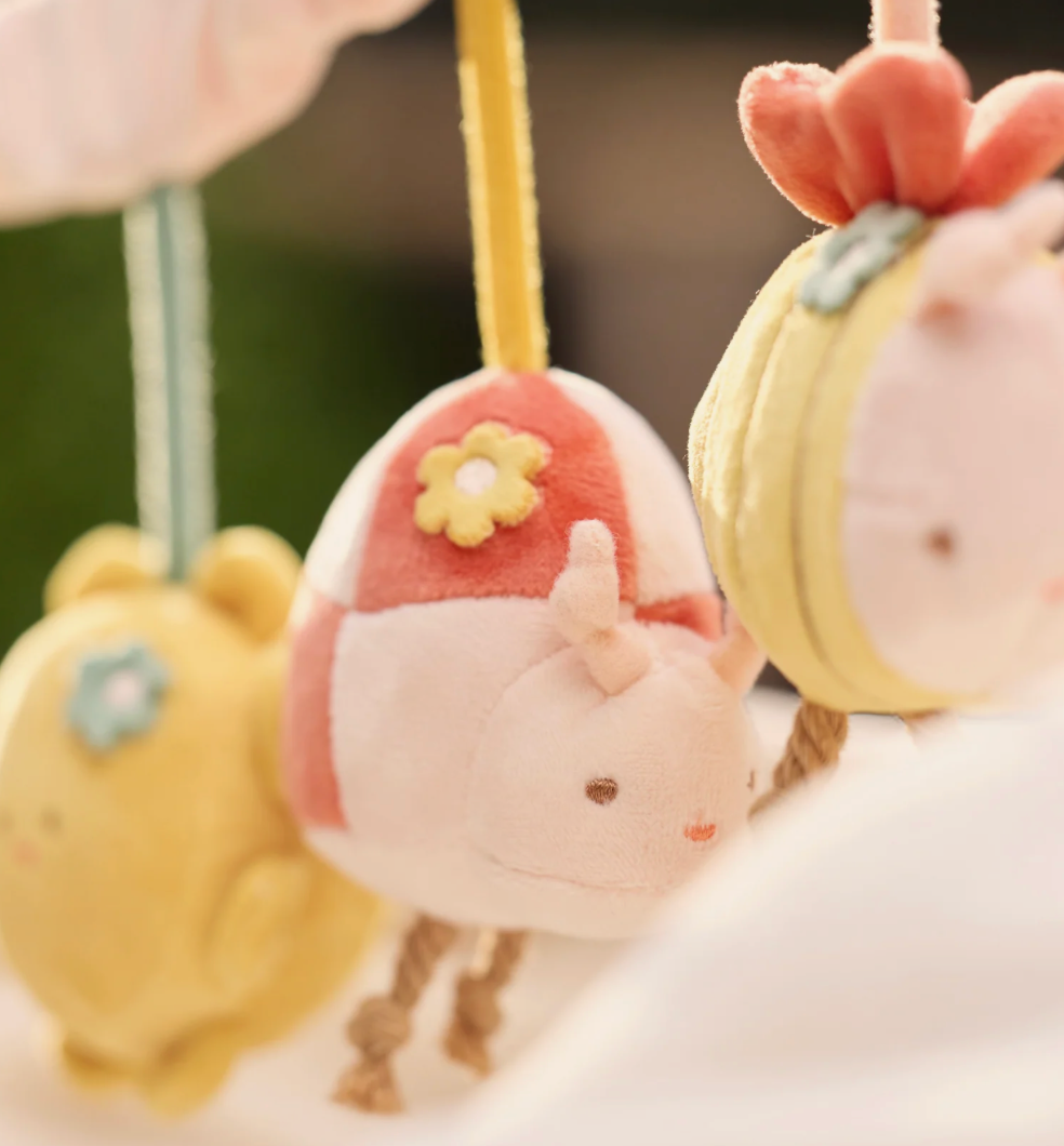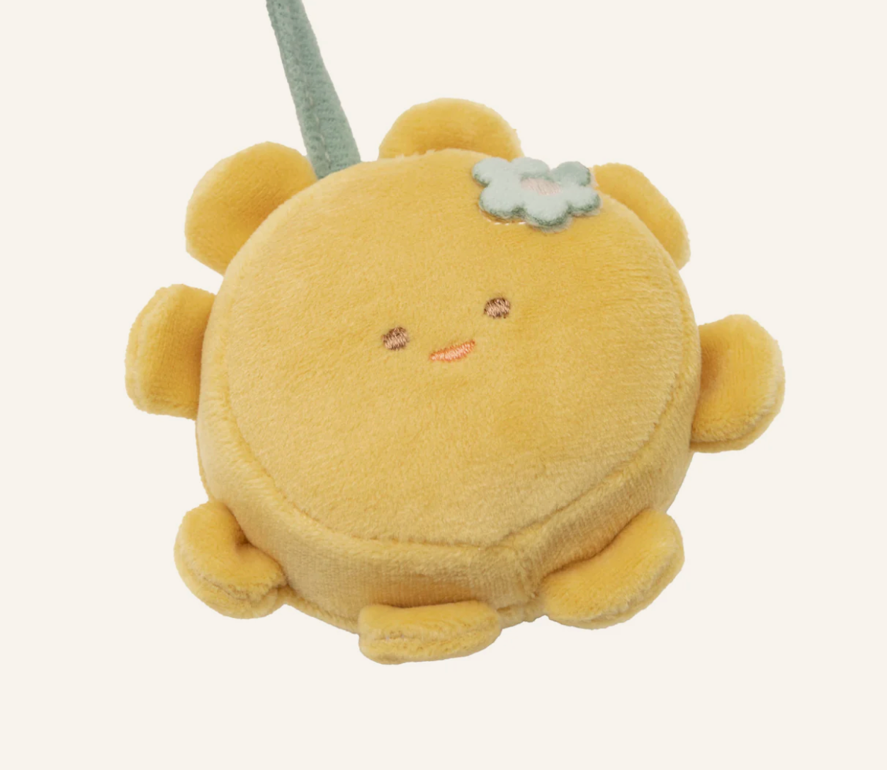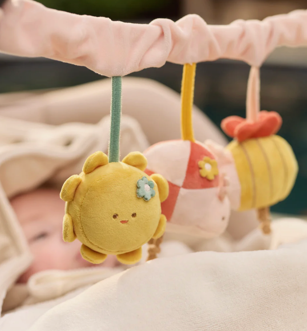 Cette chaîne d'activités est le compagnon de jeu idéal pour les trajets ! Le soleil est équipé d’un petit miroir pour que votre mini puisse se découvrir, l’abeille produit un amusant bruit croustillant et la coccinelle contient une douce clochette. Ensemble, ils offrent un plaisir visuel et sonore infini à chaque déplacement !