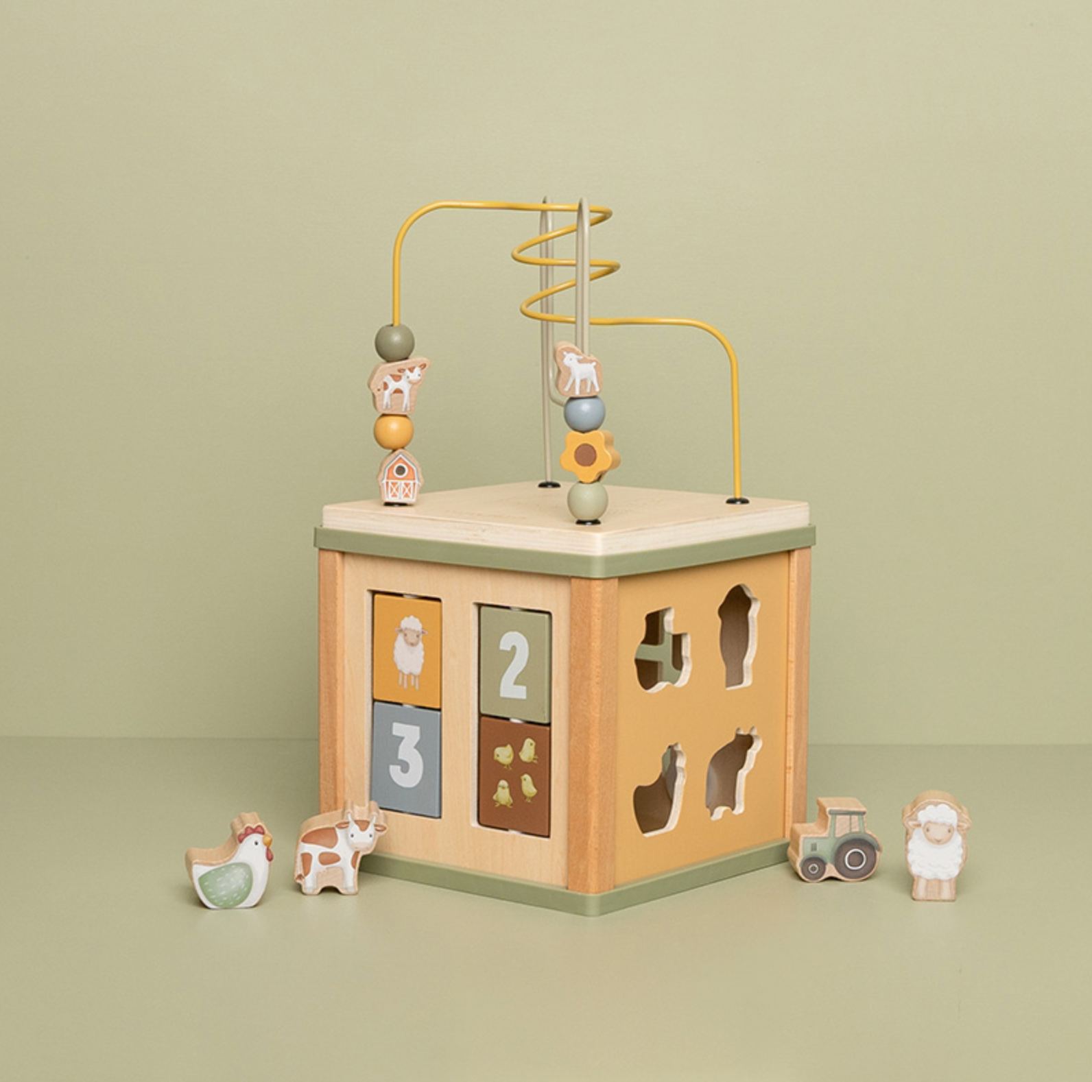 Partez à l'aventure et explorez toutes les faces de ce cube rempli d'activités. Chaque face contient des éléments du thème Little Farm et offre des activités éducatives amusantes, telles qu'un trieur de formes, des engrenages rotatifs, des puzzles et, au sommet, un amusant labyrinthe de perles.