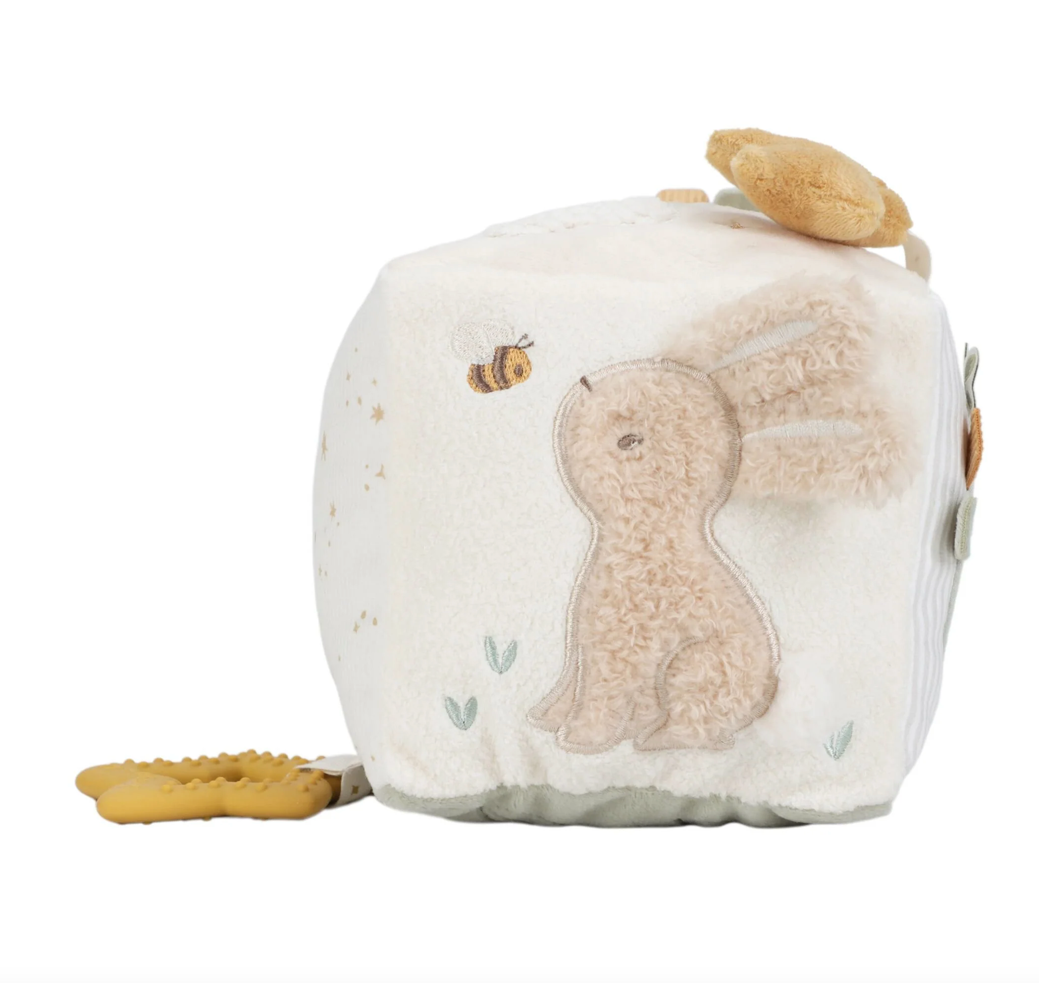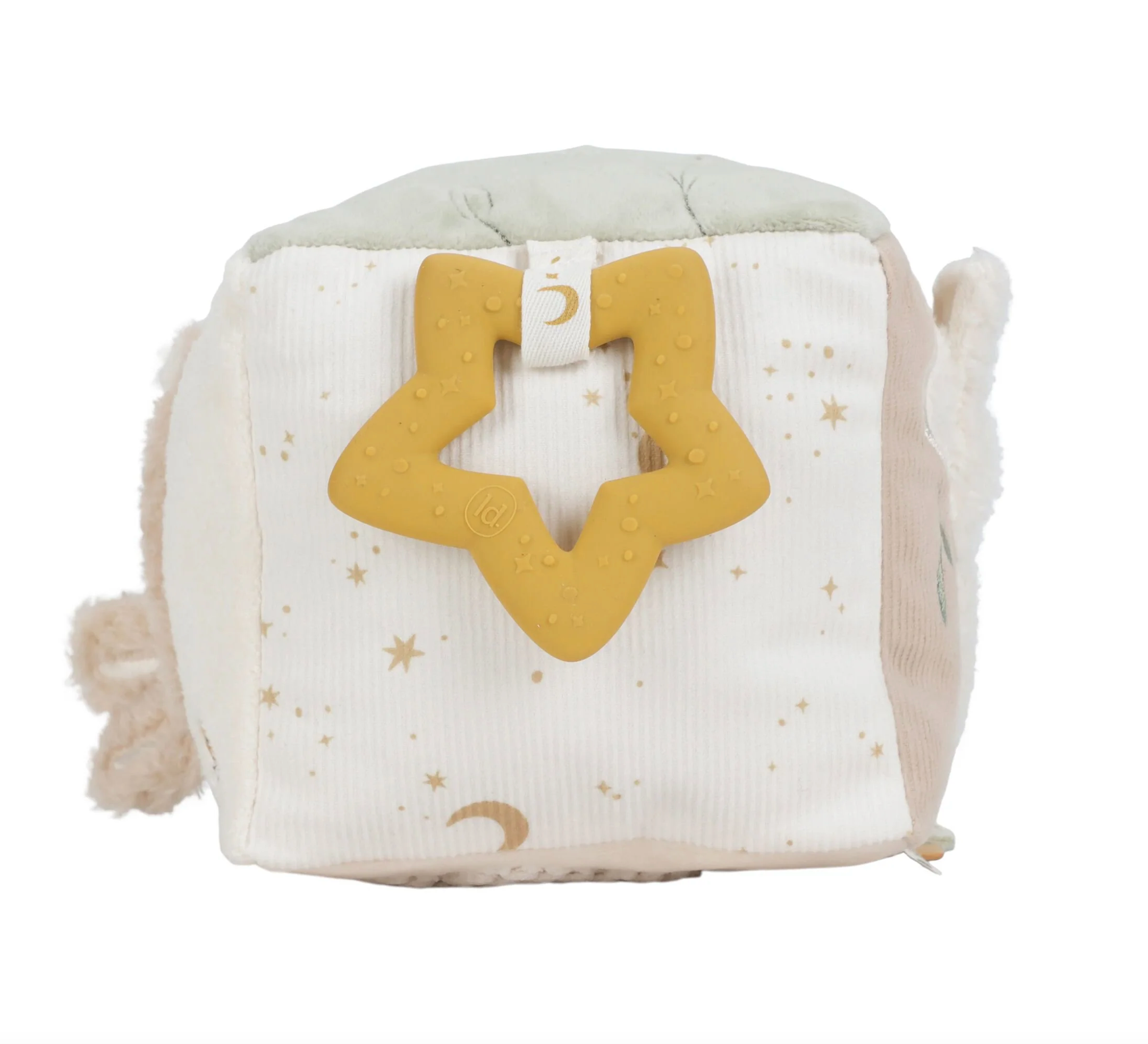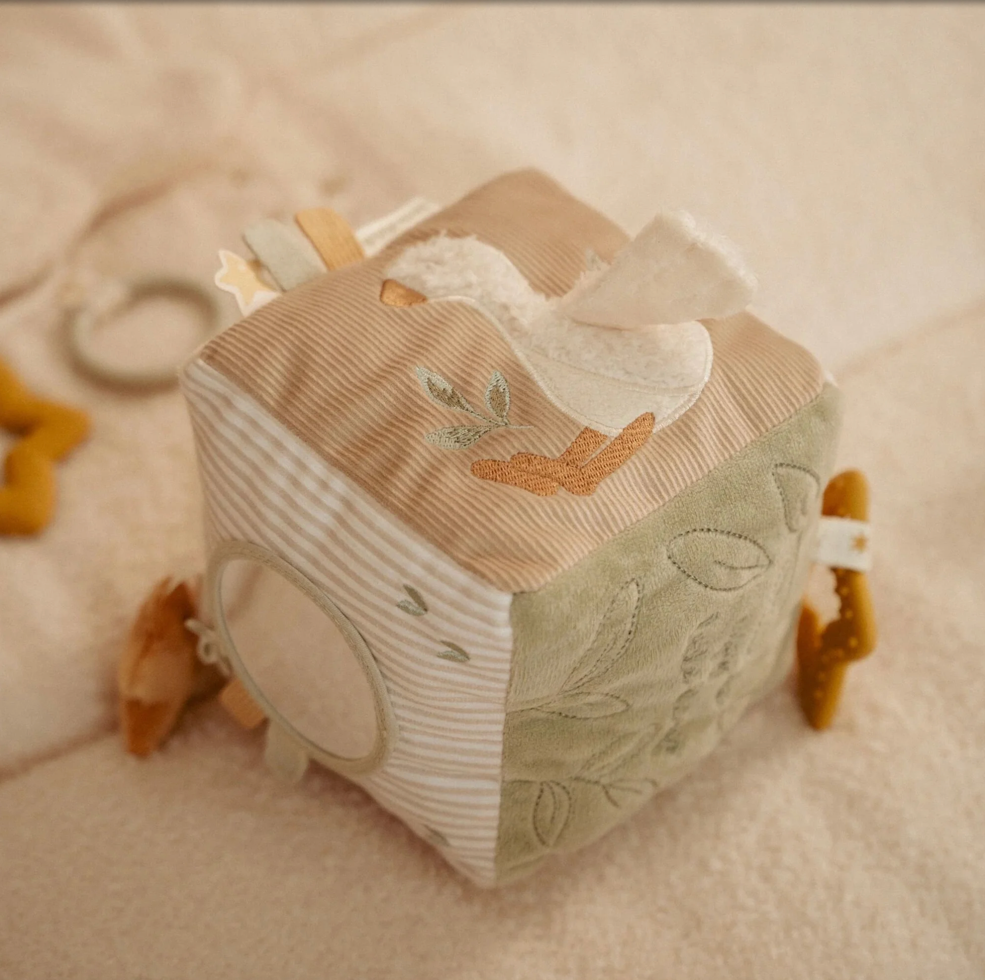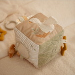 Un cube d'activités plein de surprises pour votre mini ! Chaque côté invite au jeu avec des tissus doux, des sons froissés, des étiquettes ludiques et un miroir dans lequel regarder. Il stimule les sens et encourage la curiosité. Le cube est parfait pour attraper, tenir et tourner, ce qui permet de développer la motricité fine de manière ludique.