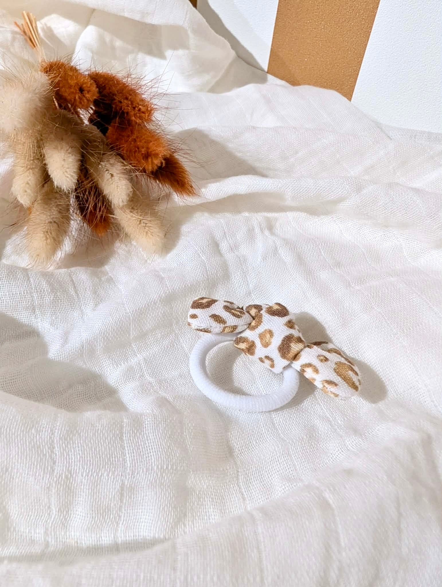 Un joli petit élastique avec un noeud en tissu pour faire le plus belles coiffures à votre mini.