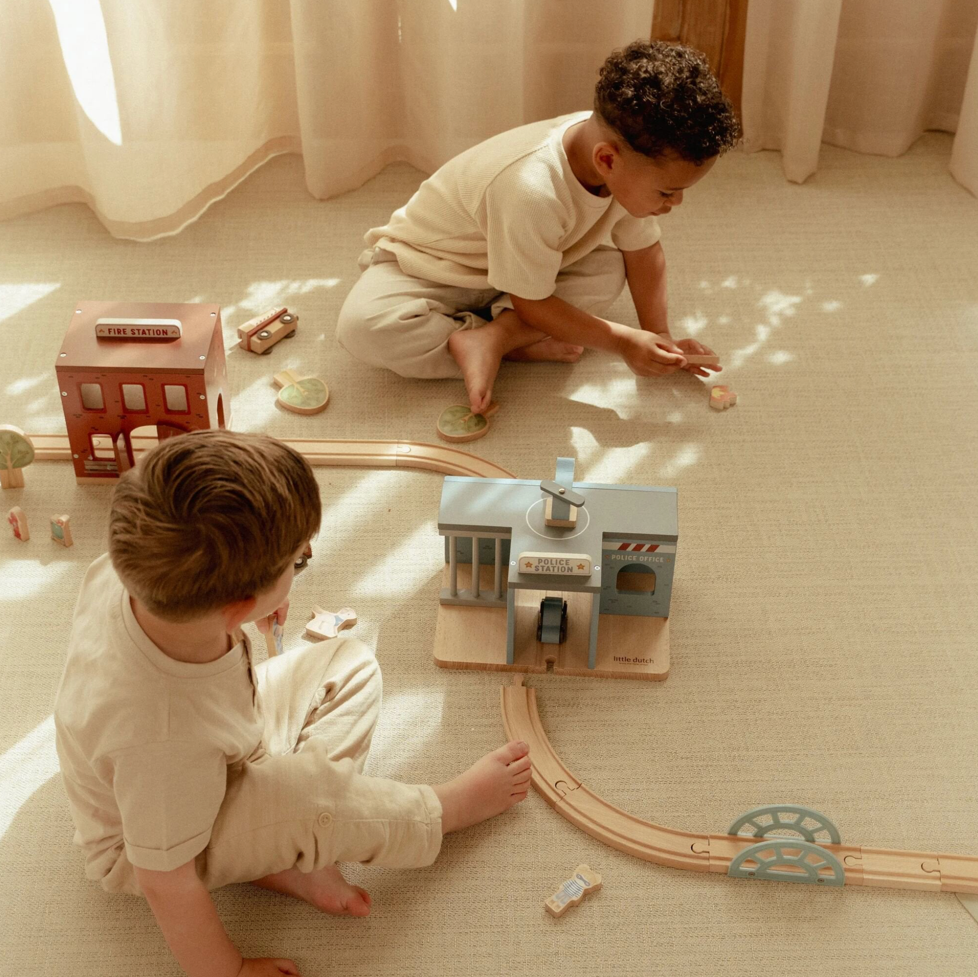 L'alarme se déclenche ! Cette caserne de pompiers en bois a tout ce dont vous avez besoin pour une opération de sauvetage passionnante. Ouvrez les portes, glissez à travers le poteau de pompiers et sautez dans le camion de pompiers. Le set inclus les pompiers, les flammes et une poubelle en feu. Les portes de la caserne peuvent s'ouvrir, ce qui vous permet de sortir rapidement. Combinez cet ensemble avec le circuit de train en bois XXL pour encore plus d'aventure. Qui sauvez-vous aujourd'hui ?