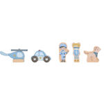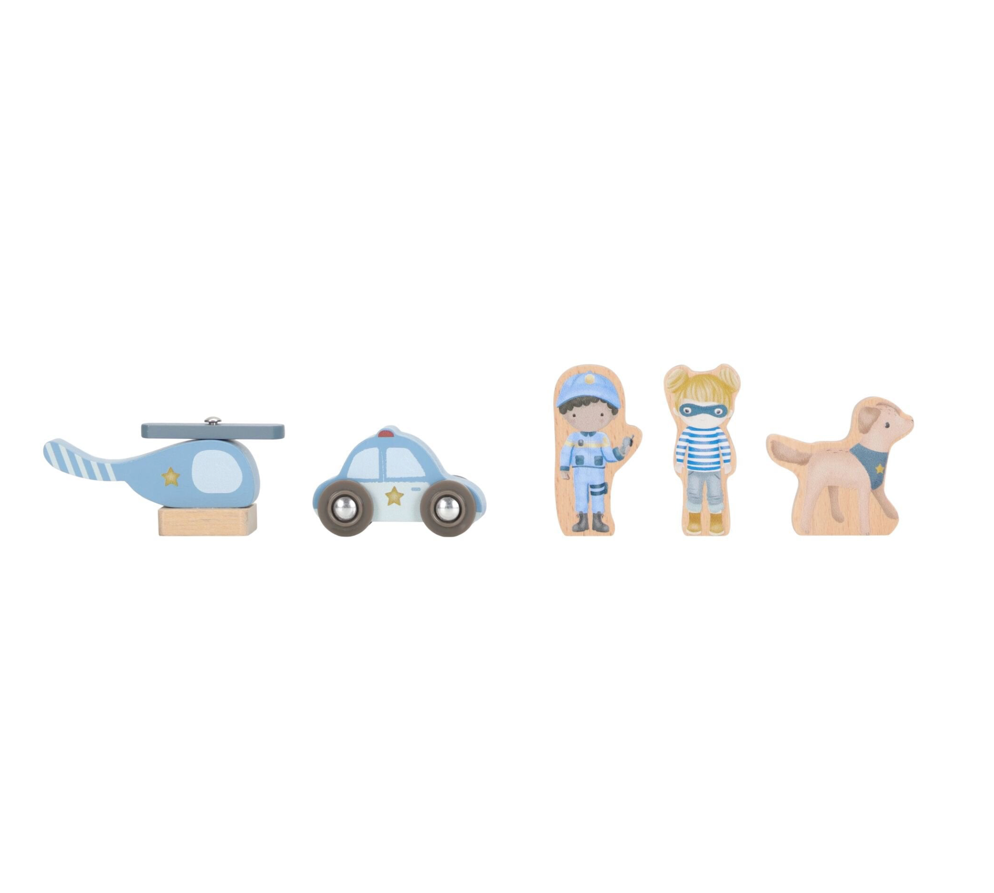 Voyou repéré ! Ce poste de police en bois contient tout pour des histoires policières passionnantes. Avec une voiture de police, un hélicoptère, un policier, un voyou et même un chien policier ! Le poste de police dispose d'une cellule avec des barreaux et d'une plate-forme d'atterrissage. Enfermez le voyou et gardez la ville en sécurité. Ce jouet de poste de police est un complément parfait à la voie de train en bois XL et stimule le jeu imaginatif. Qui emmenez-vous au bureau ?