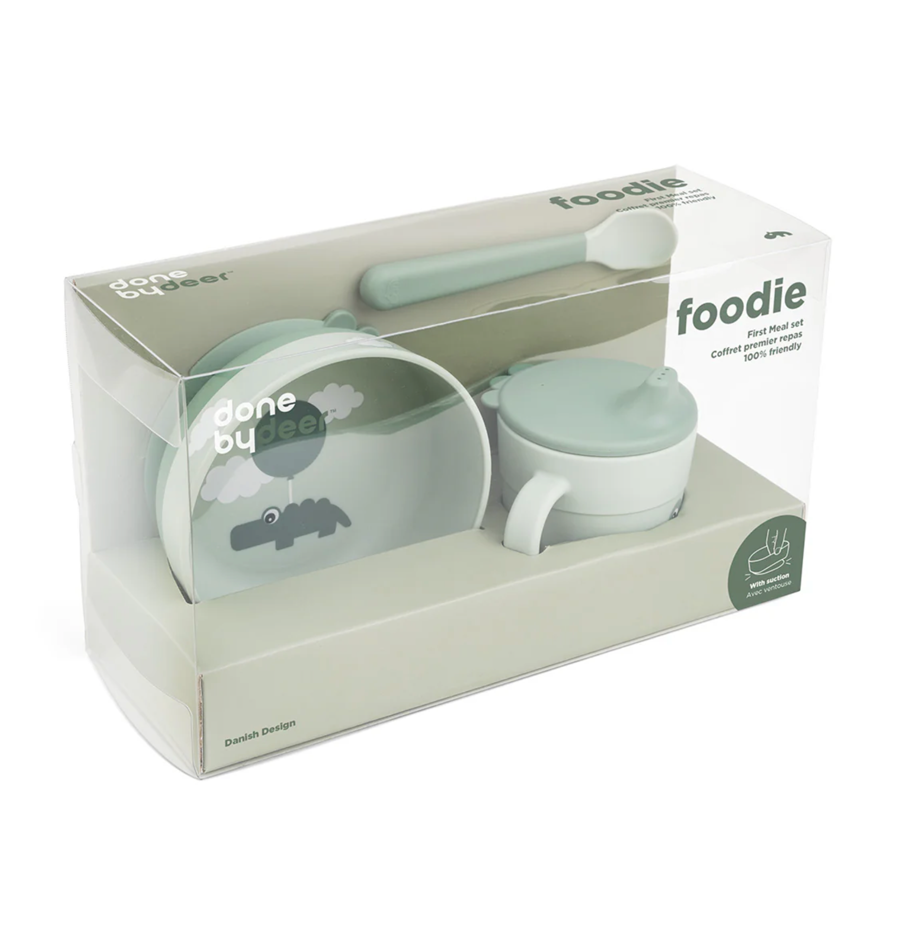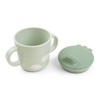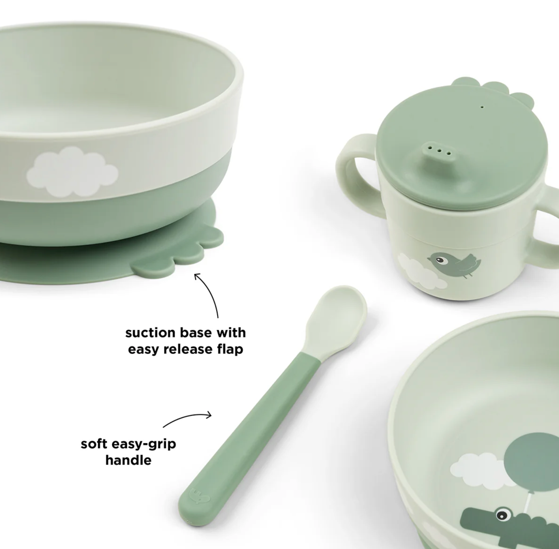 Le set de premier repas Vert est décoré d'un imprimé ludique Happy Clouds. Le bol est orné d'un motif de croco parmi les nuages et la tasse à bec à deux anses est décorée d'une joyeuse birdee. Les éléments vert foncé ajoutent un joli détail bicolore.