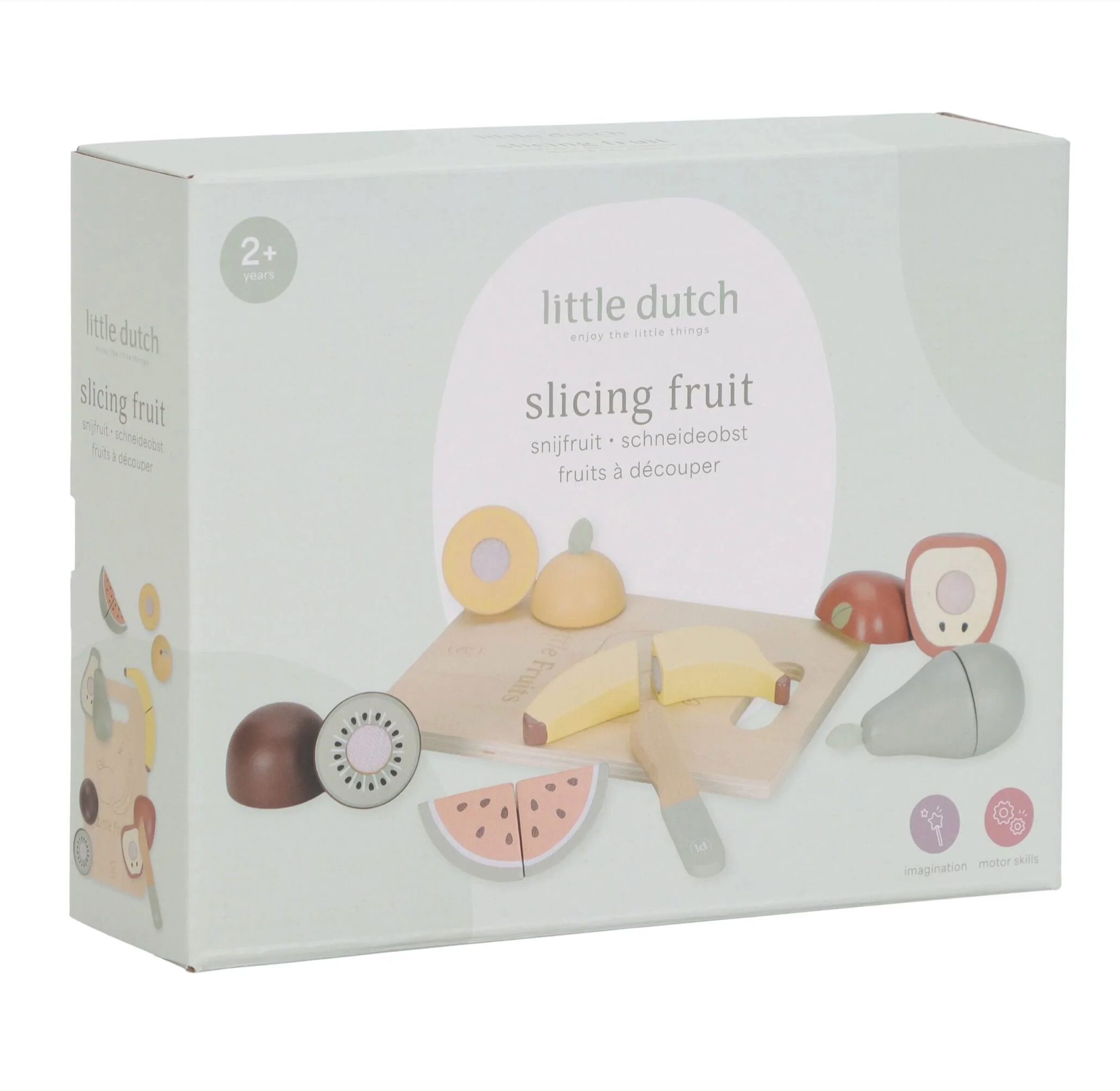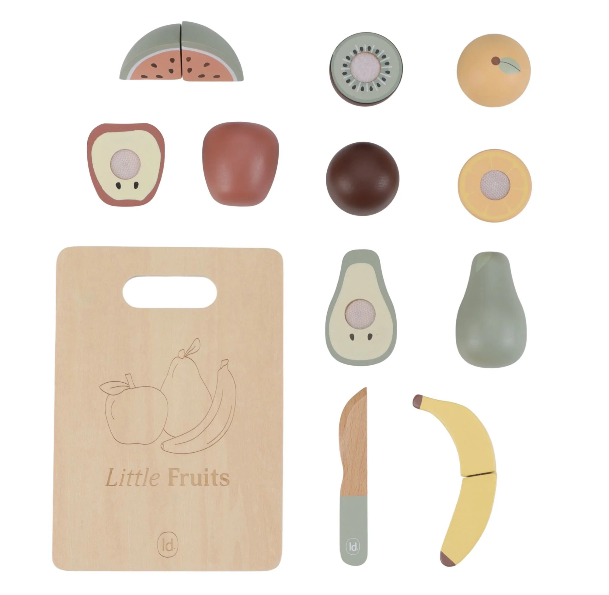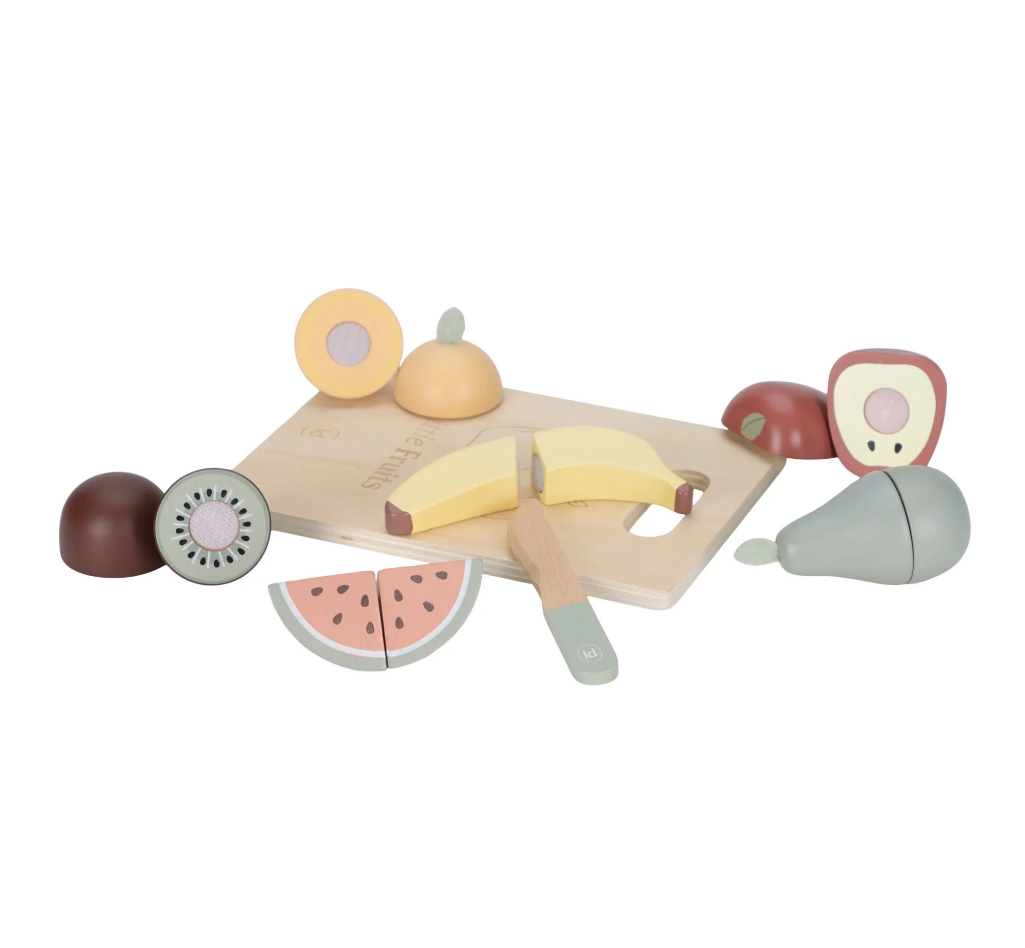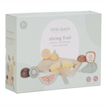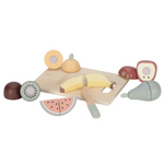 Votre mini adorera vous imiter en préparant à manger avec ce joli set de 6 fruits différents. Une planche à découper et un couteau en bois sont fournis pour couper les fruits en deux et faire comme les grands. Pomme, banane, kiwi, poire, orange ou pastèque : tous les fruits se recollent facilement à l’aide du scratch.
