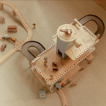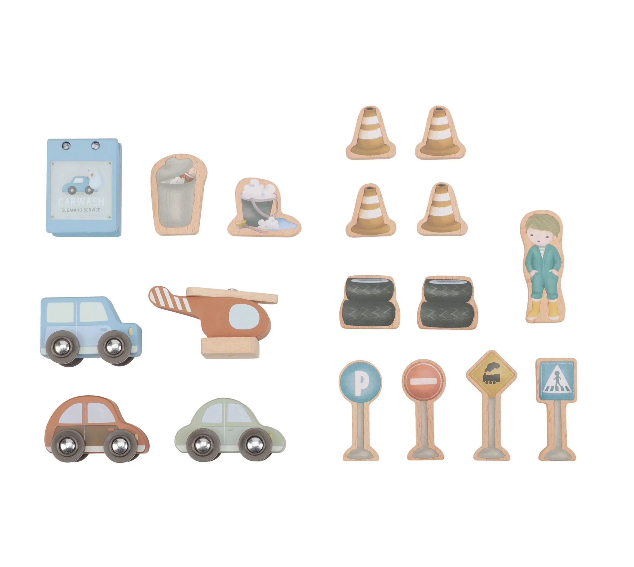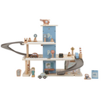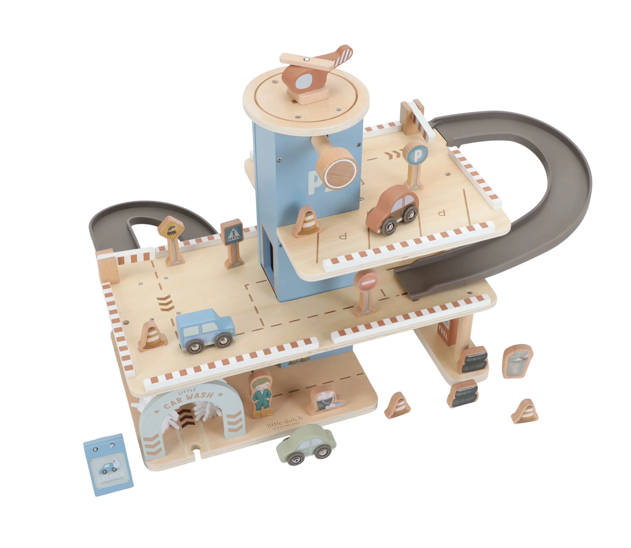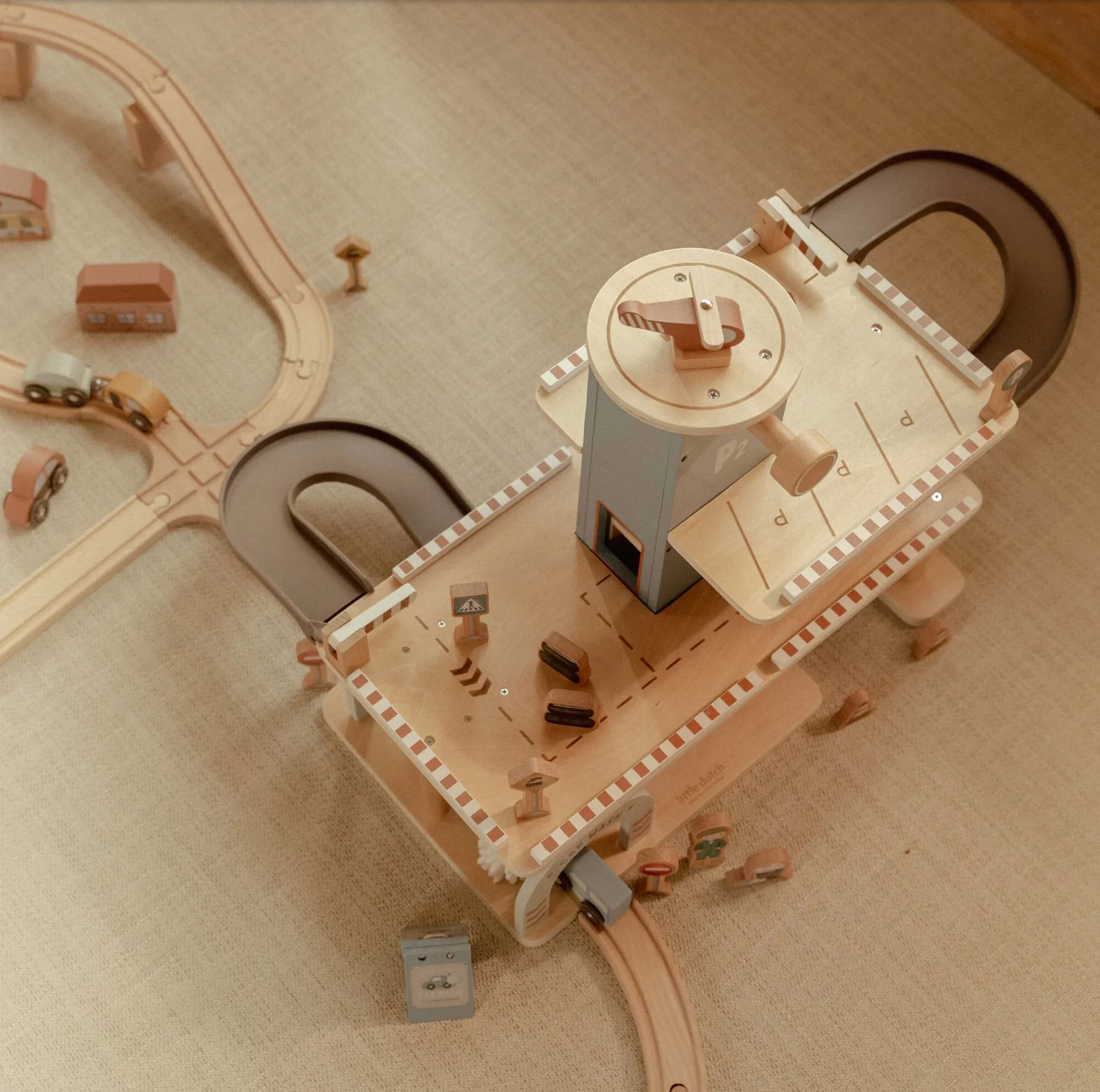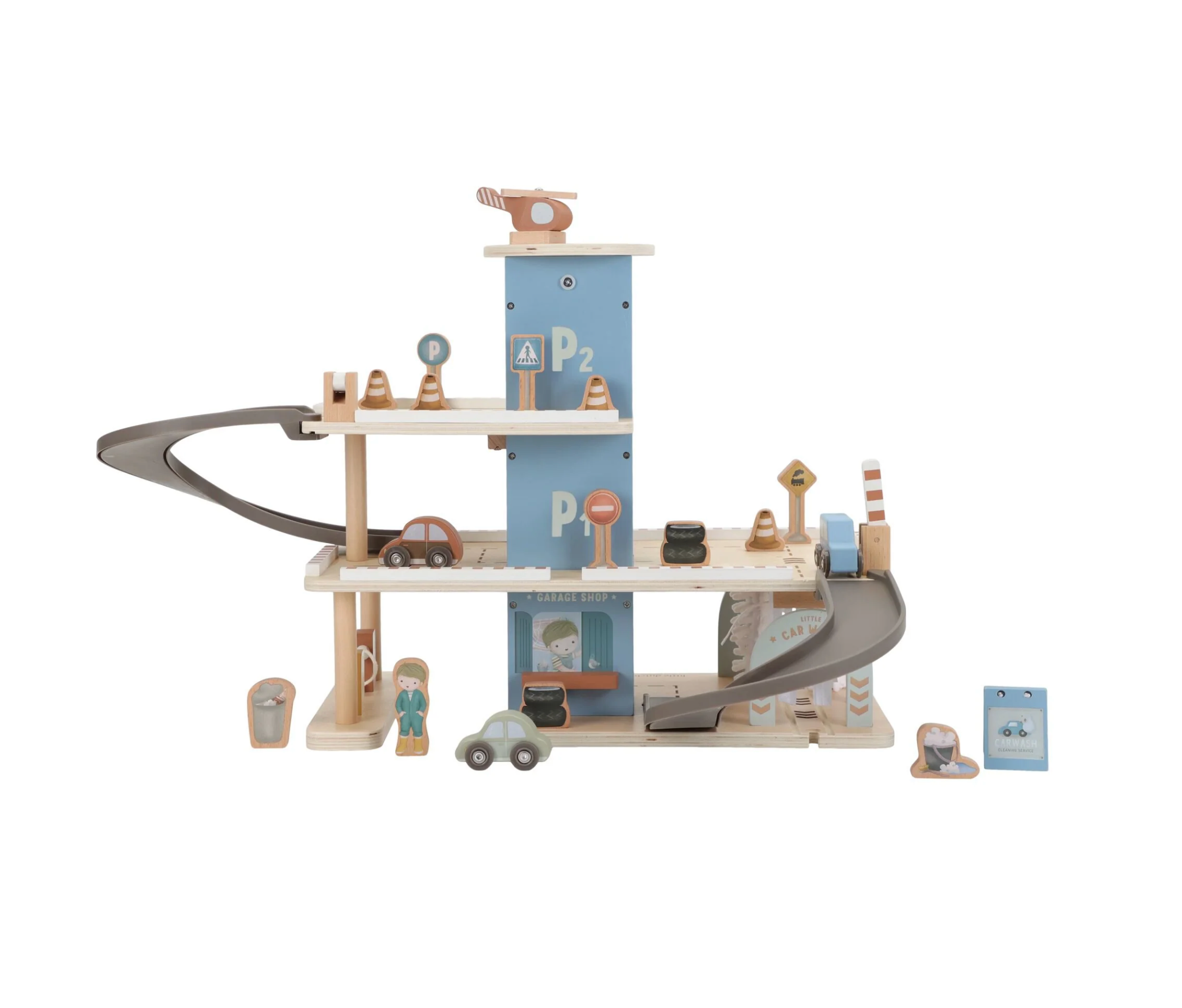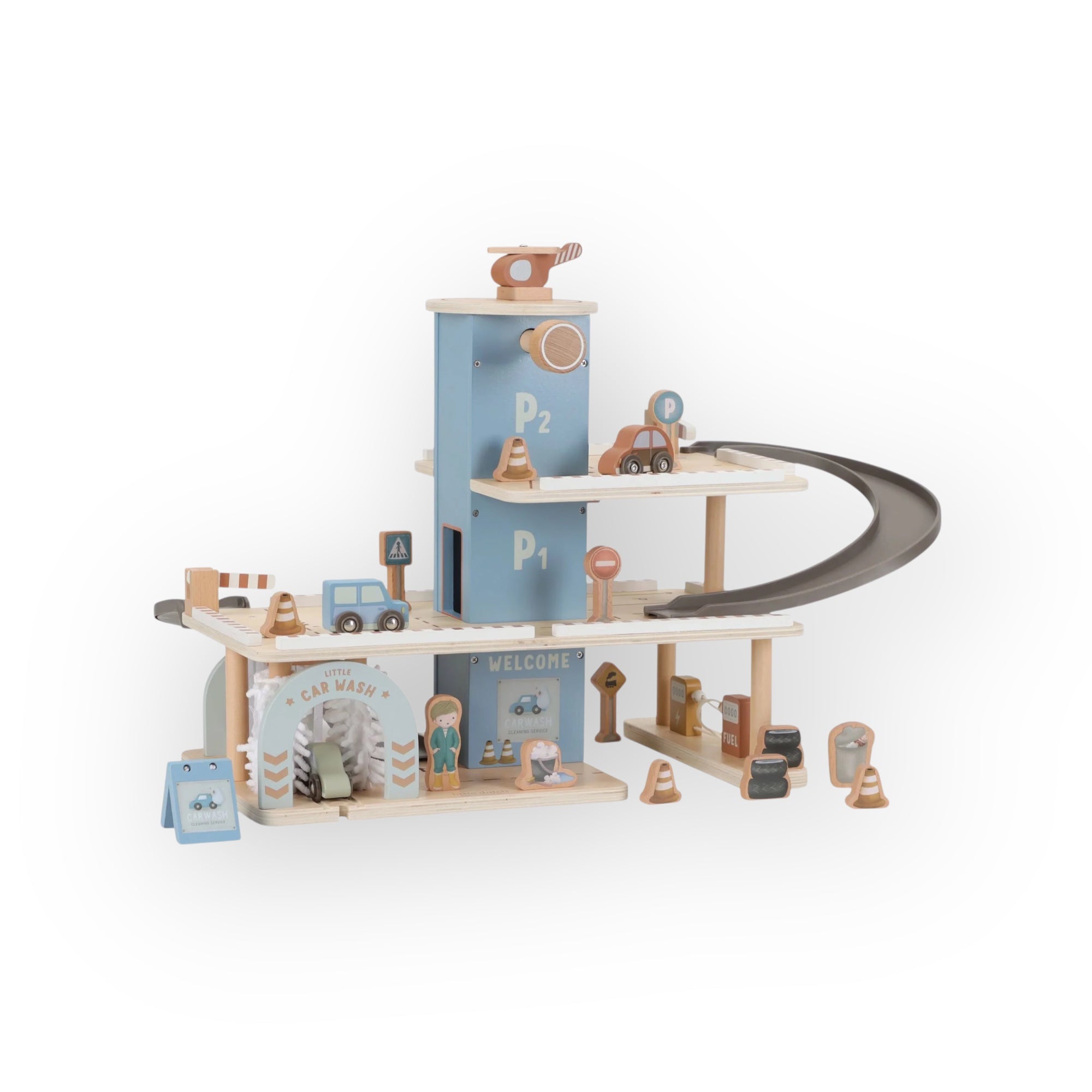 Votre mini se créé des histoires et fait la circulation dans ce grand garage en bois. Le garage dispose d'un rez-de-chaussée avec un lave-auto, deux étages de parking et une station de recharge électrique, ainsi qu'une plateforme pour hélicoptère au-dessus. Inclus des accessoires en bois tels que des panneaux de signalisation, des piles de pneus et un seau. Trois véhicules et un hélicoptère sont également fournis. Montez, garez votre voiture ou volez avec l'hélicoptère vers votre destination.