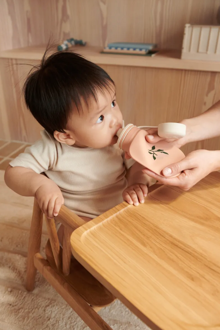 Bec verseur : 100 % polypropylène ; bouteille, couvercle, cuillère : 100 % silicone.