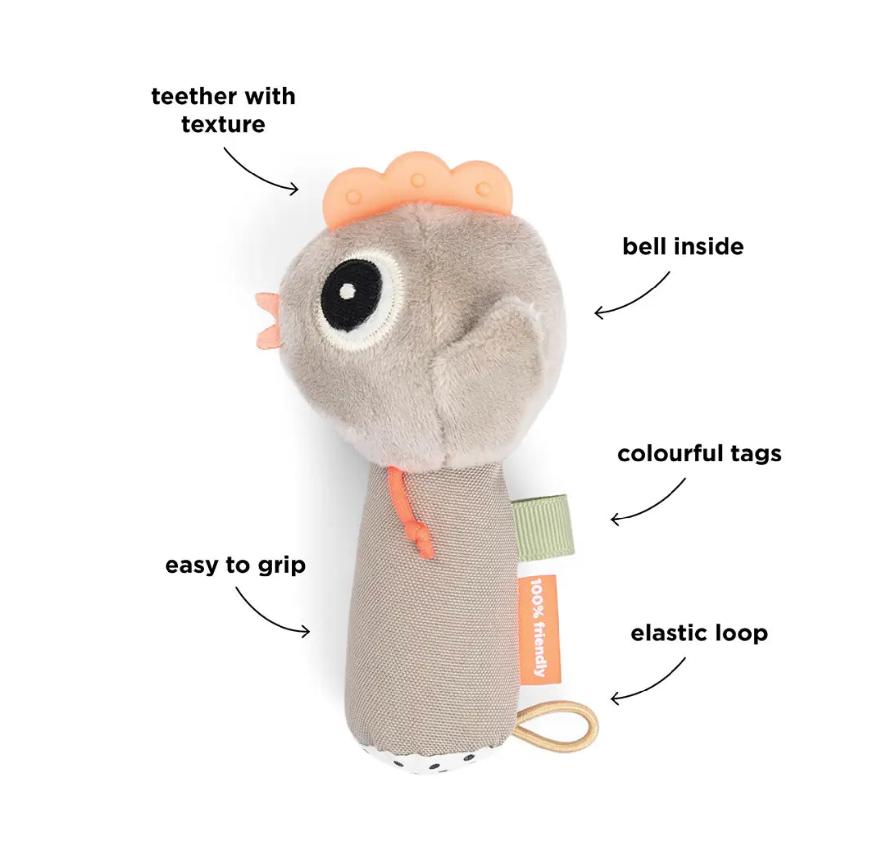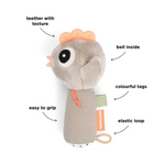 Ce hochet sensoriel est conçu pour éveiller les sens de votre bébé tout en lui apportant un apaisement. Grâce à ses éléments sensoriels, comme le hochet et ses différentes textures, il stimule l'ouïe et le toucher de votre bébé. La crête en forme de coq peut servir d'anneau de dentition, idéal pour soulager les gencives irritées lors des poussées dentaires.