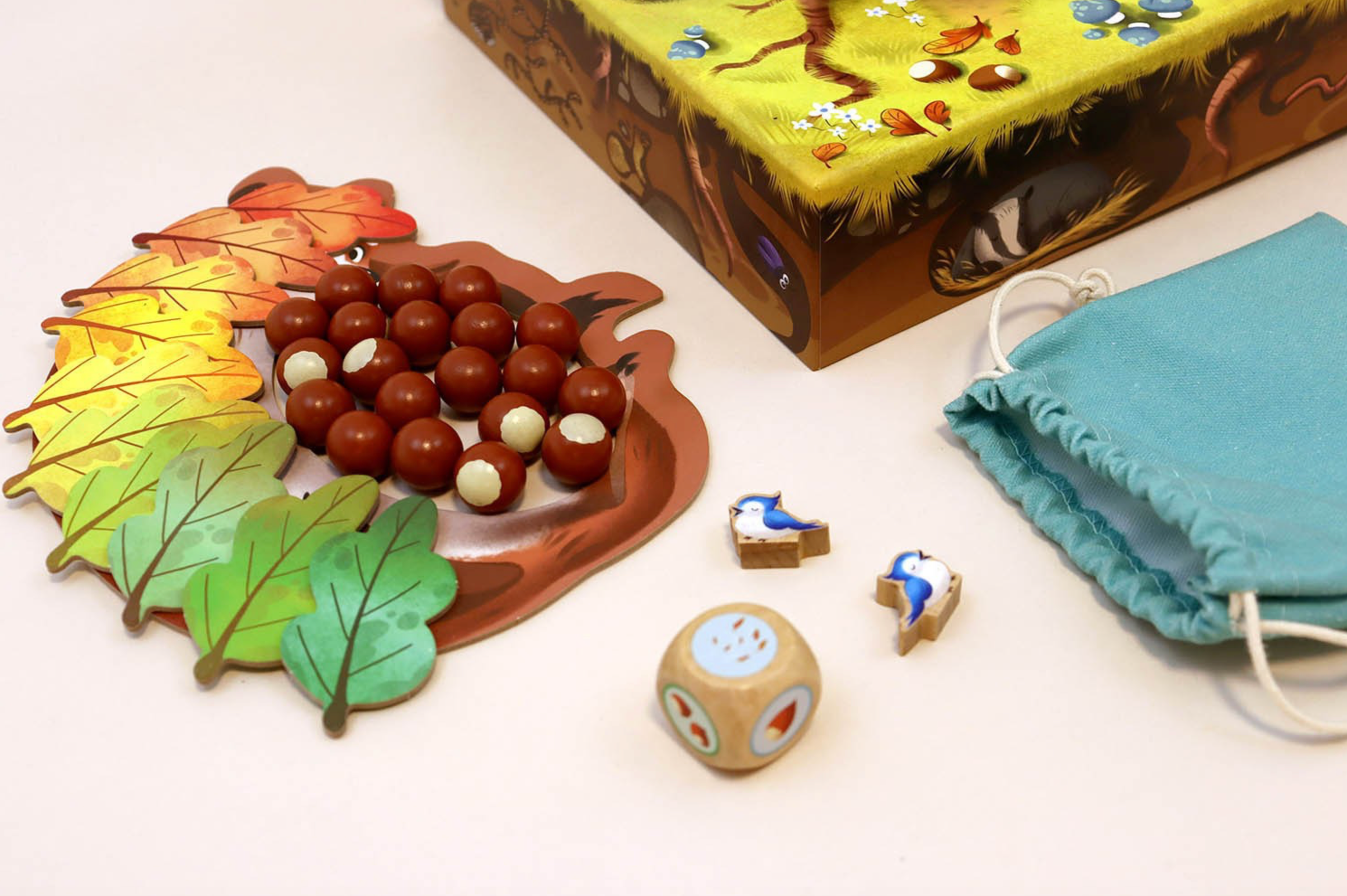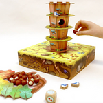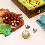 Contenu : 1 arbre à assembler / 1 belette / 20 noisettes en bois / 4 oiseaux en bois / 10 feuilles en carton / 1 dé en bois / 1 sac en tissu
