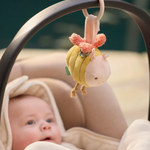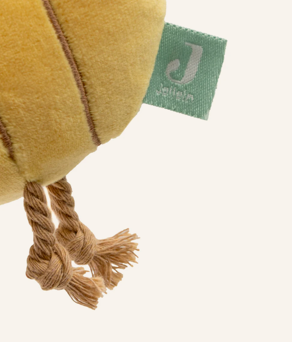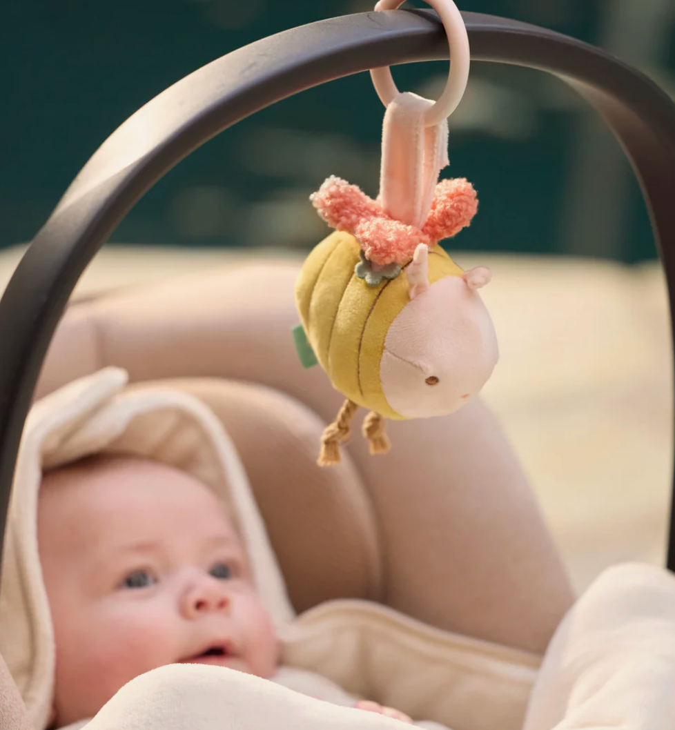 Fixez facilement l'abeille à la poussette ou au siège auto grâce à l'anneau pour que votre bébé ait toujours de quoi s'émerveiller à portée de main. À l’intérieur se cachent du papier qui crépite et une petite clochette, rendant l’abeille encore plus amusante à manipuler.