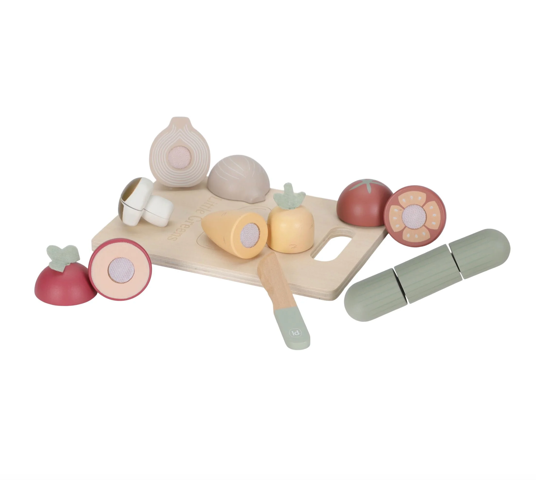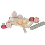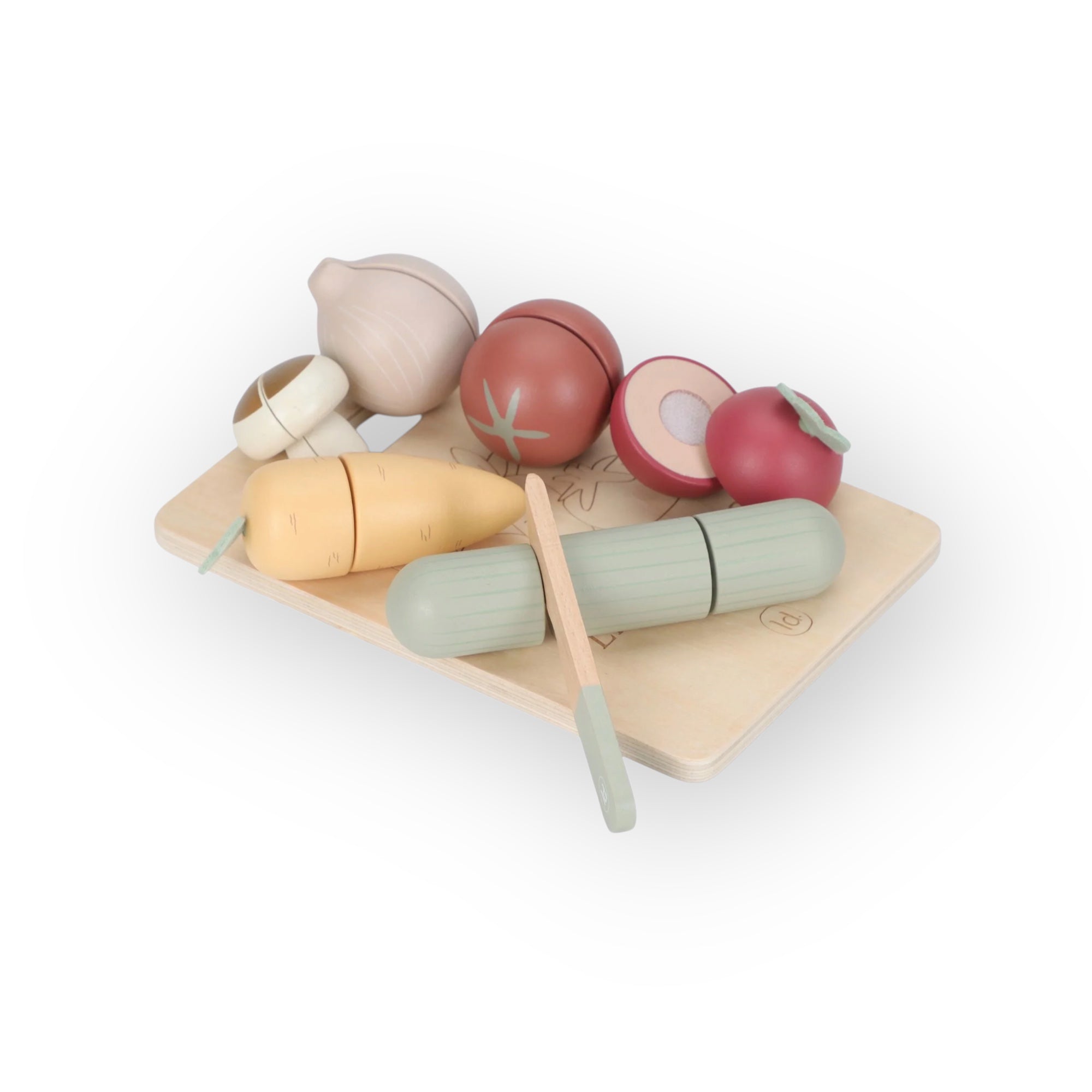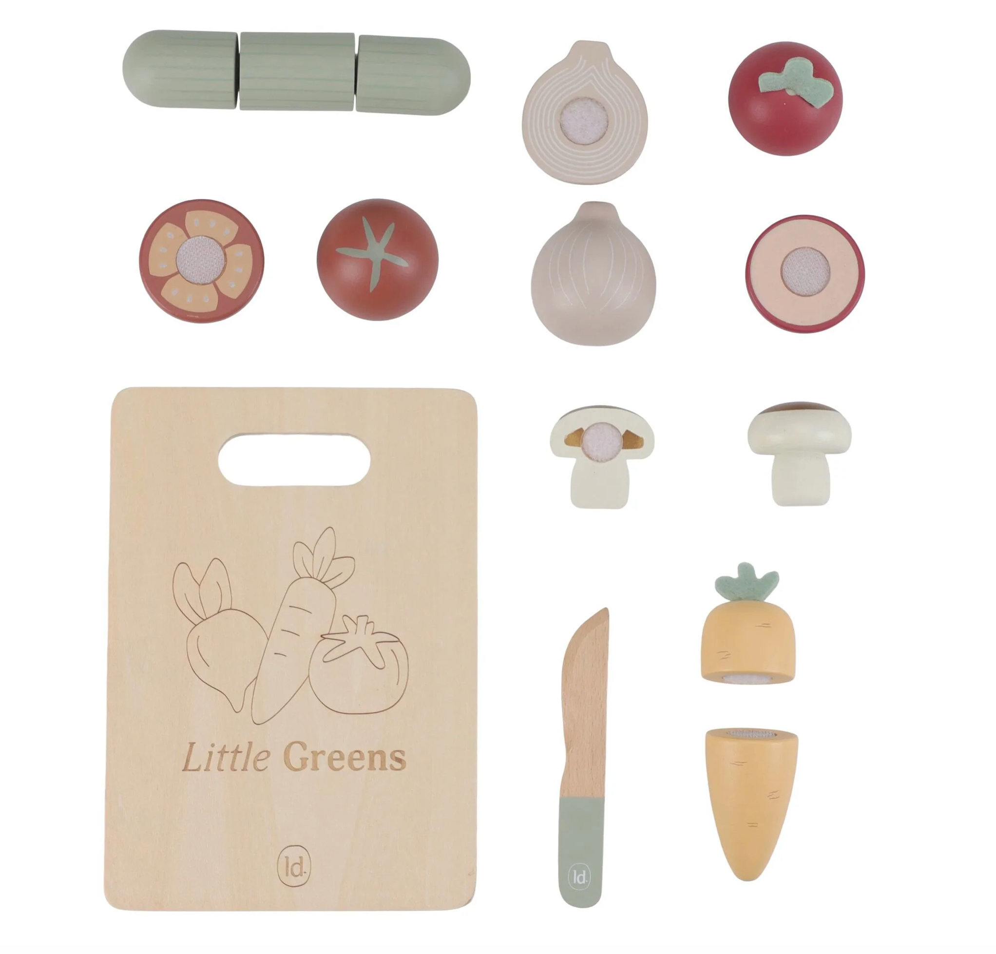 Votre mini adorera vous imiter en préparant à manger avec ce joli set de 6 légumes différents. Une planche à découper et un couteau en bois sont fournis pour couper les fruits en deux et faire comme les grands. Carotte, radis, tomate, oignon, champignon ou concombre : tous les légumes se recollent facilement à l’aide du scratch.