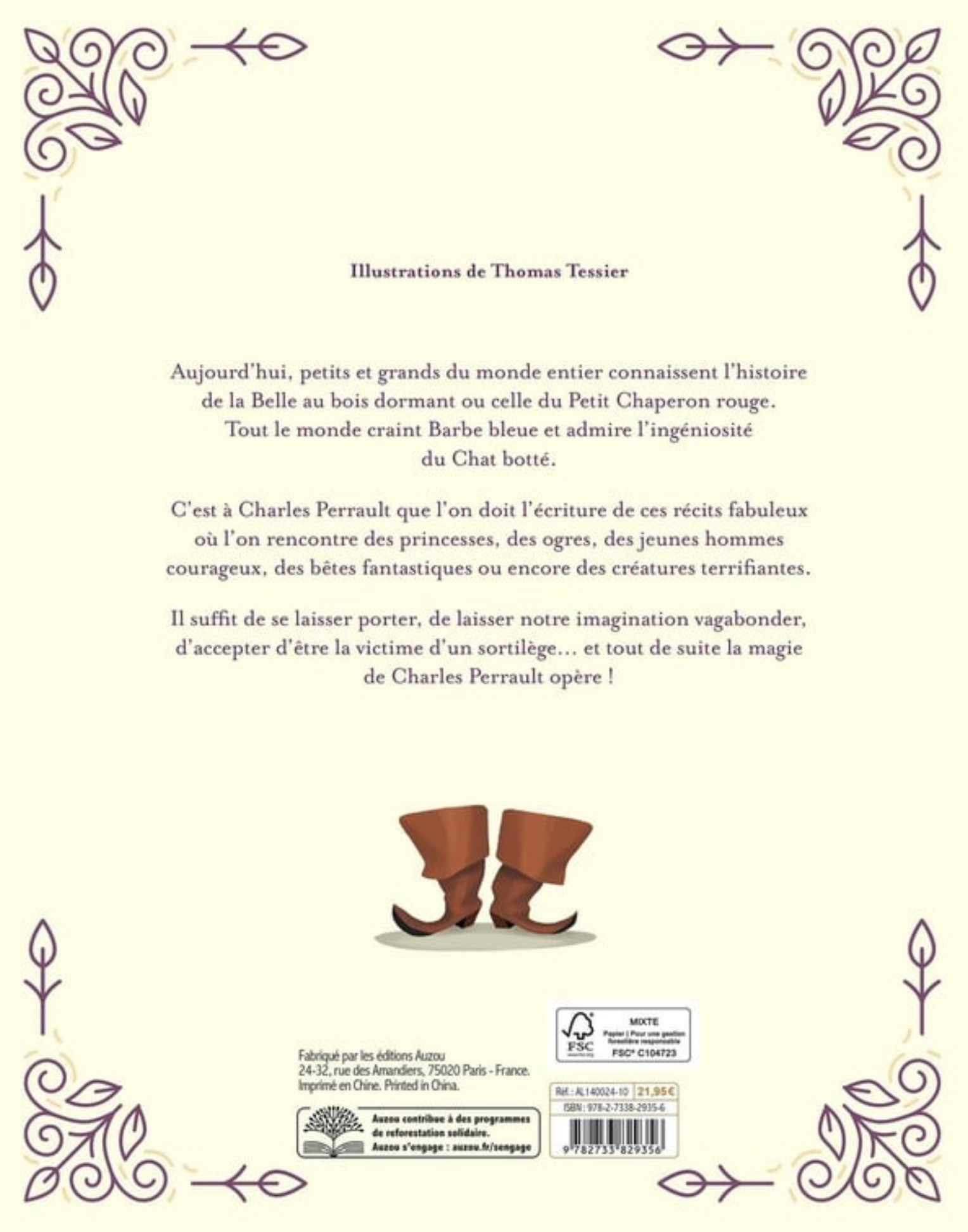 La collection : Les grands chef-d'oeuvres de la littérature enfantine à lire et à redécouvrir en famille. Aujourd'hui, petits et grands du monde entier connaissent l'histoire de la Belle au bois dormant ou celle du Petit Chaperon rouge. Tout le monde craint Barbe Bleue et admire l'ingéniosité du Chat botté. C'est à Charles Perrault que l'on doit l'écriture de ces récits fabuleux, que l'on retrouve ici en intégralité, illustrés avec talent par Thomas Tessier.
