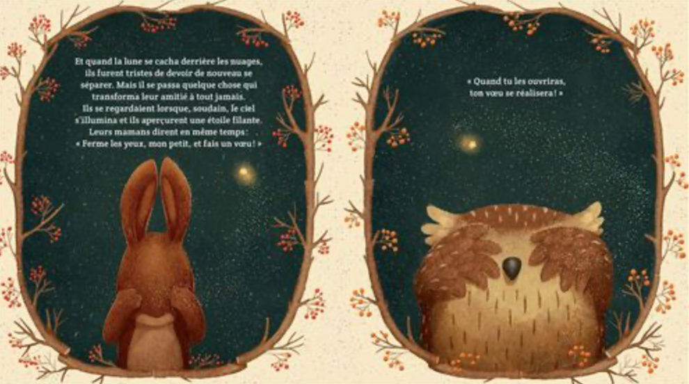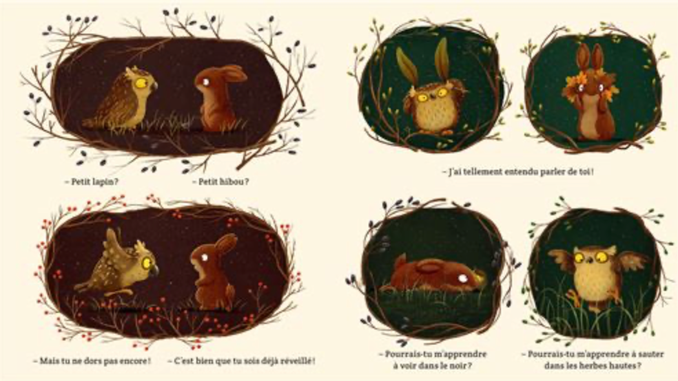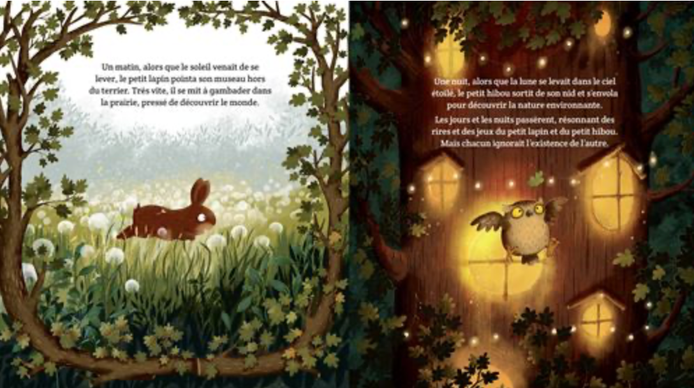 "Au pied d'un vieux chêne vit une famille de lapins, à son sommet vit une famille de hiboux. Bien qu'ils vivent à côté, il est difficile de se rencontrer quand les uns vivent le jour et les autres la nuit ! Et pourtant, Petit hibou et Petit lapin ont très envie de se connaître et de devenir amis... Y parviendront-ils ?