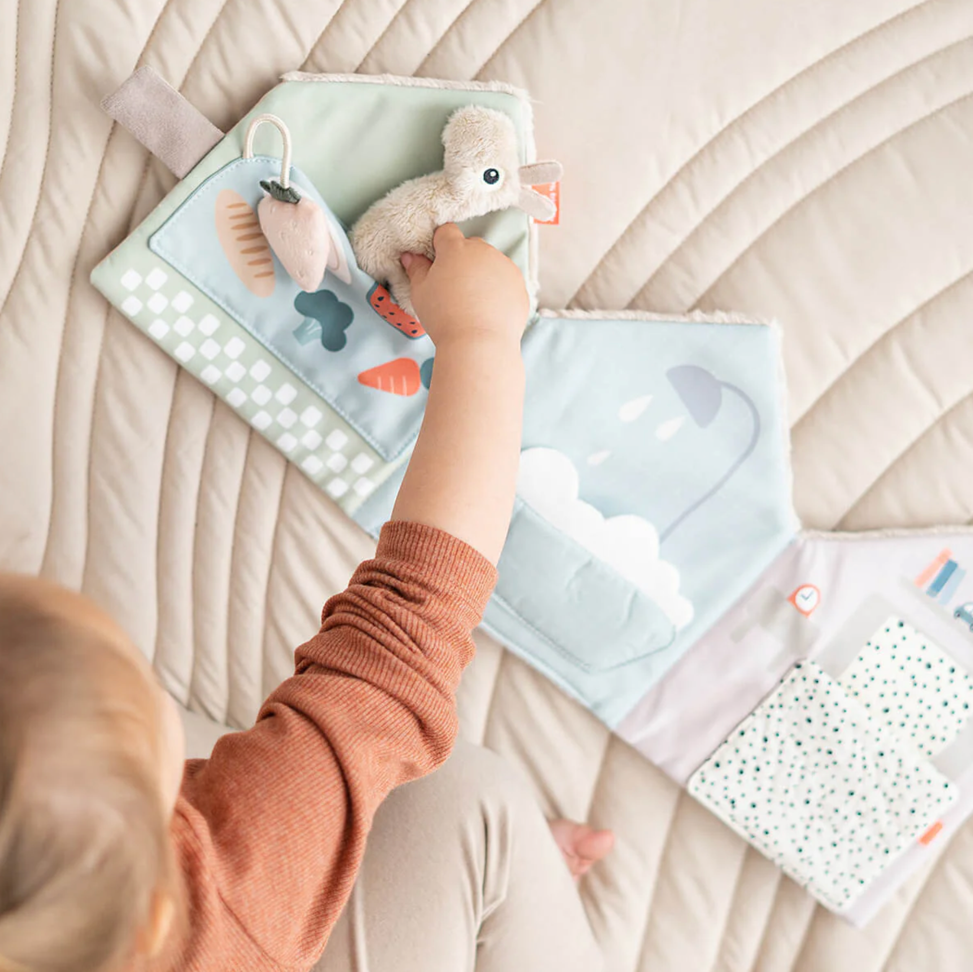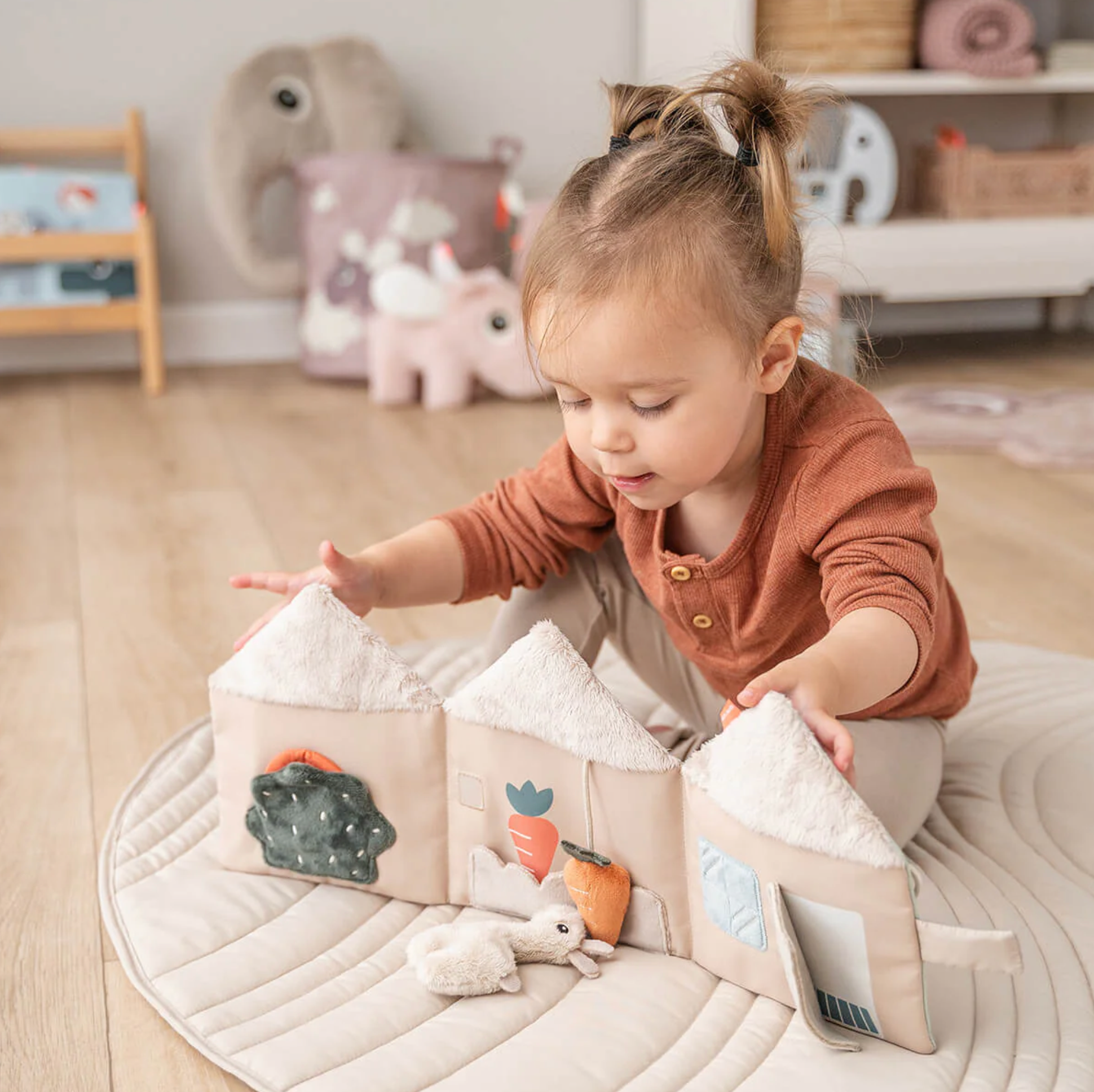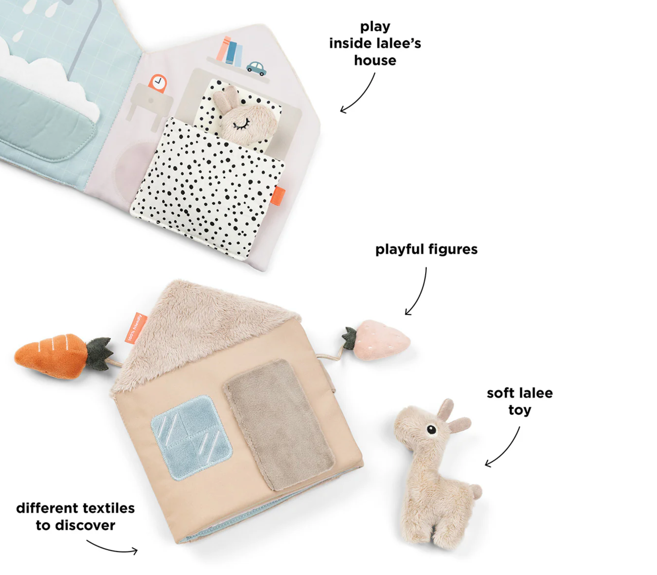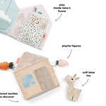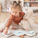 L'adorable livre souple Lalee invite votre enfant à explorer sa créativité, en favorisant la création d'histoires et le jeu imaginatif. Le minuscule jouet Lalee tout doux permet de raconter des histoires interactives, en jouant des routines quotidiennes familières d'une page à l'autre. Tourner les pages développe la motricité fine, tandis que raconter des histoires favorise le développement du langage.