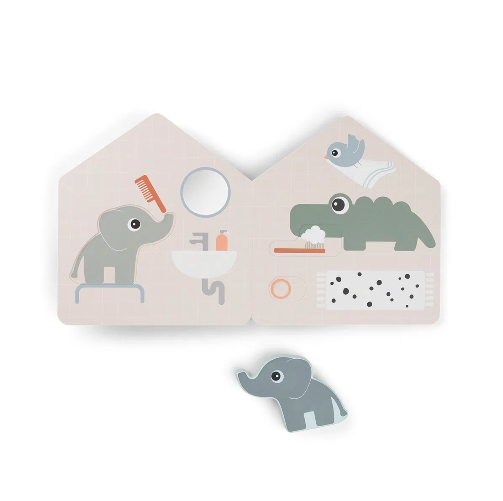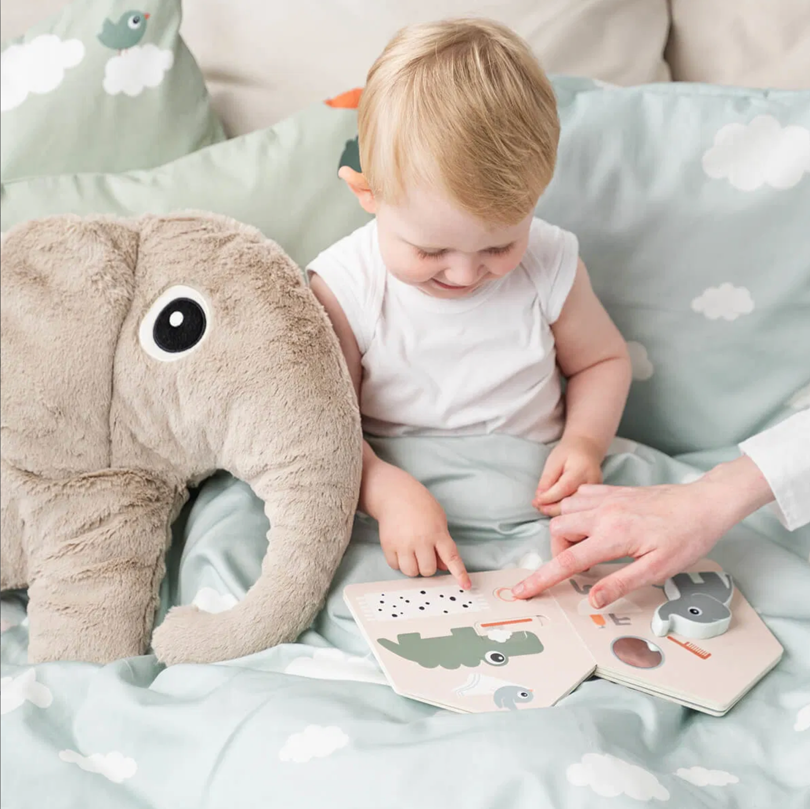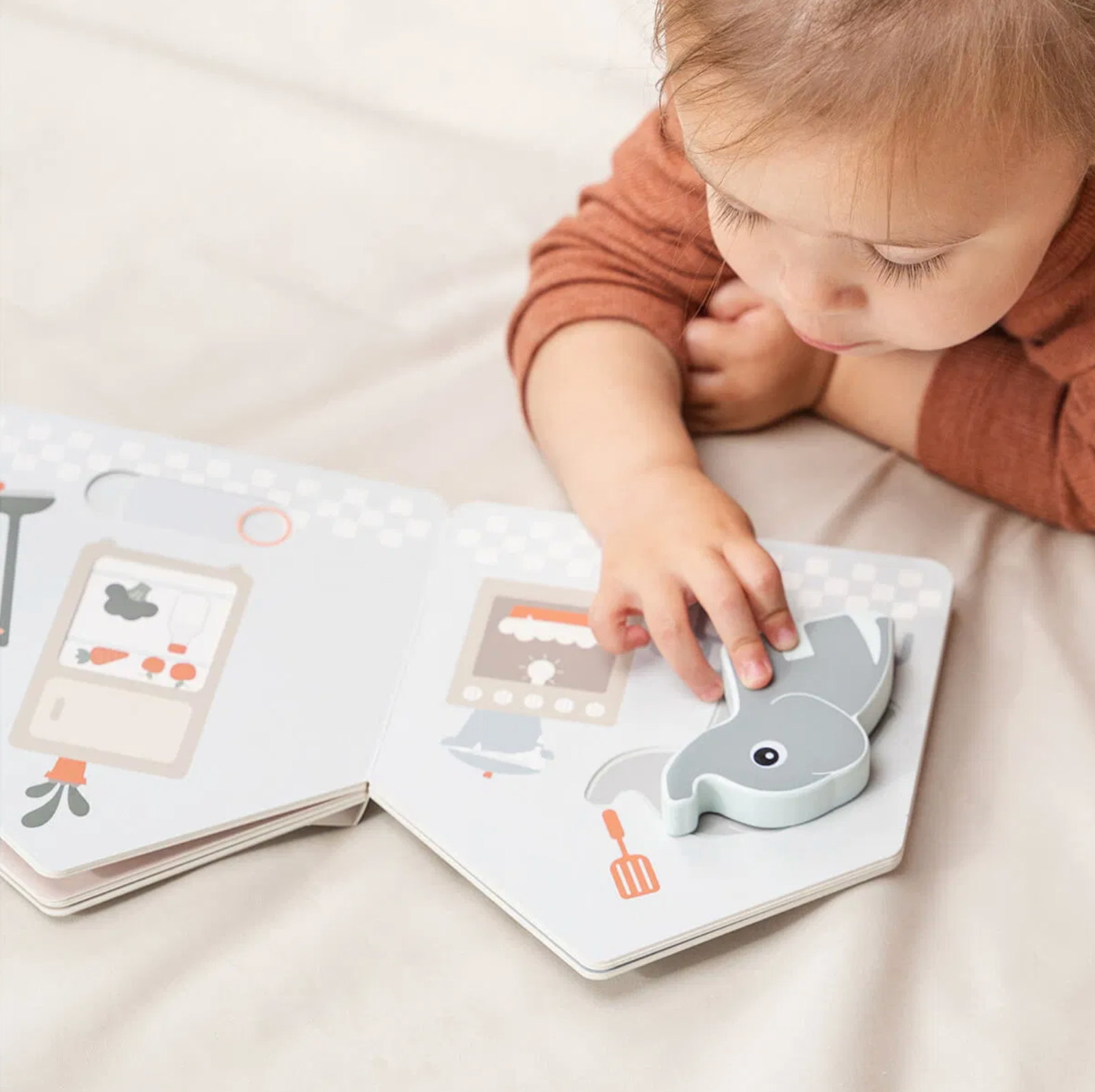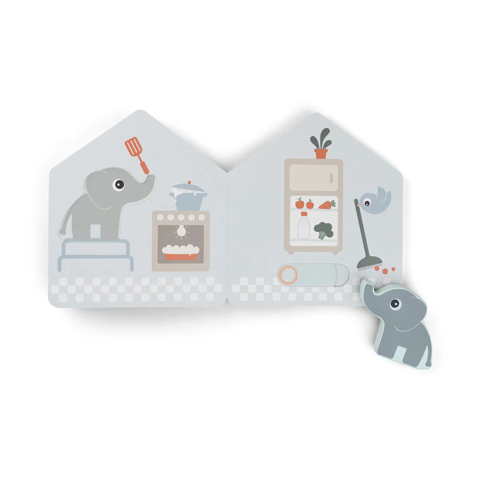Livre cartonné interactif avec Elphee, un adorable éléphant. Conçu pour ouvrir la porte au jeu imaginatif, ce livre encourage votre mini à créer des histoires et à s'engager avec des éléments stimulants. Jouez avec la petite figurine en bois d'Elphee, en la déplaçant d'une page à l'autre pour créer des histoires passionnantes. Tourner les pages développe la motricité fine de votre enfant.