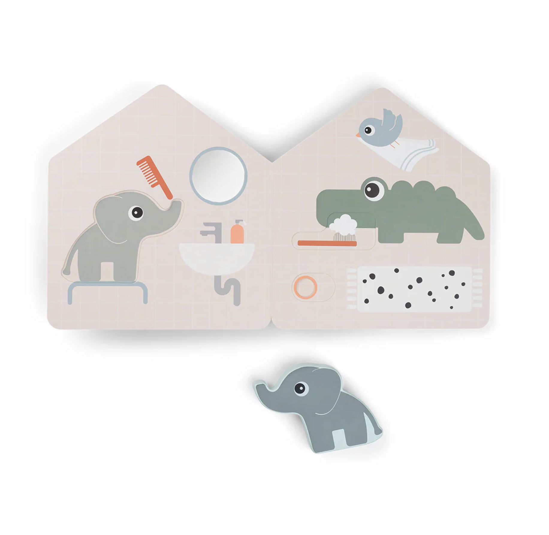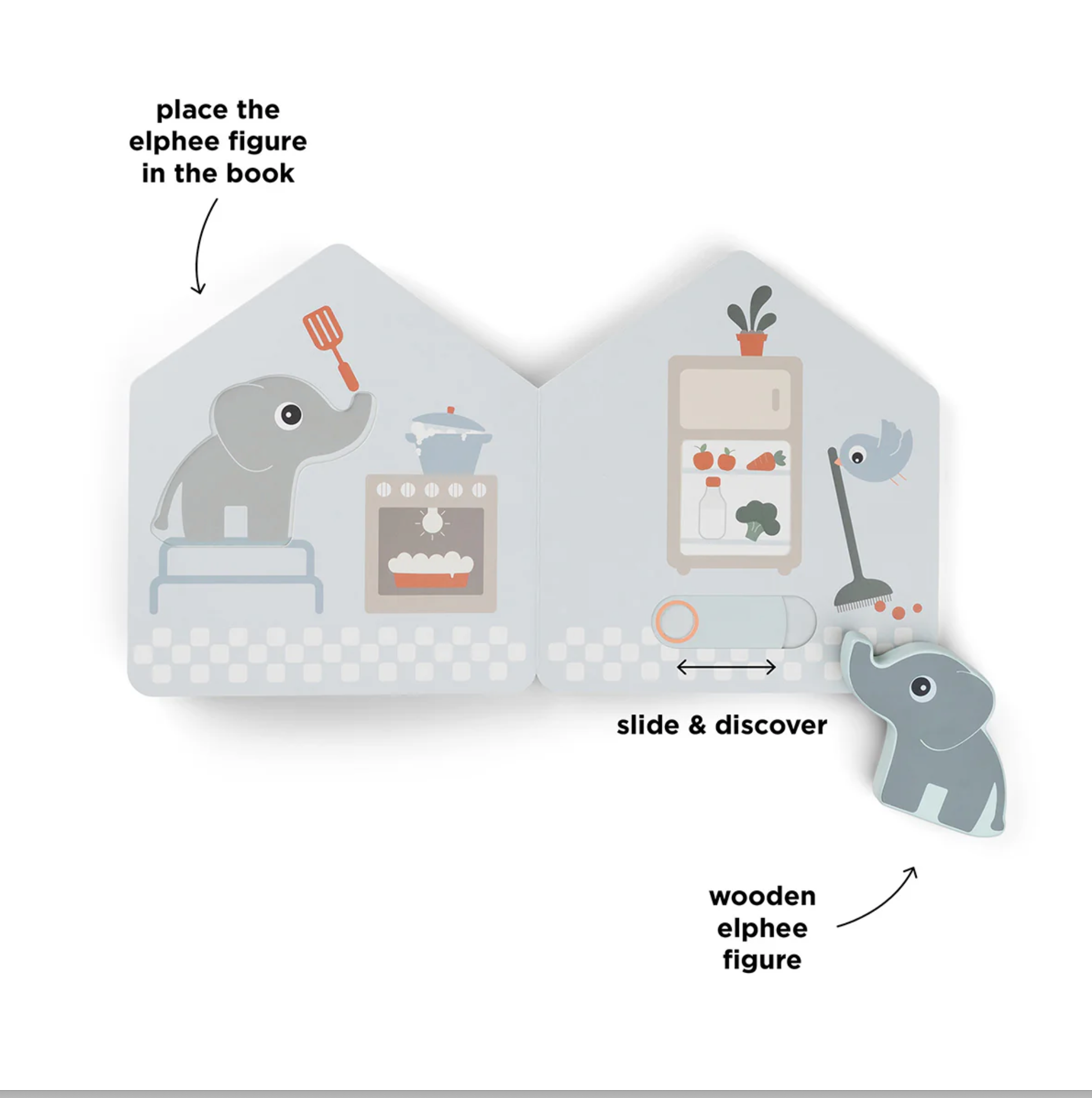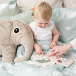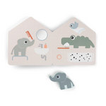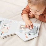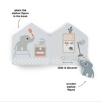 Livre cartonné interactif avec Elphee, notre adorable éléphant. Conçu pour ouvrir la porte au jeu imaginatif, ce livre encourage votre enfant à créer des histoires et à s'engager avec des éléments stimulants. Jouez avec la petite figurine en bois d'Elphee, en la déplaçant d'une page à l'autre pour créer des histoires passionnantes. Tourner les pages développe la motricité fine de votre enfant.