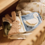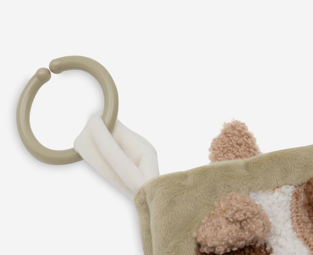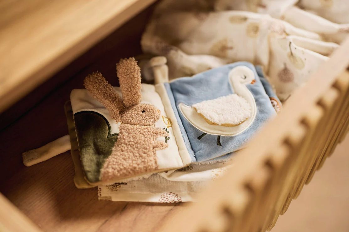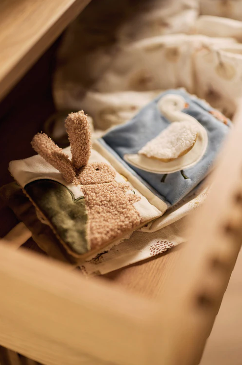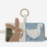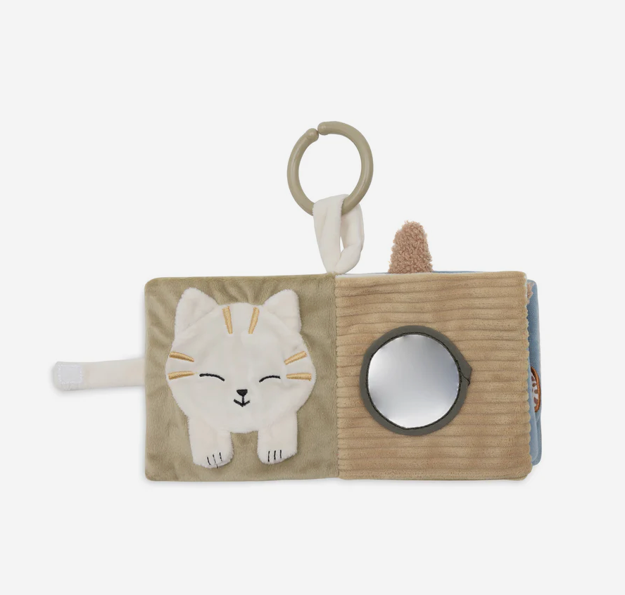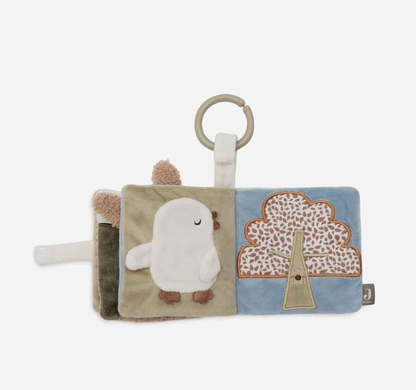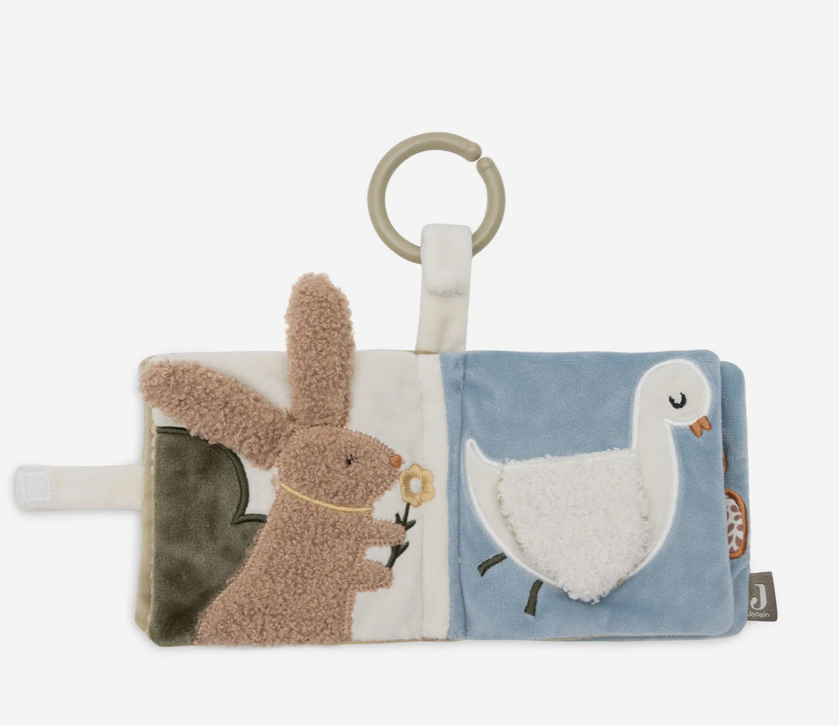 Ce petit livre d’activités doux est spécialement conçu pour stimuler les sens de votre bébé. Il se compose de quatre pages, chacune illustrée d’un adorable animal : un lapin, un oiseau, un canard ou un cygne. Les pages sont remplies de matières bruissantes qui invitent à la découverte et au jeu. Un petit miroir et des arbres décorent les pages pour plus de plaisir. Un jouet parfait pour stimuler les sens et la motricité de votre tout-petit !