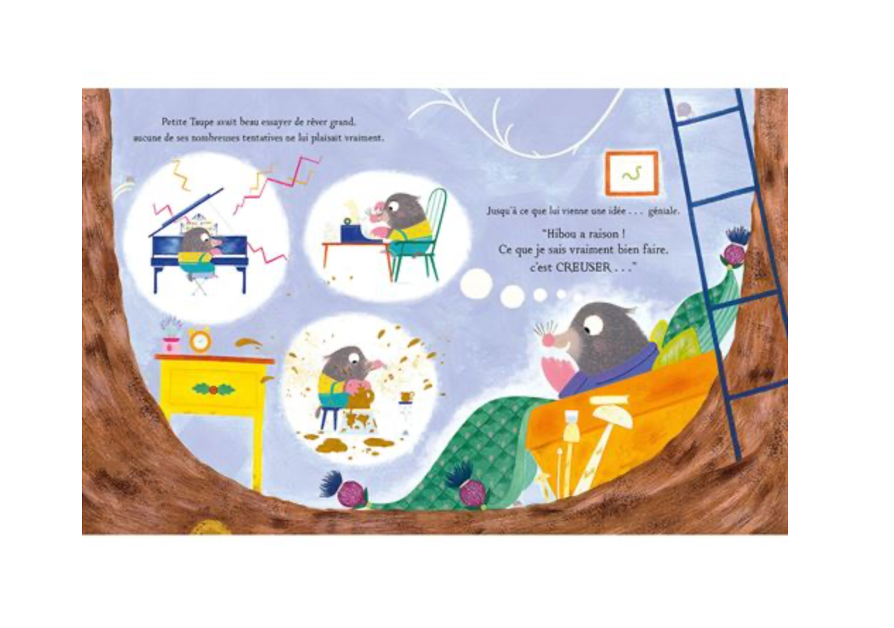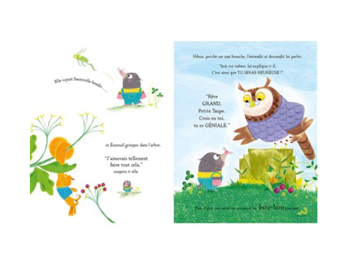 Une histoire inspirante sur l'amitié, la persévérance et la découverte de ses propres talents. Petite Taupe aimerait voler comme les oiseaux, grimper comme les écureuils... Un jour, Hibou lui conseille de rêver grand et de croire en elle. Mais toutes ses tentatives finissent en catastrophe, jusqu'au jour où Dame Loutre lui explique que pour réussir il faut persévérer... Et c'est ainsi qu'elle découvre que son talent est d'être utile à ses amis
