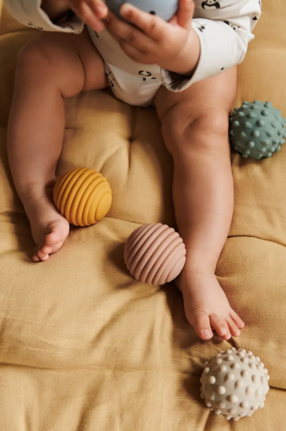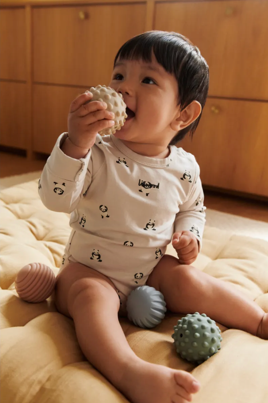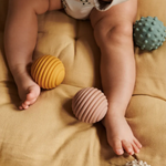 Cinq balles en silicone souple, aux textures variées, à presser, rouler et mâcher. Faciles à saisir par de petites mains, elles encouragent l'exploration tout en apaisant les gencives douloureuses. Une manière simple et engageante de soutenir le jeu sensoriel et le développement de la motricité fine.