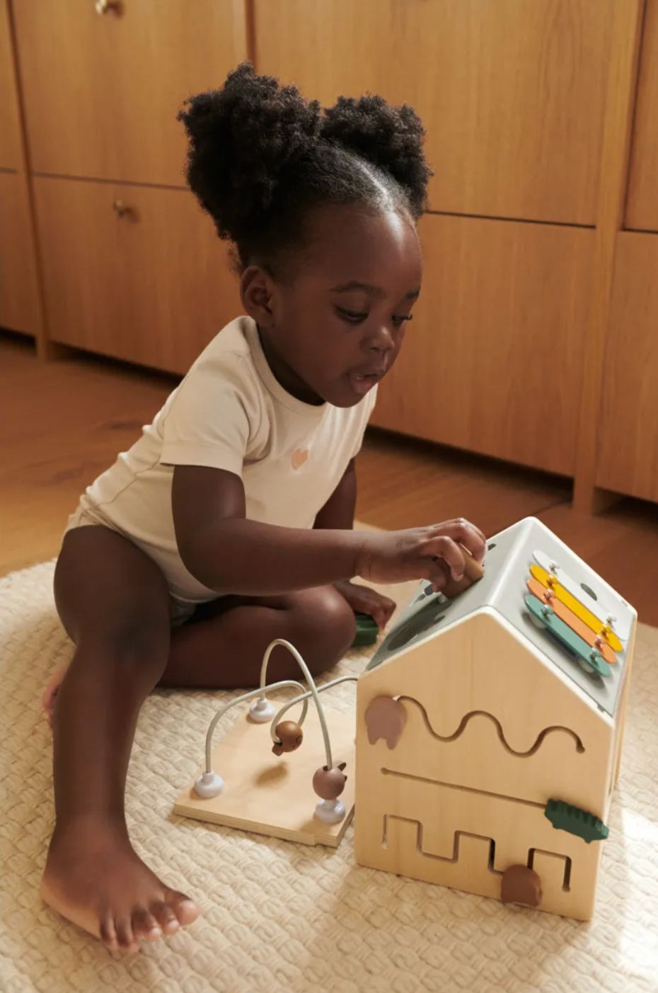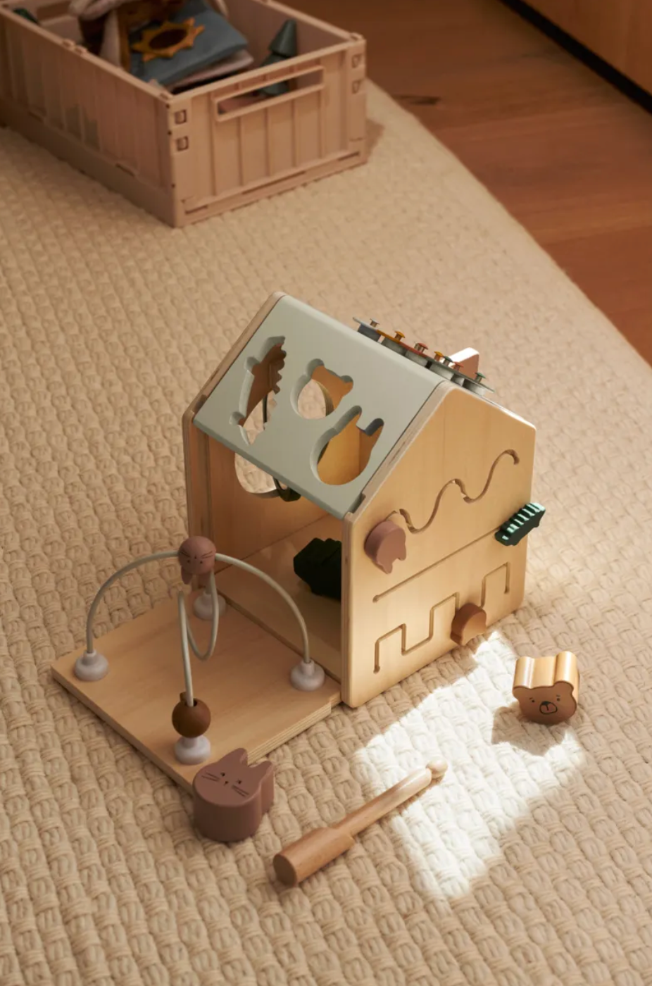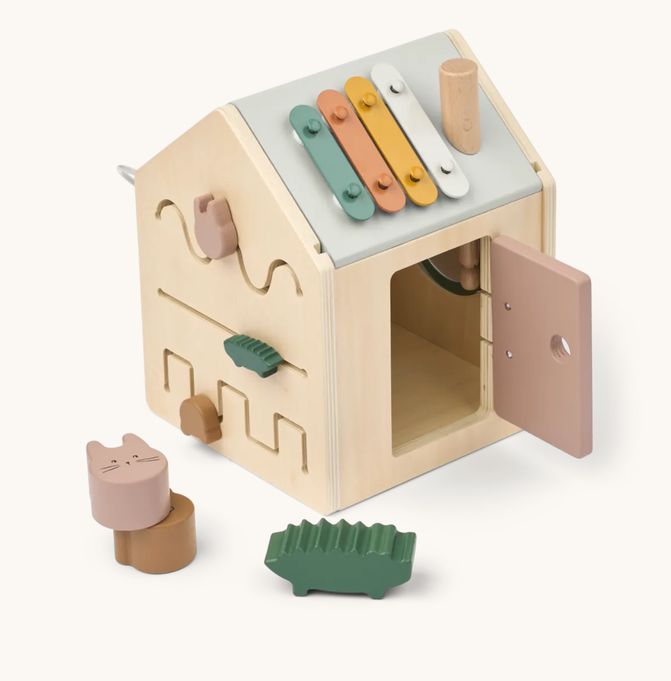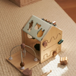 En forme d'une petite maison ludique, ce cube d'éveil en bois garantit des heures de plaisir pour les petits. Du xylophone sur le toit à la boîte à formes, en passant par le miroir rotatif, le labyrinthe de perles et la porte cachée, chaque côté offre une surprise. Conçu pour soutenir le développement de la motricité fine et éveiller la curiosité des plus petits.
