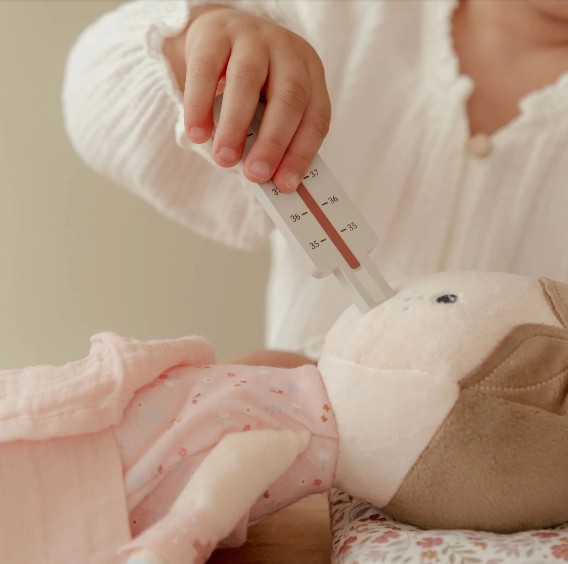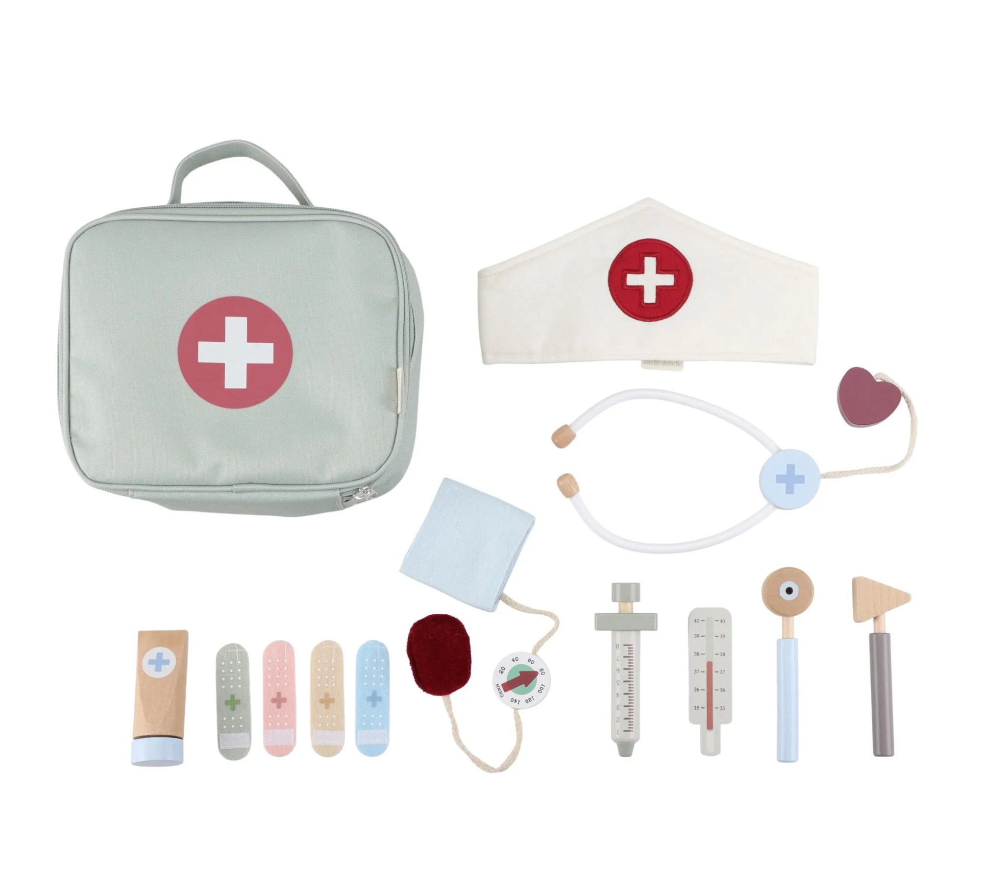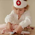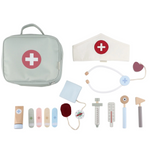 Docteur, pouvez-vous jeter un coup d'œil ? Avec cet ensemble médical complet en bois, votre mini est prêt à prendre soin des patients. La poche de médecin en tissu contient tous les dispositifs médicaux essentiels, tels qu'un thermomètre, une seringue, des pansements, un stéthoscope et un tensiomètre. Même un chapeau de médecin ne manque pas ! Parfait pour un jeu de rôle imaginatif et se familiariser avec les visites chez le médecin. Qui est le prochain patient ?