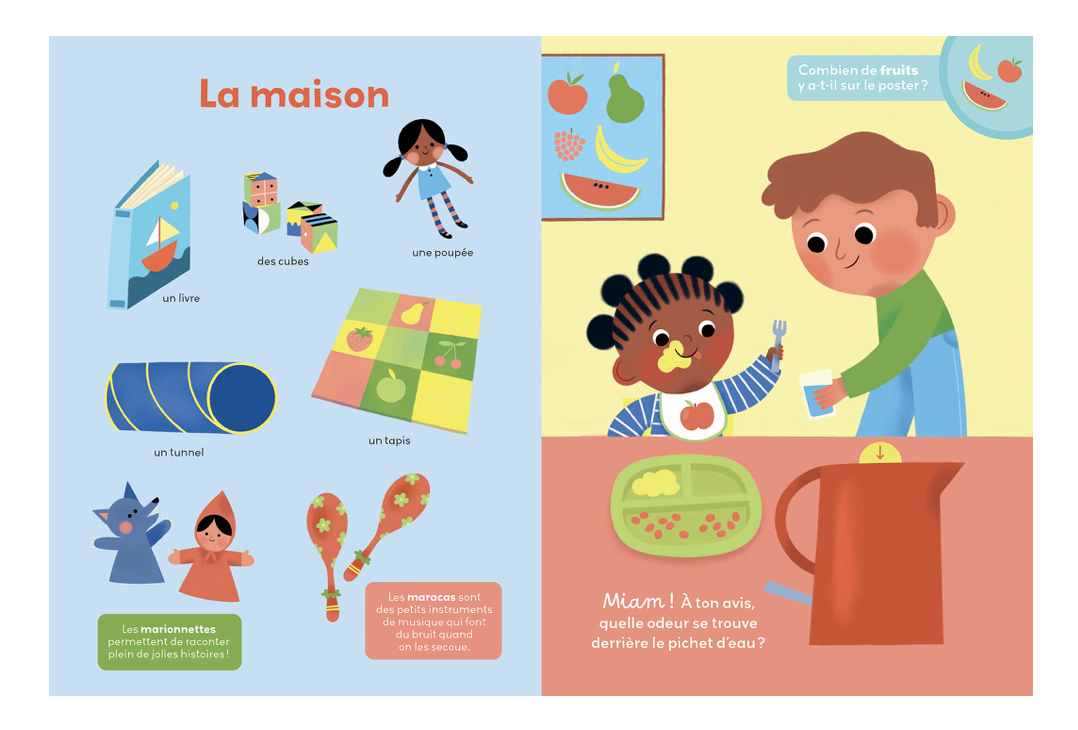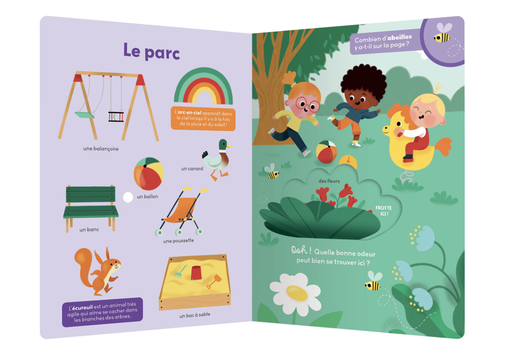 Sur chaque double-page, l'enfant pourra découvrir des informations étonnantes, jouer à compter des éléments (jusque 10) et entraîner sa motricité fine grâce à un grand flap qui cache une odeur amusante !