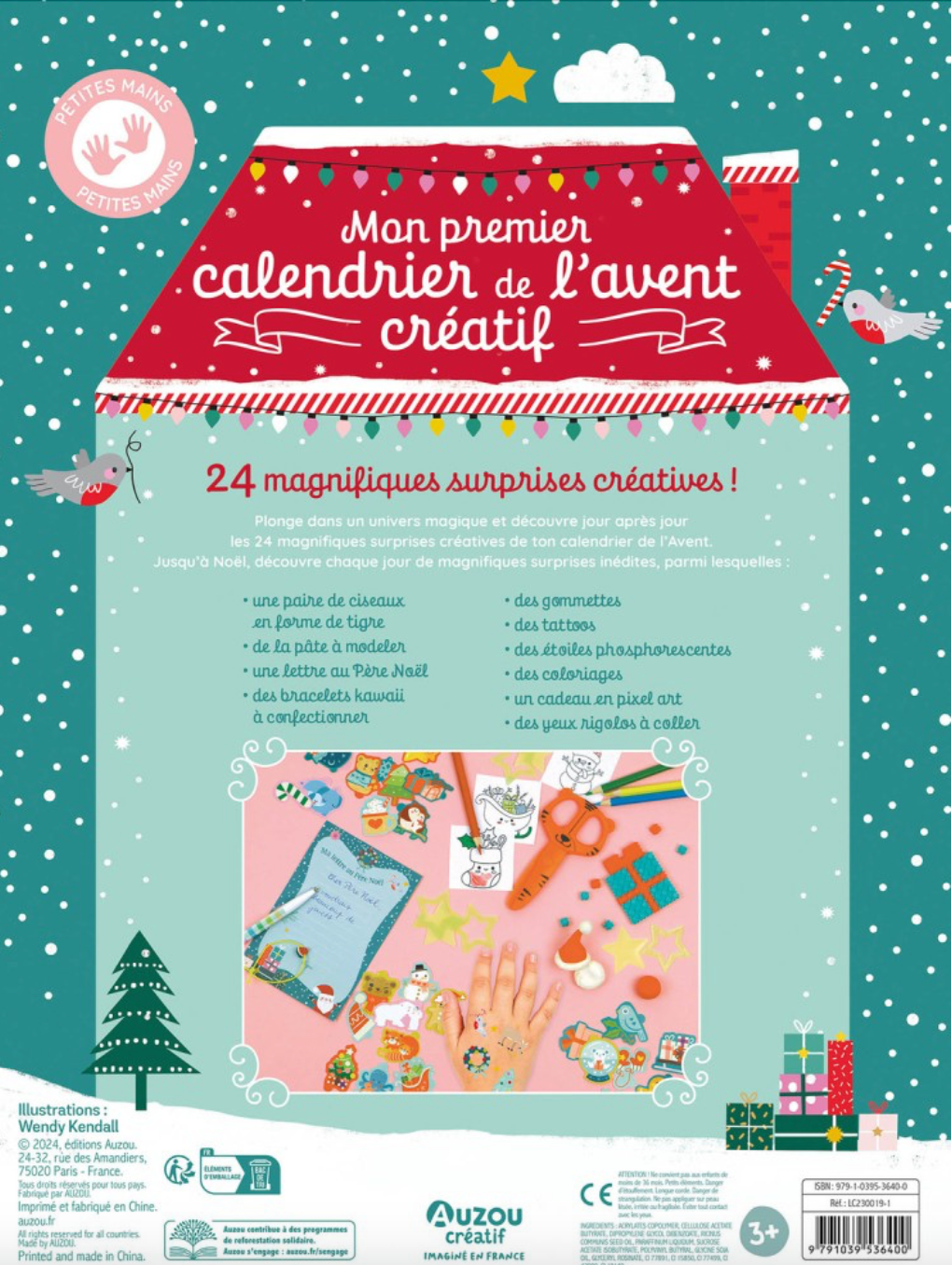 Cet adorable calendrier créatif propose 24 surprises originales et adaptées aux tout-petits. Ce grand calendrier magnifiquement illustré propose les activités favorites des enfants : de la pâte à modeler, des gommettes, des tattoos, des coloriages, mais aussi de belles surprises comme une paire de ciseaux adaptés aux tout-petits, une lettre au Père Noël à remplir, des bracelets kawaii ou encore des étoiles phosphorescentes à coller dans sa chambre !