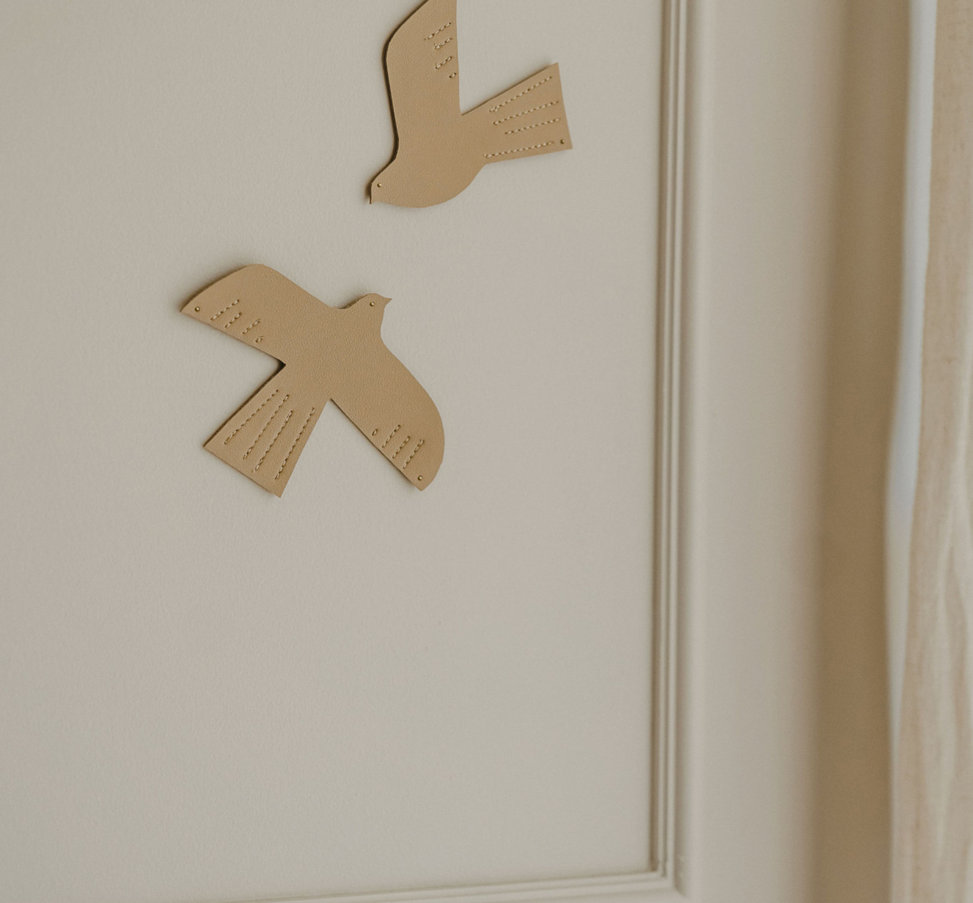 Un oiseau décoratif en cuir qui apporte une touche de poésie et de modernité à votre intérieur. Ses lignes délicates et ses détails cousus en font un objet unique, à la fois discret et raffiné. Idéal pour habiller le mur d’une chambre de bébé ou d'enfant, il se fixe facilement grâce aux trois clous dorés fournis et peut être orienté selon vos envies