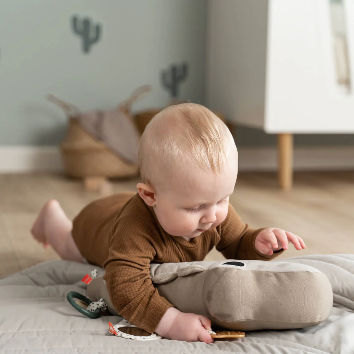 Faites plaisir à votre tout-petit pour l'heure du ventre avec l'ami cool Deer friend, Croco. Le coussin crocodile pour l'heure du ventre dans le sable aidera à renforcer le cou et le dos de votre bébé tout en profitant des jeux sensoriels.