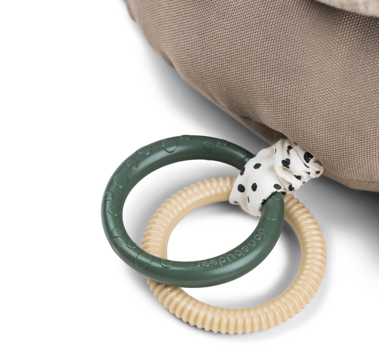 • Tissu : 100% polyester. Rembourrage : 100 % de fibres de polyester, sac de sable de quartz. Anneau de dentition : 100% TPE. Anneaux : 100% PP.