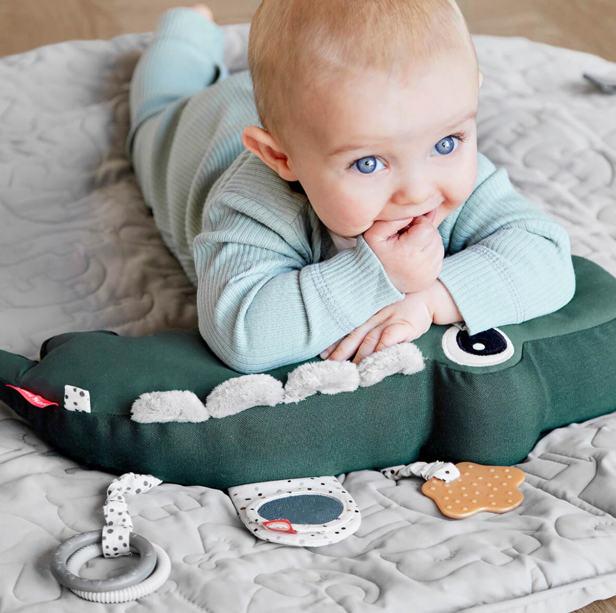 Faites en sorte que votre tout-petit soit excité pour l'heure du ventre avec le cool Crocodile, Croco. Le coussin vert pour l'heure du ventre aidera à renforcer le cou et le dos de votre bébé tout en profitant des jeux sensoriels.