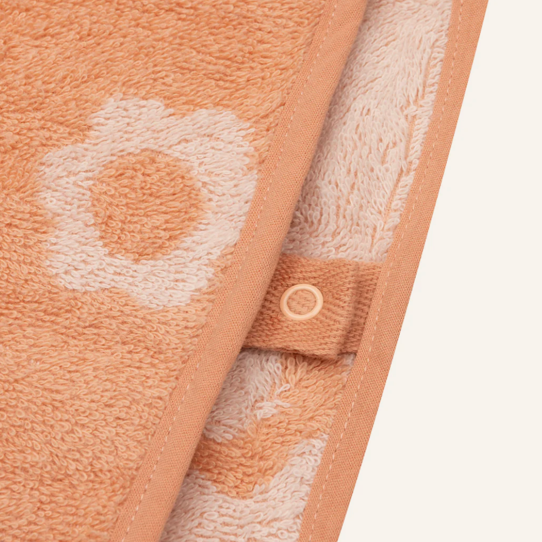 En éponge, il s'enfile facilement et couvre la tête pour ne pas attraper froid avec les cheveux mouillés. Les pressions sous les bras permettent de le maintenir bien en place.