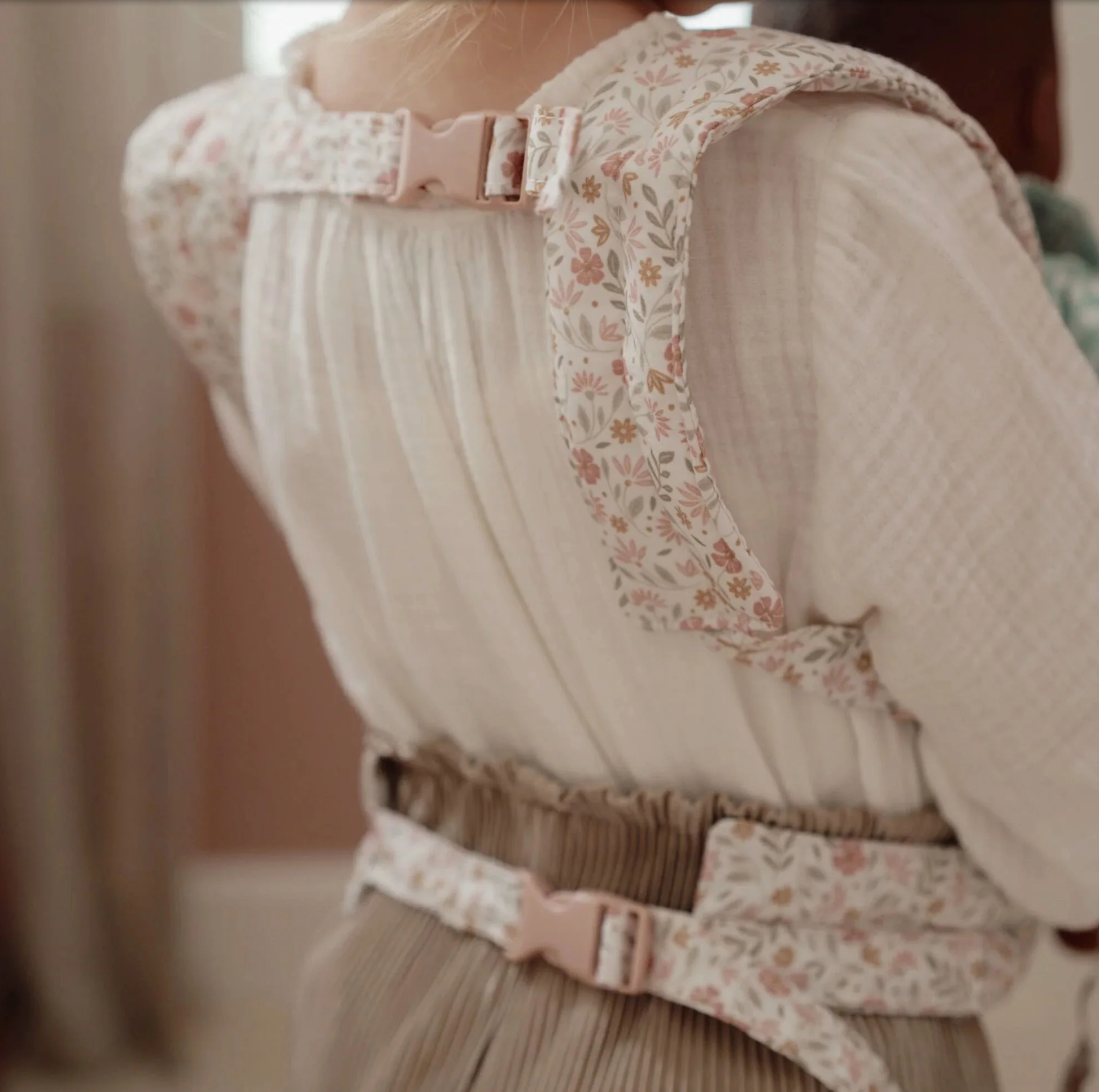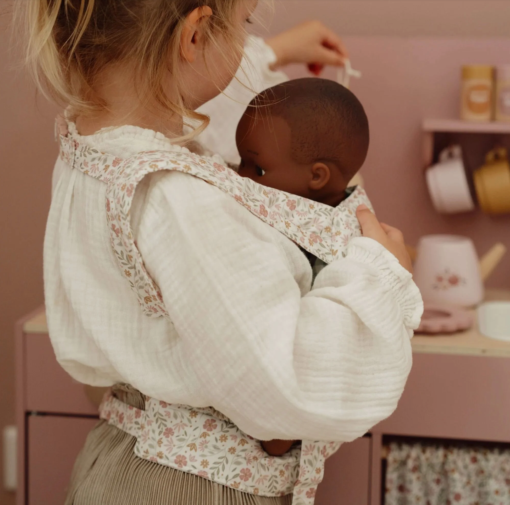 Comme les vrais parents, votre mini porte sa poupée dans son porte-bébé au joli motif floral. Facile à utiliser grâce à ses bretelles réglables, la poupée sera bien en place contre votre mini.