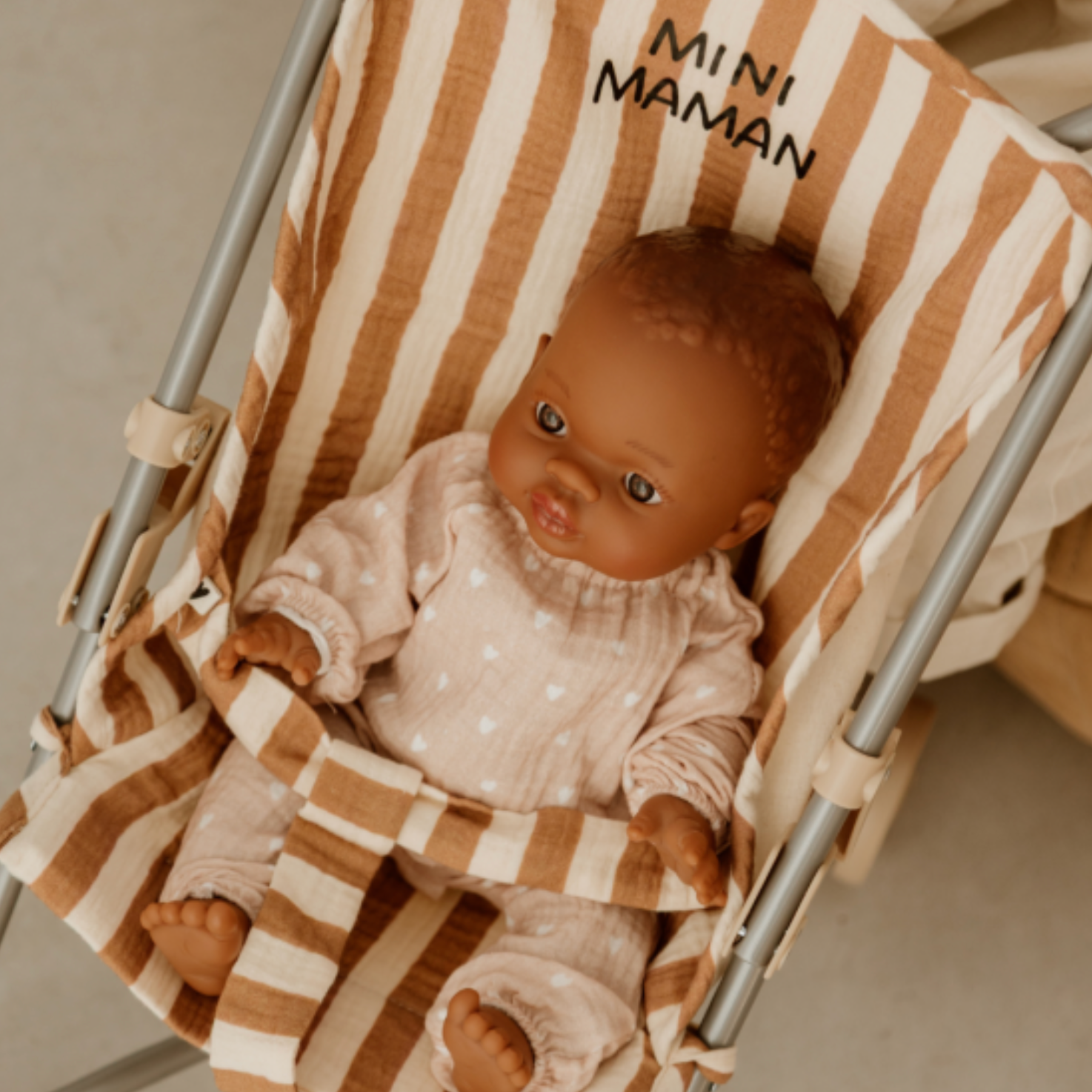 Adorable poussette pour les peluches et poupées de votre mini. La poussette dispose d'un harnais, d'un sac de transport et de roues doubles sur les quatre pieds pour plus de stabilité.