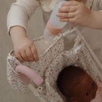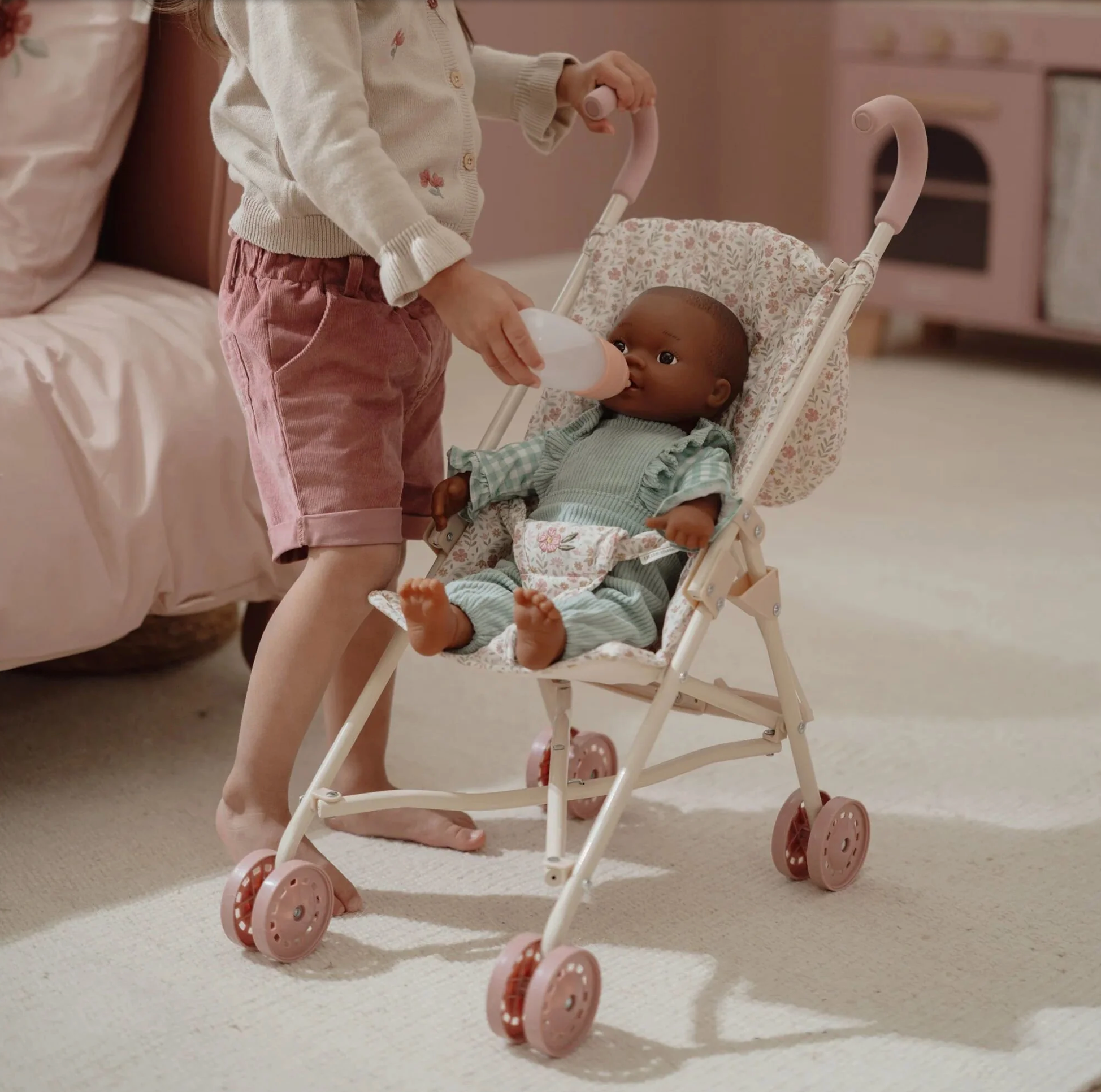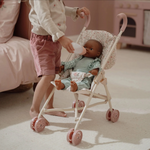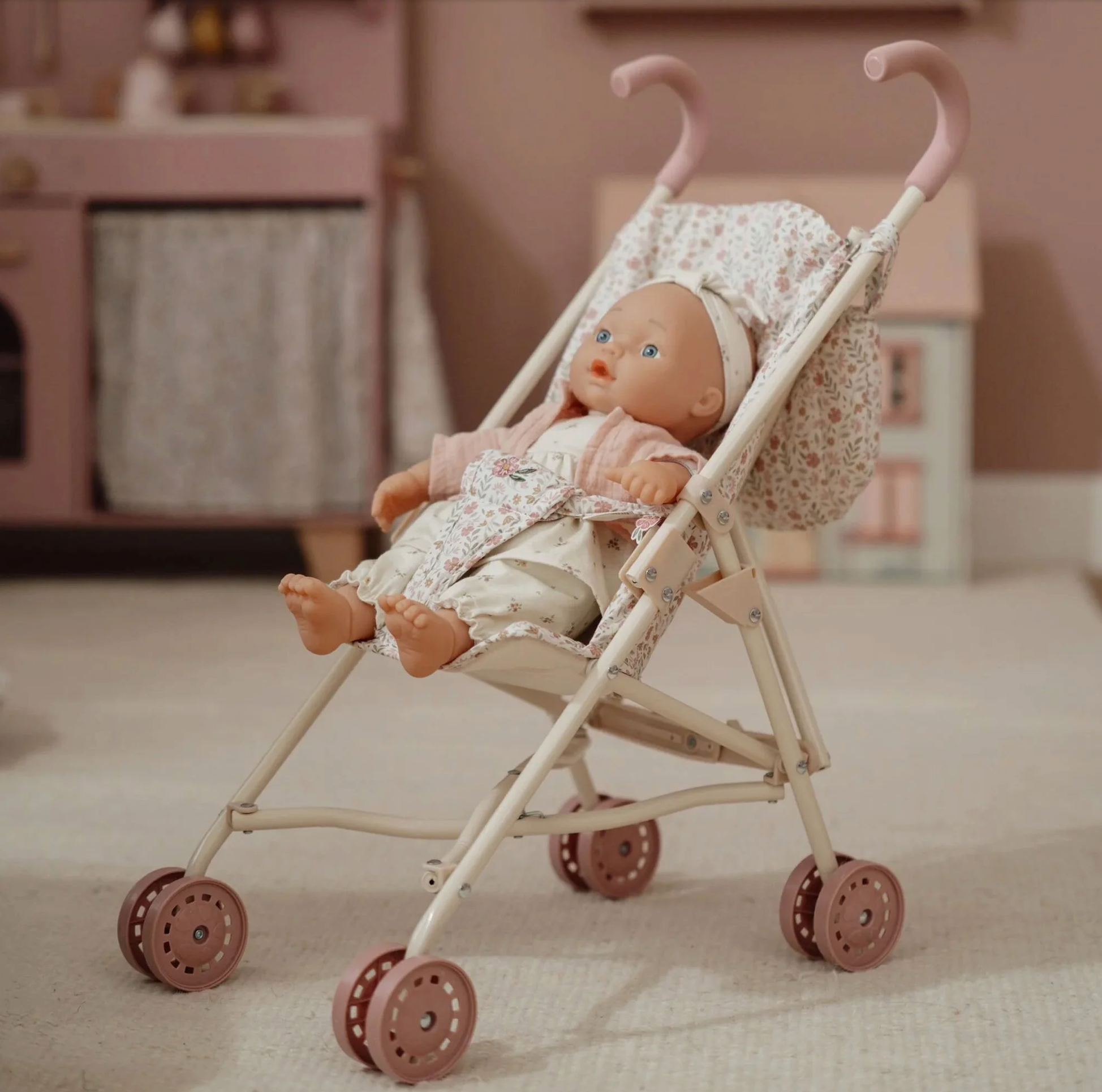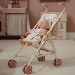 Adorable poussette pour les peluches et poupées de votre mini. La poussette dispose d'un harnais et de roues doubles sur les quatre pieds pour plus de stabilité.