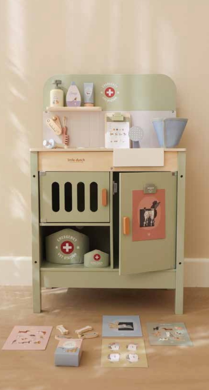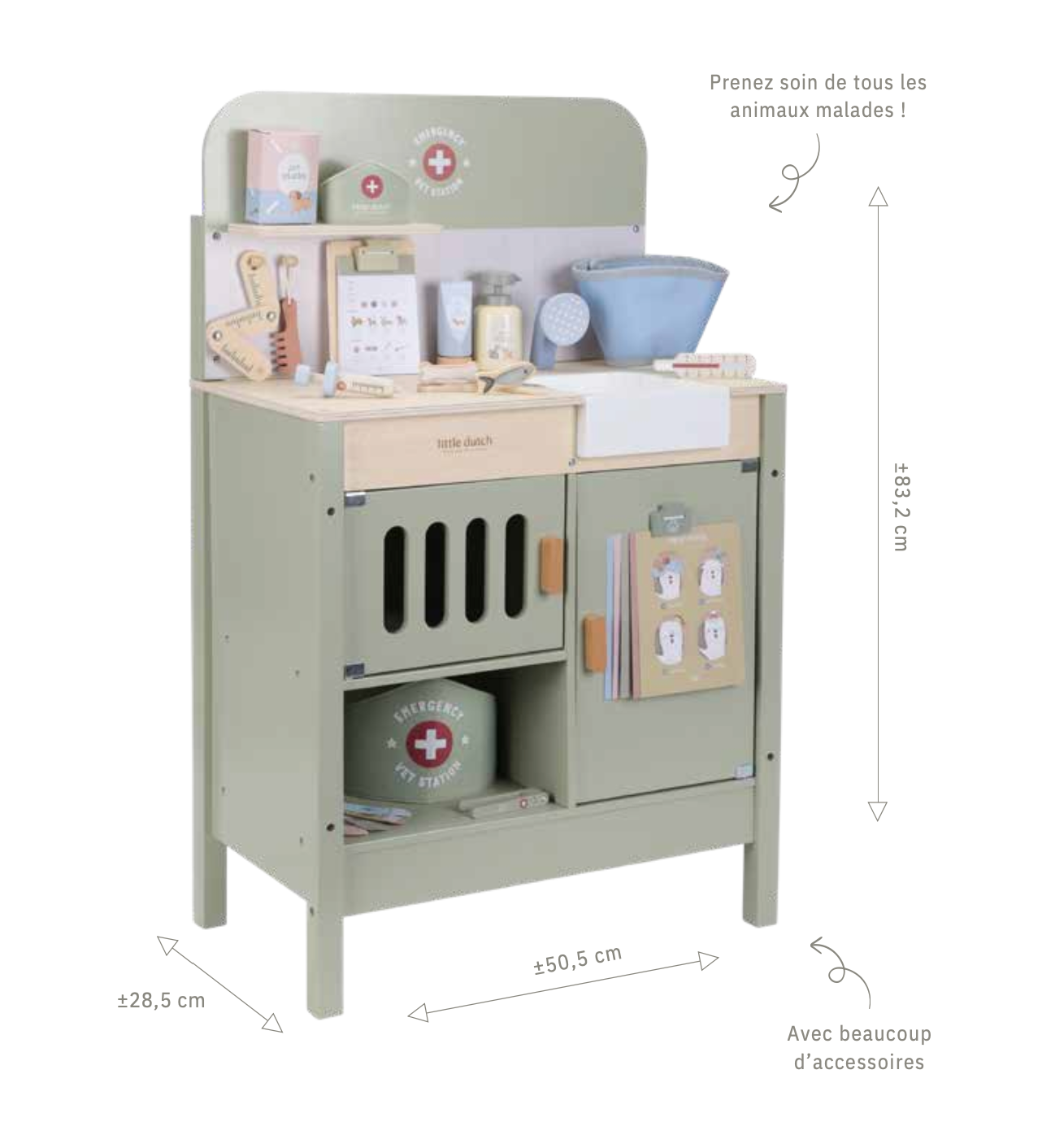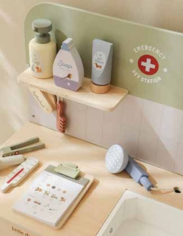 Un espace de jeu pour petits soignants ! Cette clinique vétérinaire en bois offre un espace de jeu immersif pour soigner les animaux en peluche et les compagnons malades. Conçue pour encourager le jeu de rôle, elle comprend de nombreux accessoires : un pommeau de douche rétractable avec lavabo, un peigne, un thermomètre, une seringue, des bandages, un bandeau en tissu, ainsi qu’un clip pour afficher des illustrations médicales et des radiographies. Un environnement idéal pour les jeunes vétérinaires en herbe.