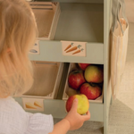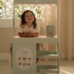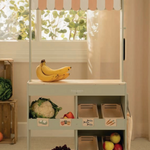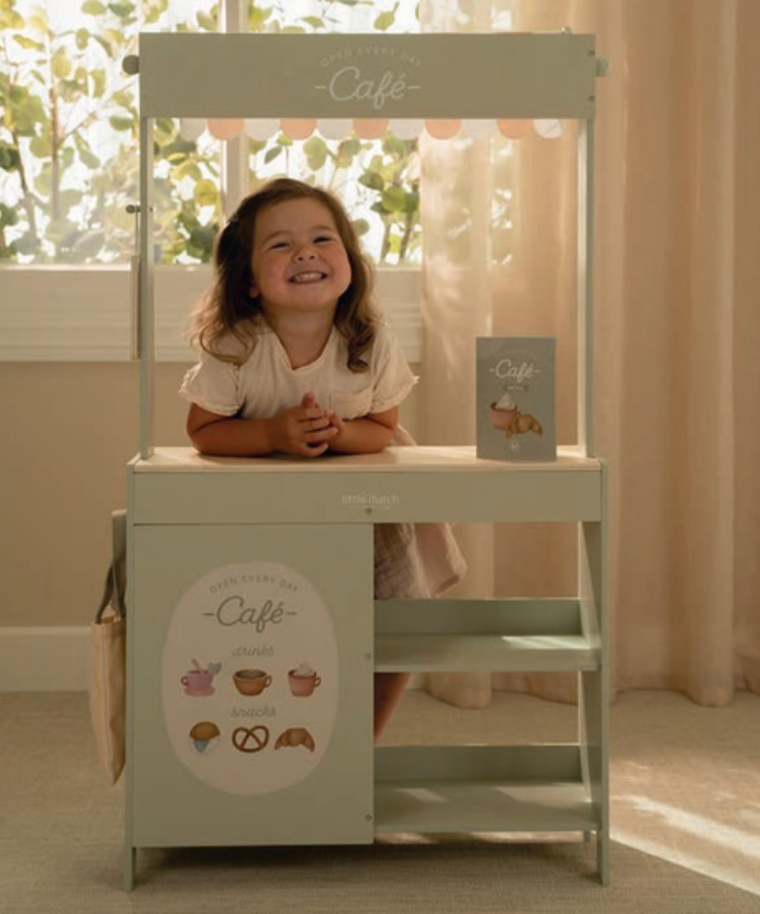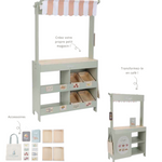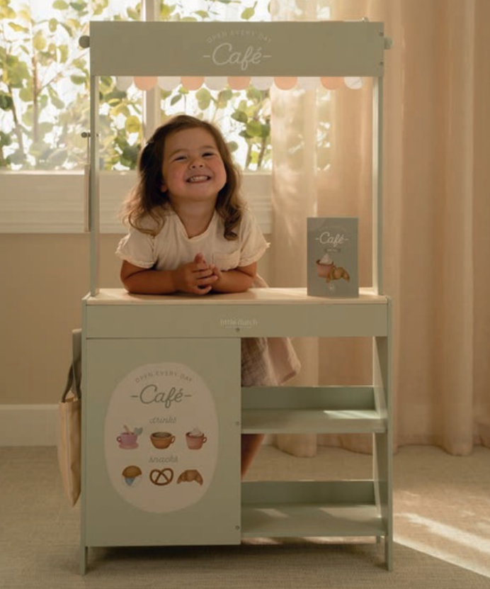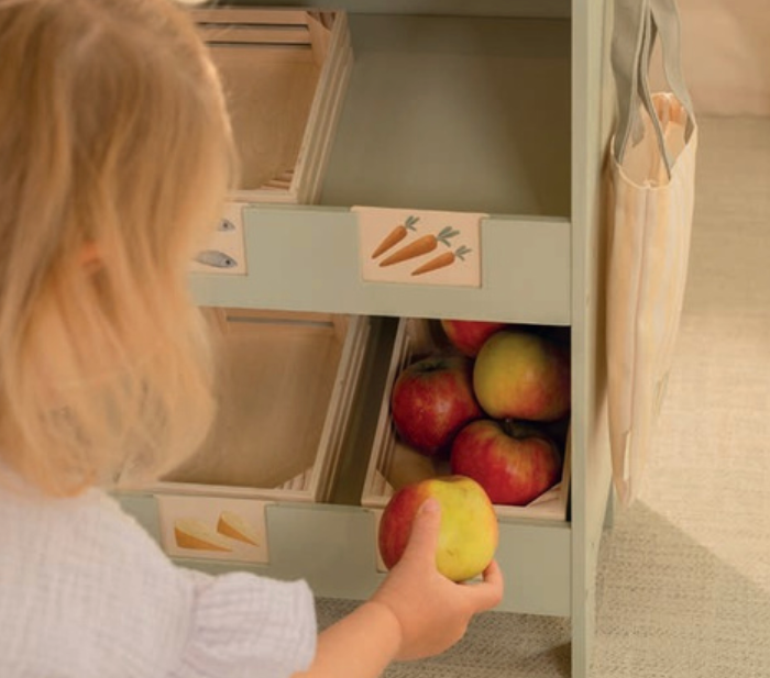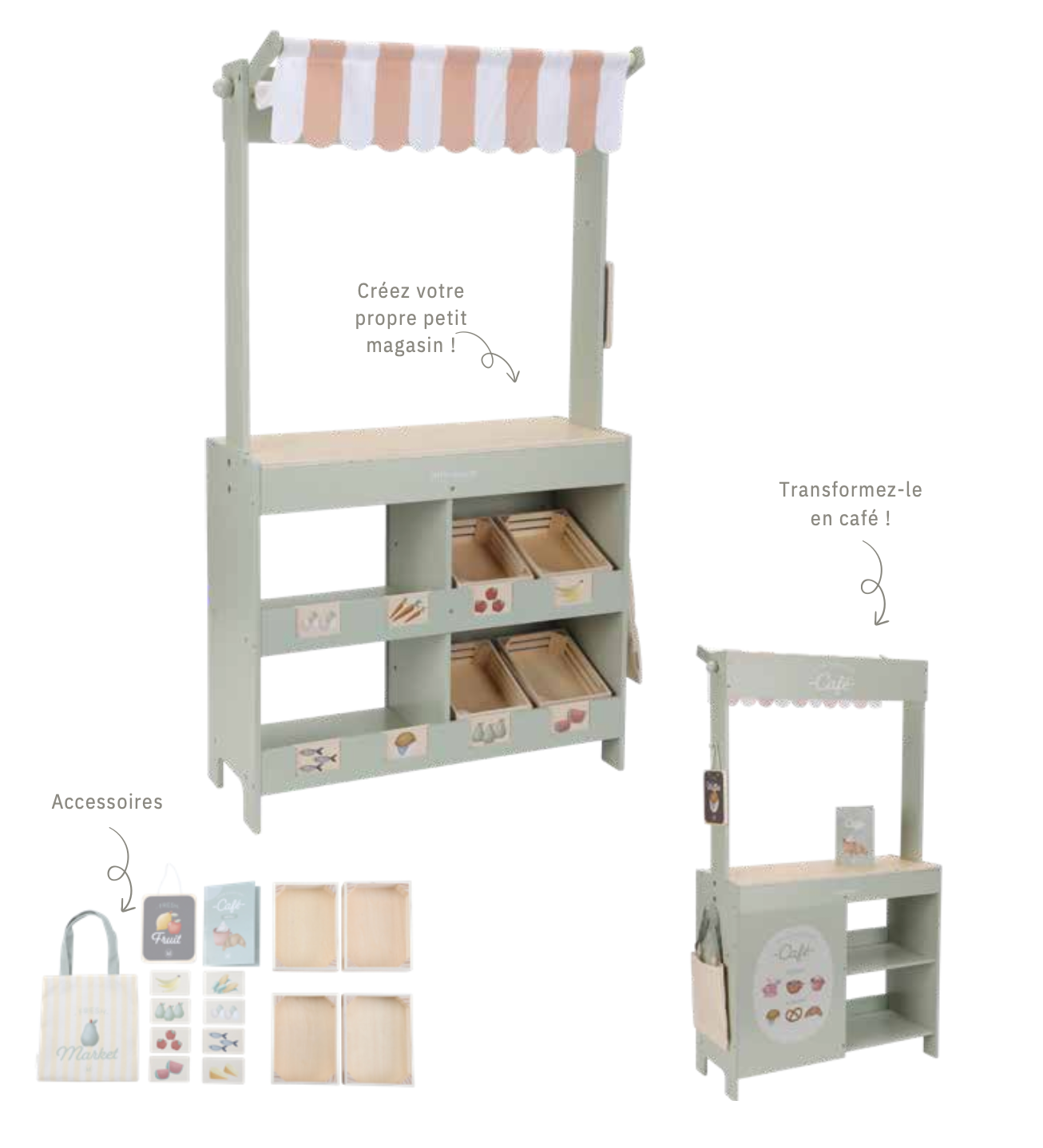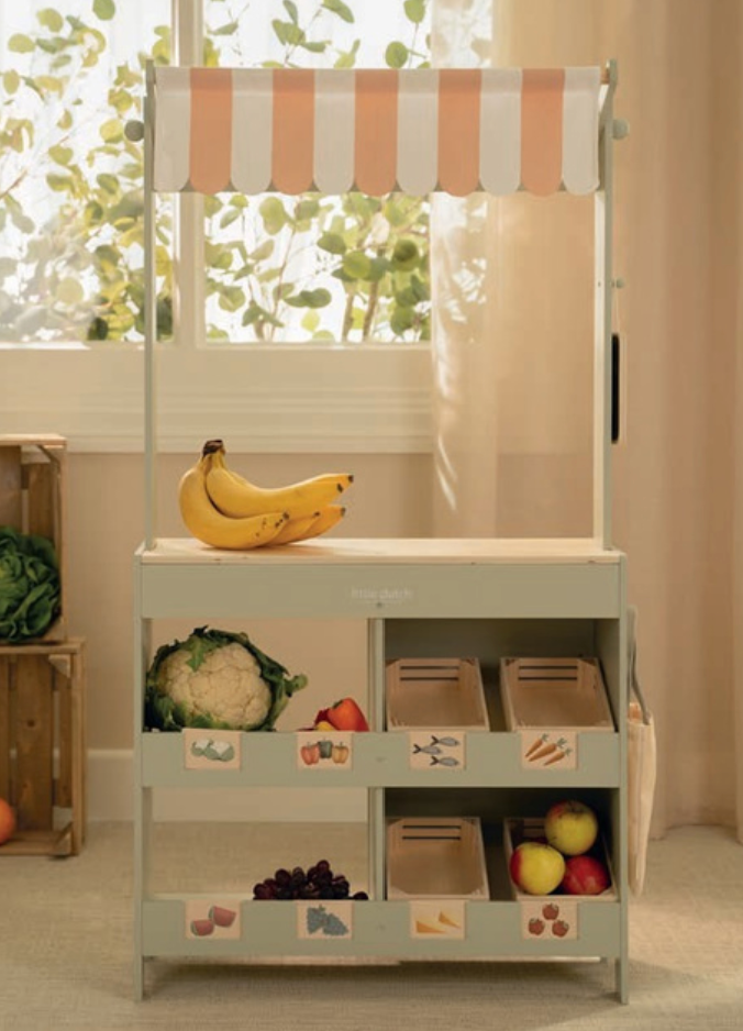 Le marché des petits commerçants ! Avec ce magnifique étal en bois, les enfants peuvent jouer à la marchande dans leur propre petit magasin. L’auvent en tissu crée une atmosphère authentique, tandis que le tableau noir et les cartes illustrées permettent de présenter joliment les produits. L’ensemble comprend également un sac à provisions et des caisses pour une expérience d’achat complète.