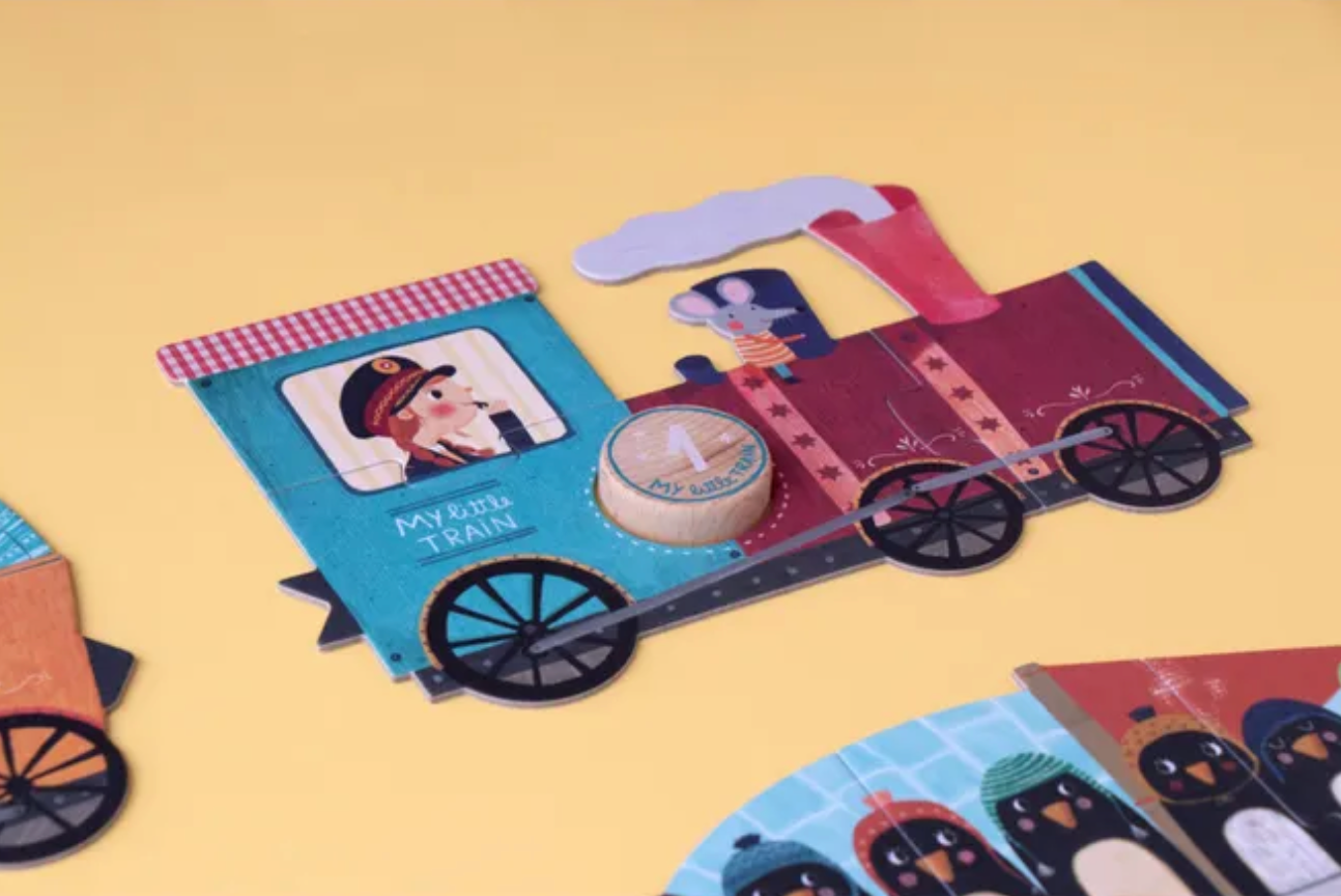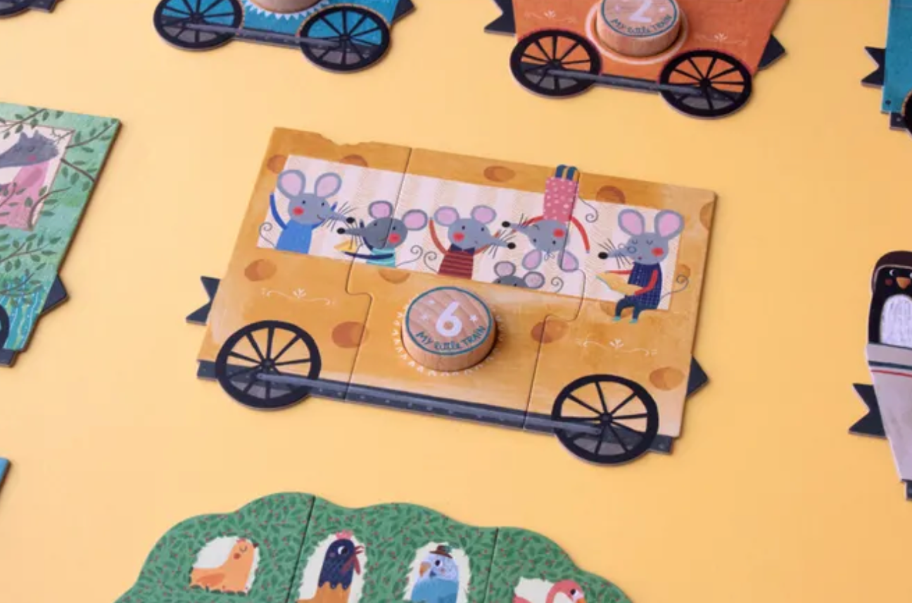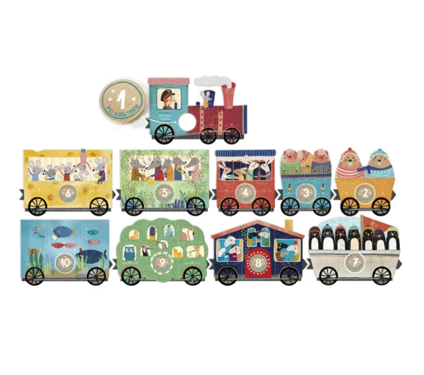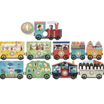 10 puzzles en forme de wagons de train à 3 pièces avec une pièce de bois emboîtable pour chacun d'eux.