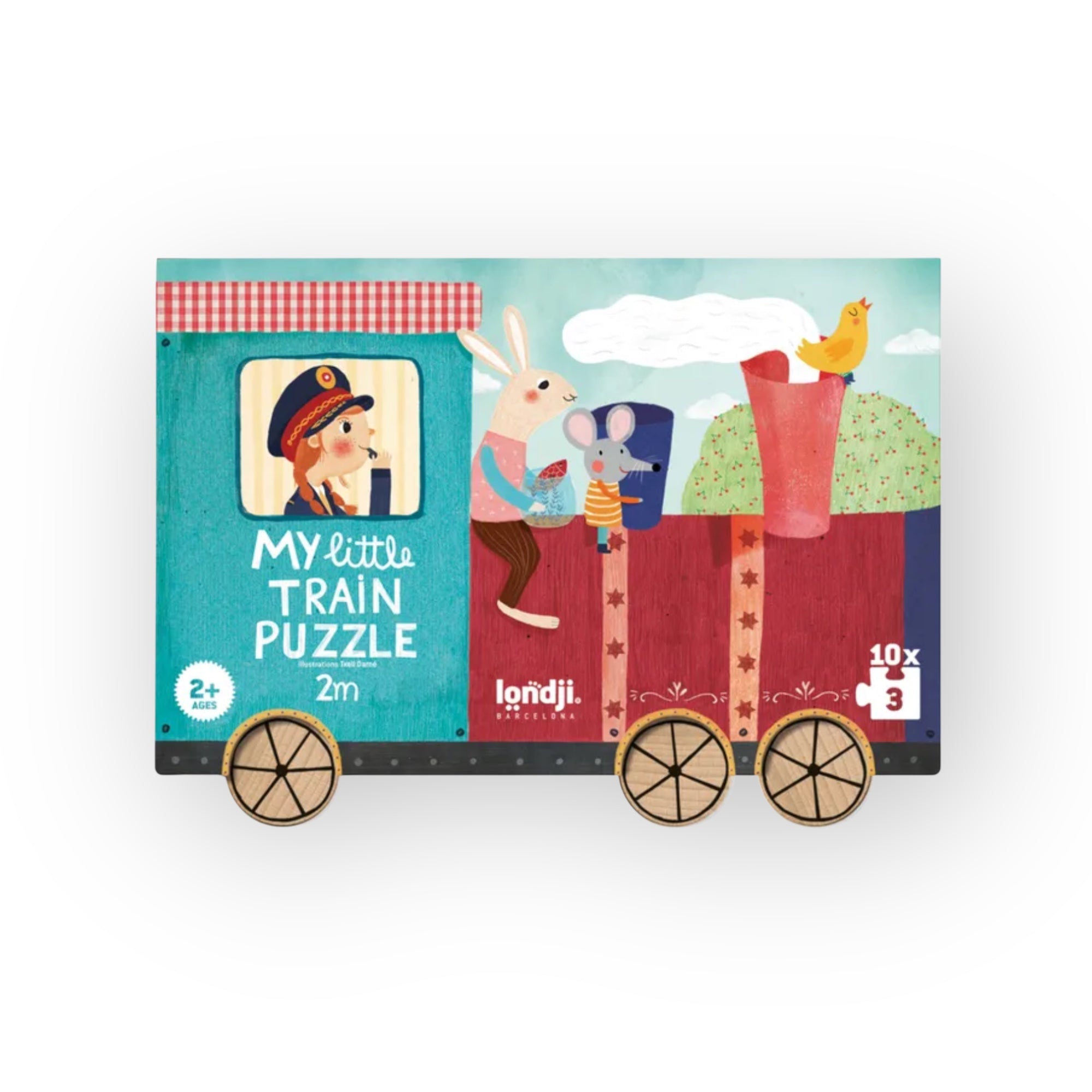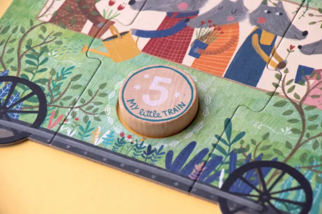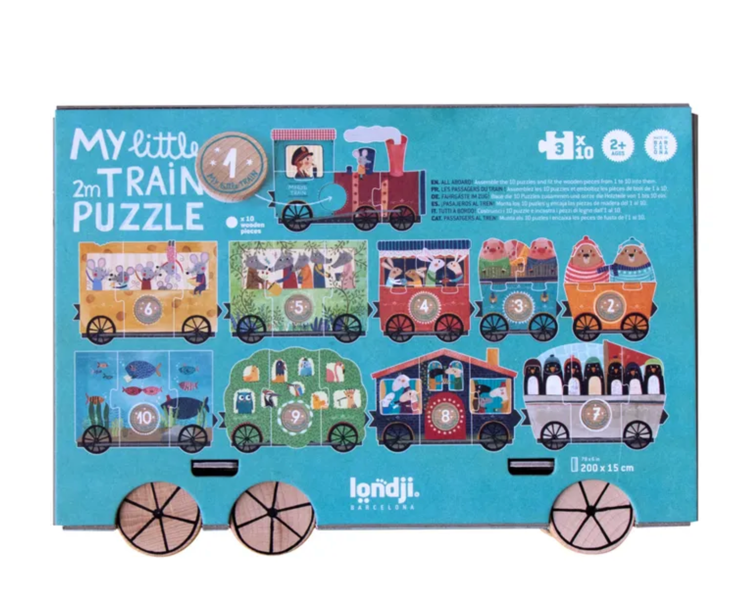10 puzzles en forme de wagons de train à 3 pièces avec une pièce de bois emboîtable pour chacun d'eux.