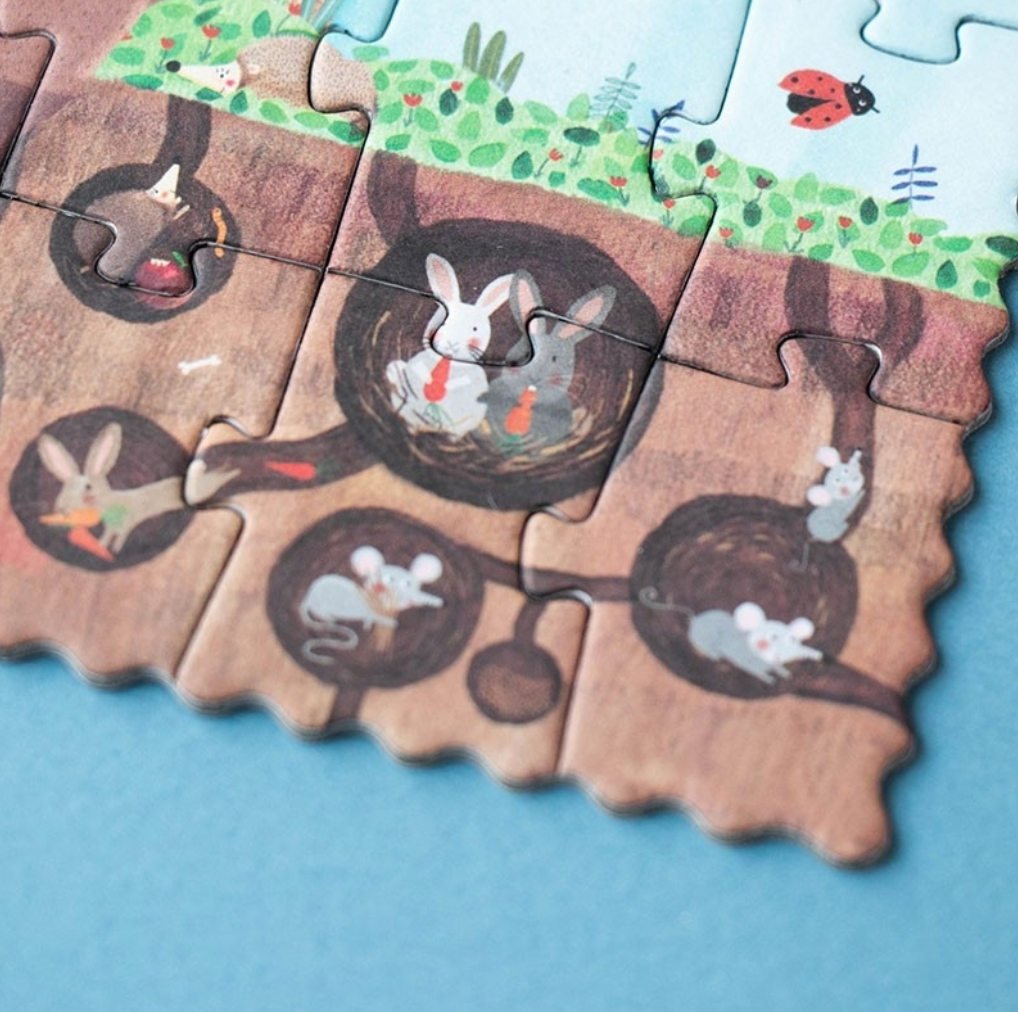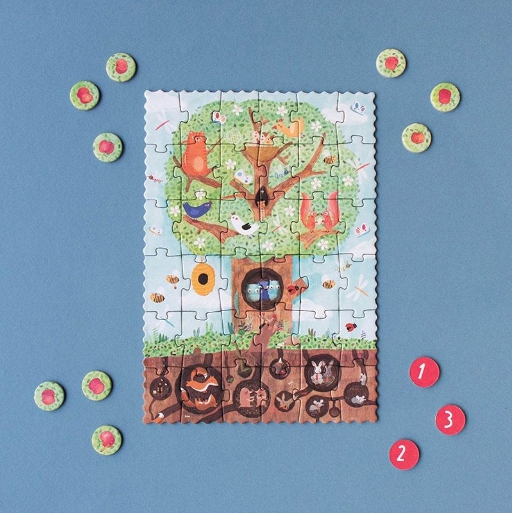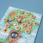 Un petit puzzle de 36 pièces qui inclut aussi 12 pièces pour apprendre à compter. Un jouet éducatif, responsable et local. Format poche, idéal pour les voyages.