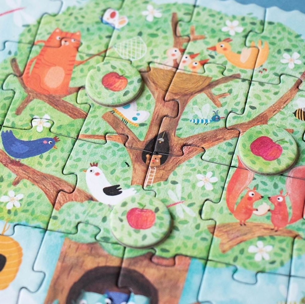 Assemblez le puzzle, puis cherchez toutes les fleurs du pommier qui deviendront des pommes, et apprenez à compter tout en vous amusant !