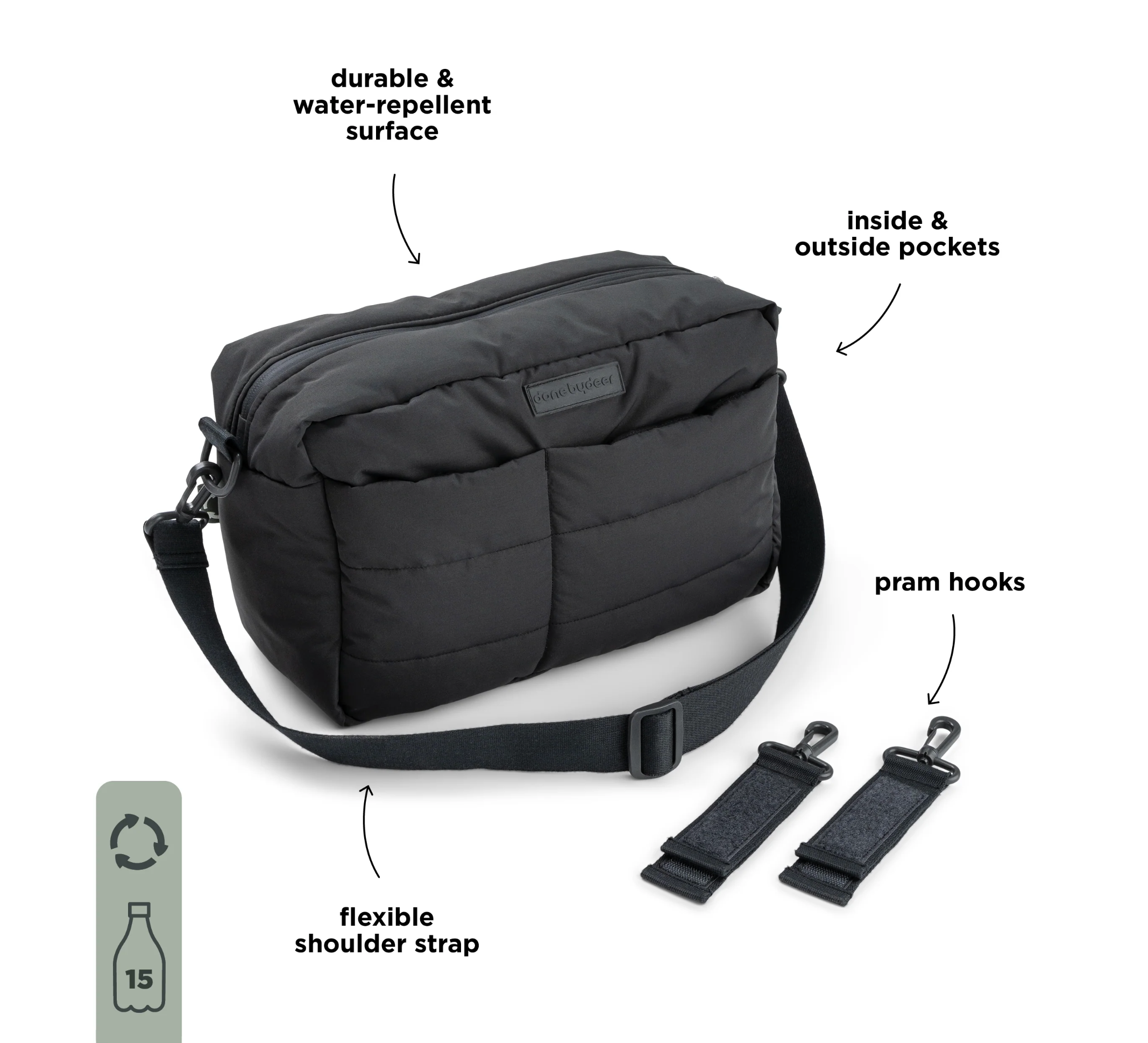 Attachez le sac à la poussette à l'aide des crochets inclus ou portez-le à l'épaule grâce à la bandoulière ajustable. Ainsi, vous gardez les mains libres, que vous apaisiez un bébé fatigué ou surveilliez un bambin plein d'énergie.