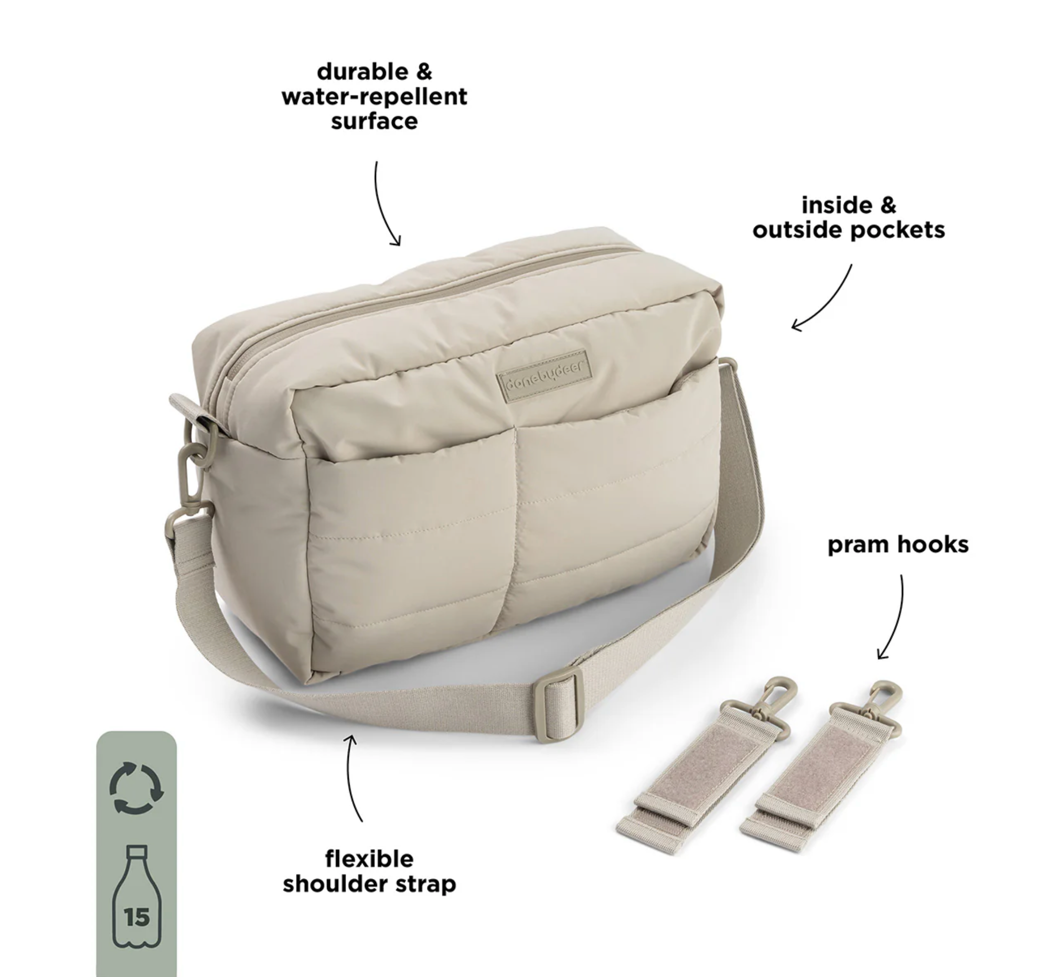 Fabriqué en polyester recyclé et résistant à l'eau, ce sac est idéal pour toutes vos virées au grand air et garde les affaires de bébé à l'abri et au sec, où que vous alliez. Léger, pratique et stylé — optez pour ce sac de poussette en teinte sable.