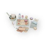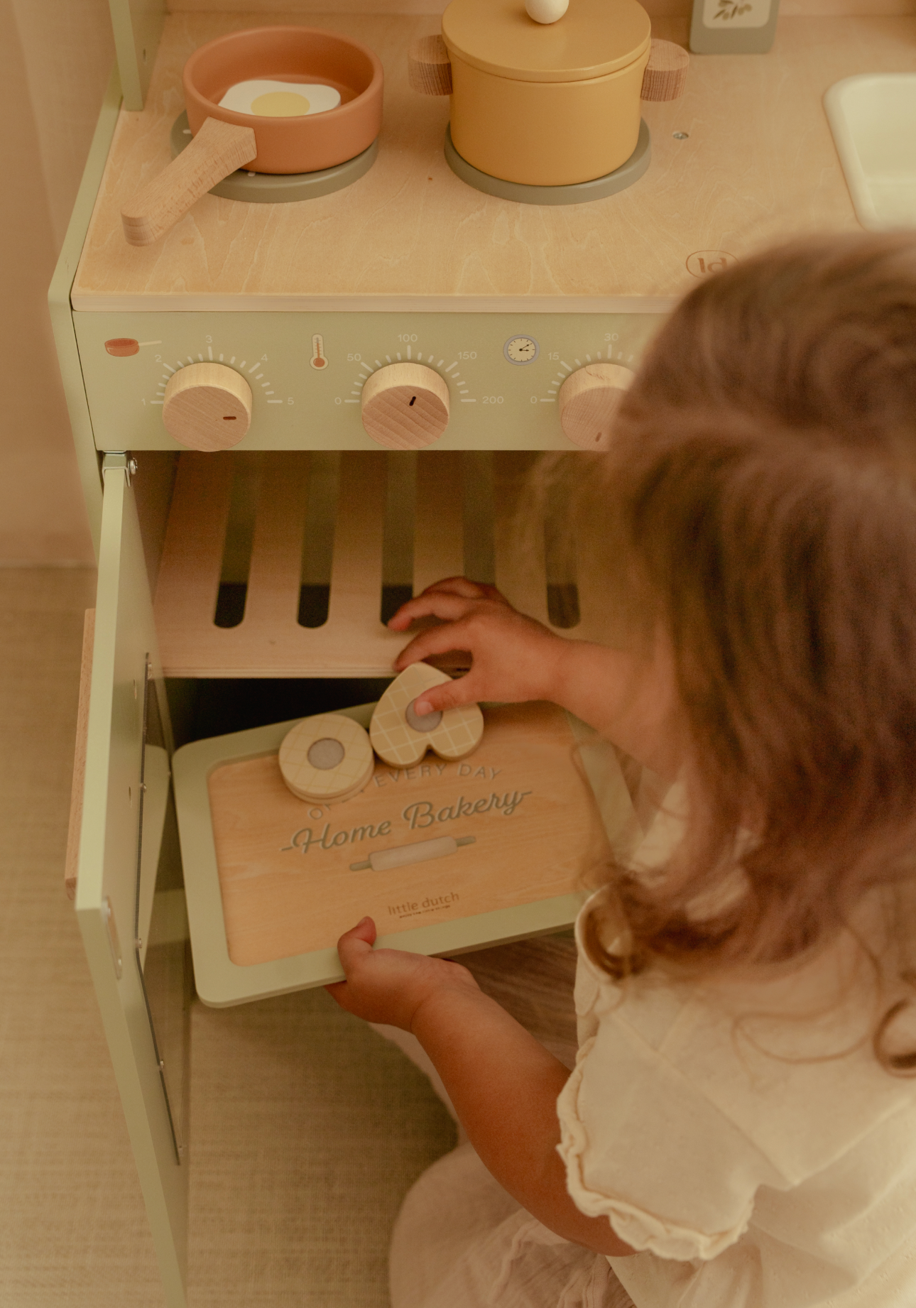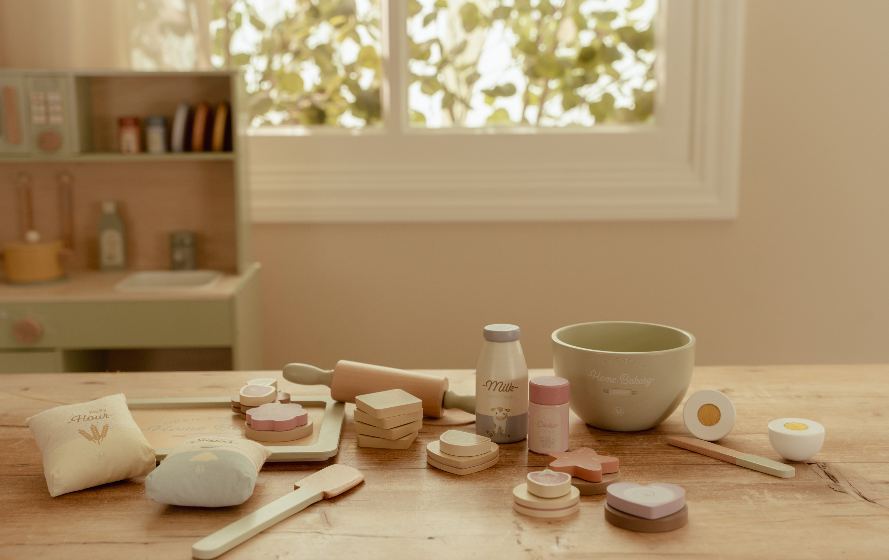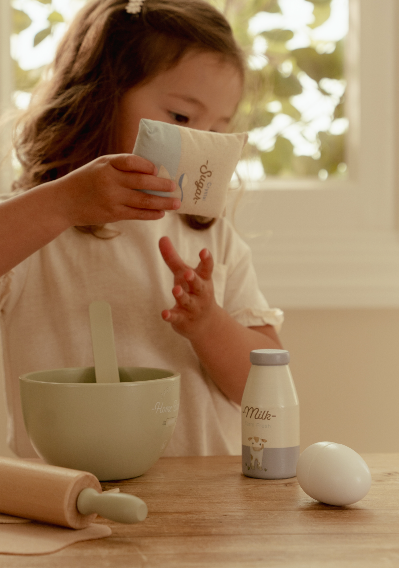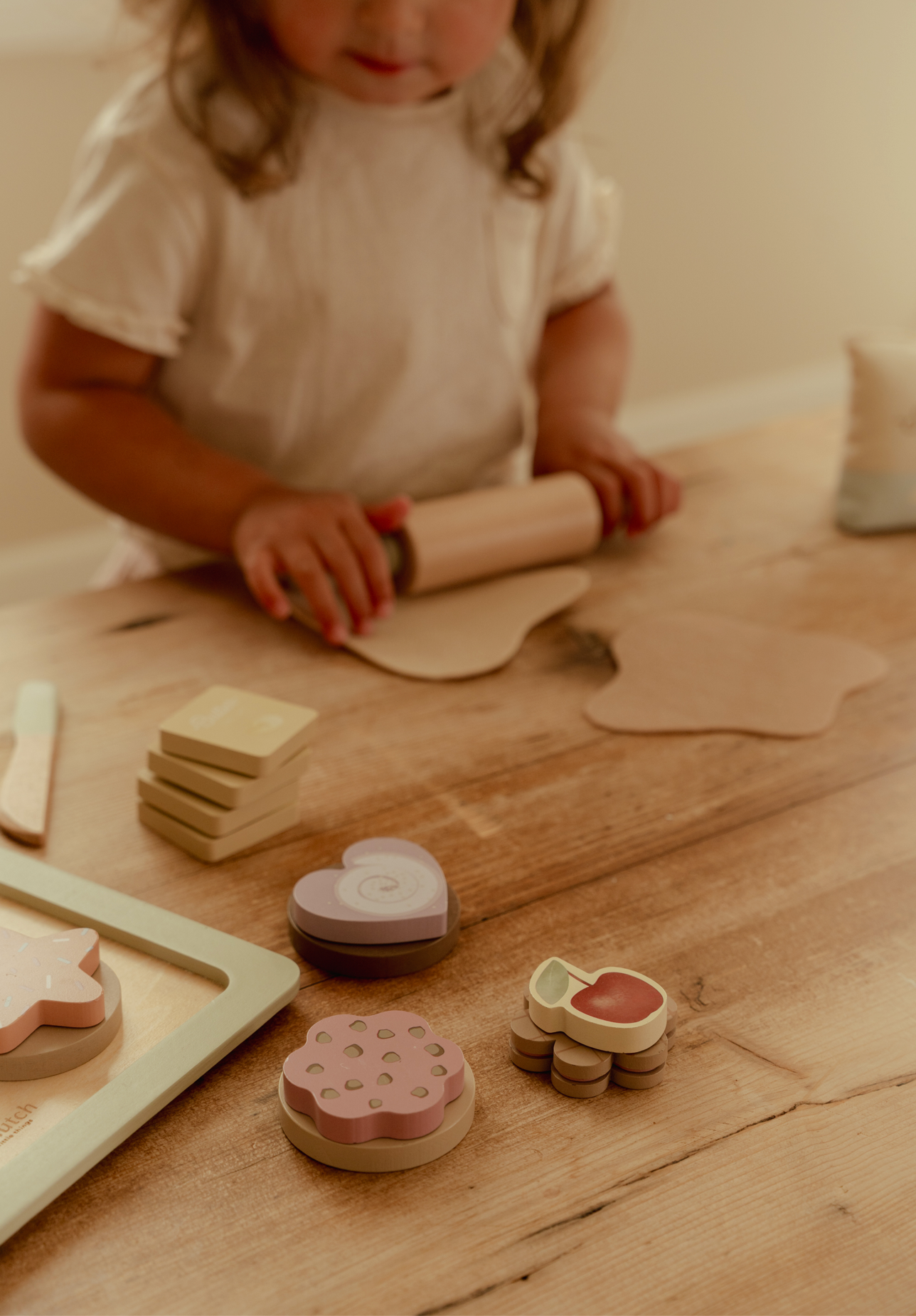 Il est temps de cuisiner quelque chose de délicieux ! Avec cet ensemble de pâtisserie en bois, les petits boulangers apprennent tout sur la préparation de délicieux biscuits et gâteaux. Le set comprend une carte de recettes et tous les accessoires nécessaires, tels qu'un bol de mélange, une plaque à biscuits, des garnitures, un œuf, du beurre, de la farine, du sucre, du lait et même des vermicelles colorés. Étalez la pâte en feutre avec le rouleau à pâtisserie et décorez les biscuits à votre guise. Le set parfait pour des heures de jeu sans fin dans la cuisine de jeu !