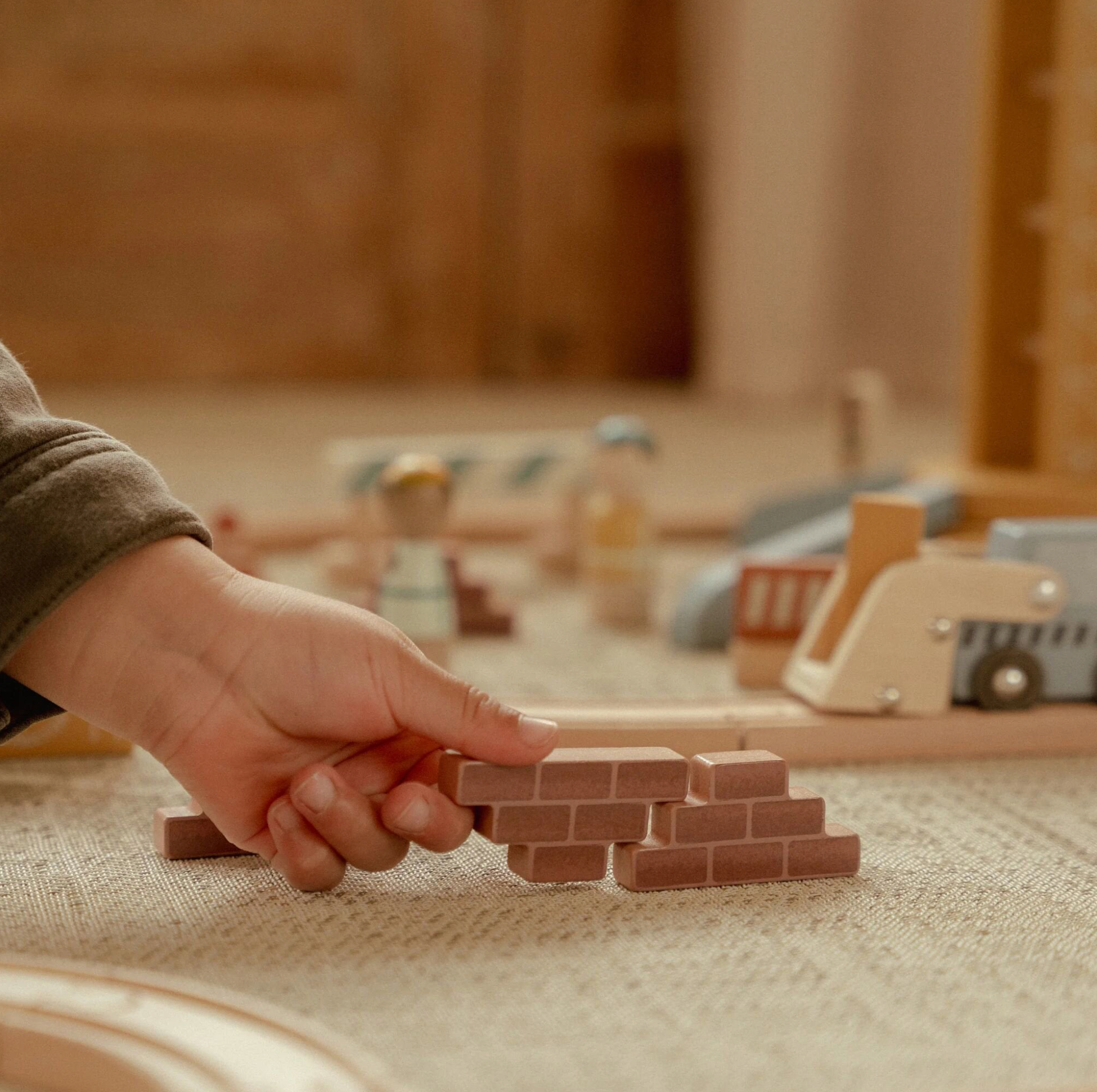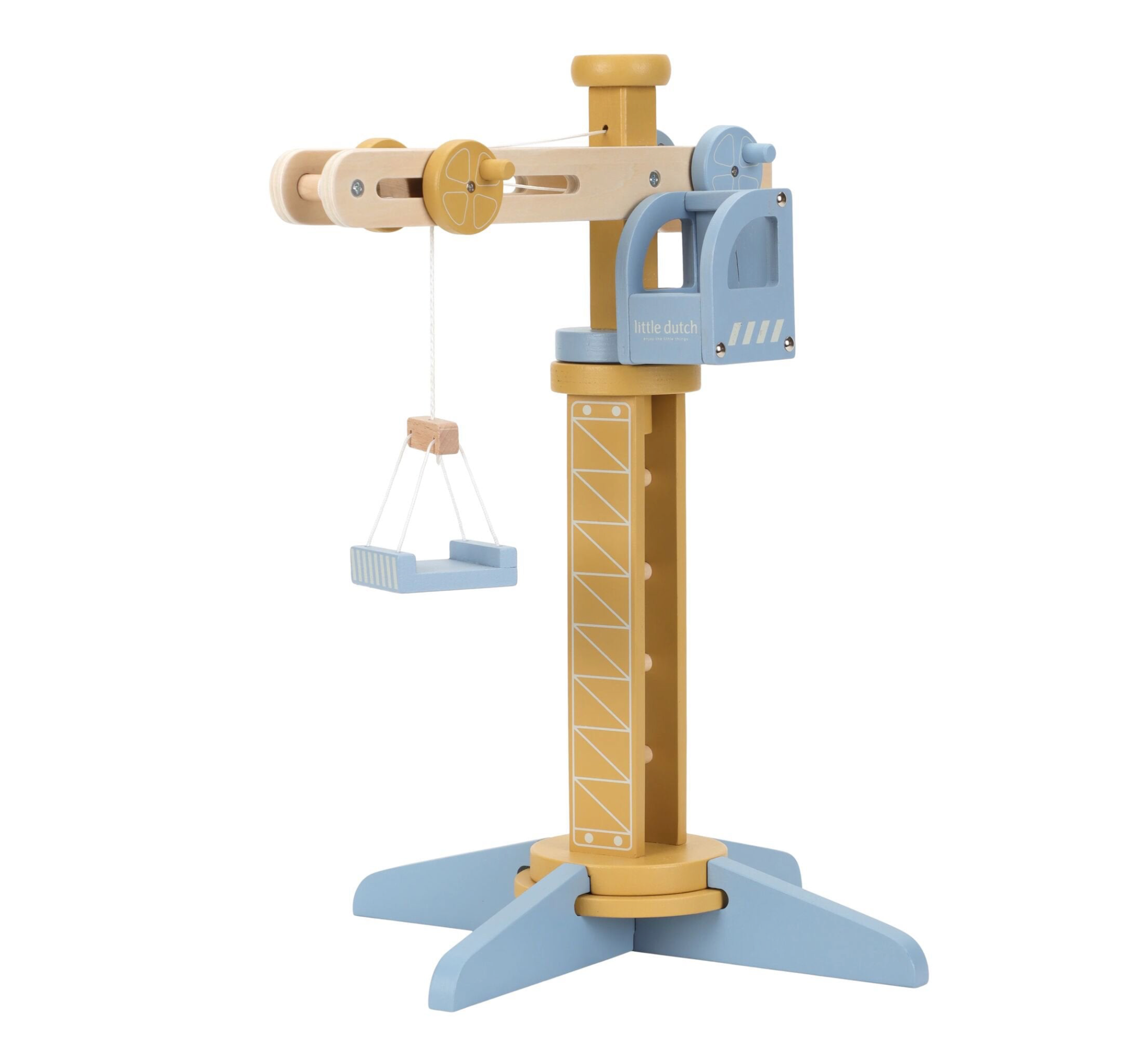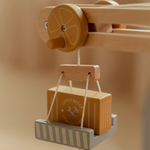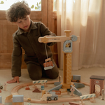 Construisez et déplacez ! Cette grue en bois soulève et abaisse des charges en toute sécurité. L’ensemble inclut des matériaux de construction, des véhicules, des ouvriers et des panneaux de signalisation. Idéal pour les petits constructeurs !